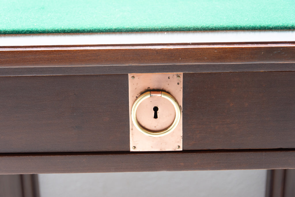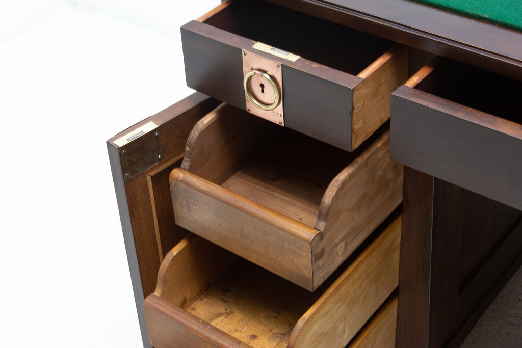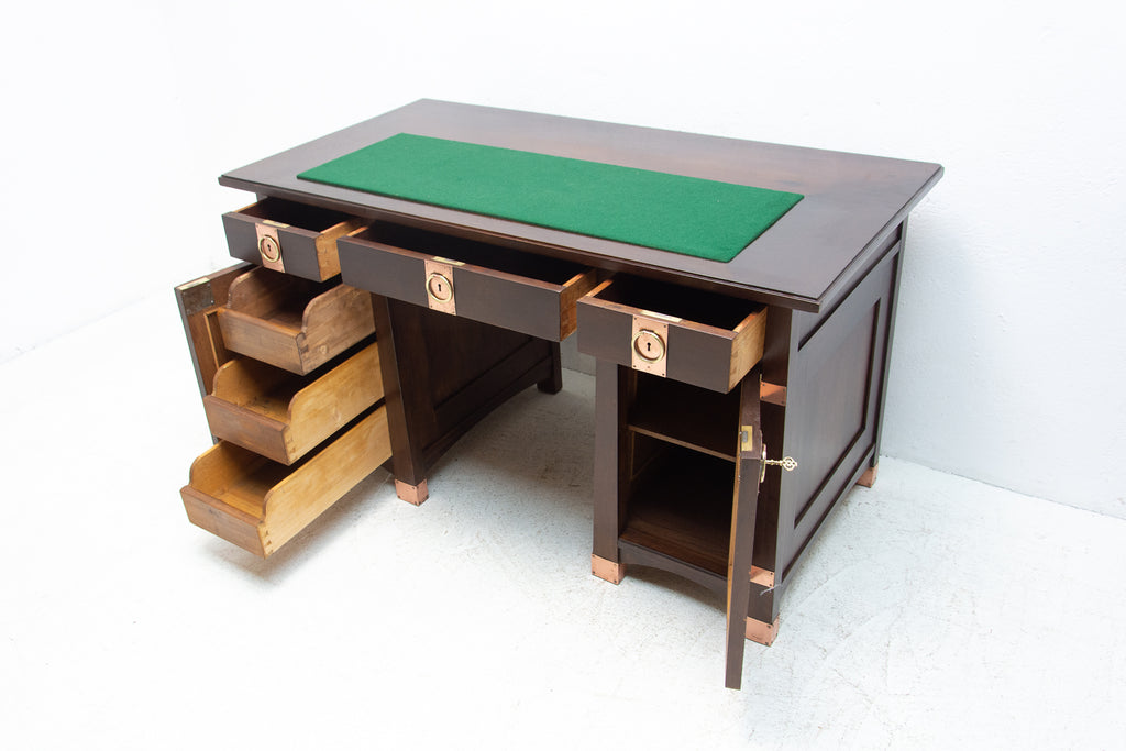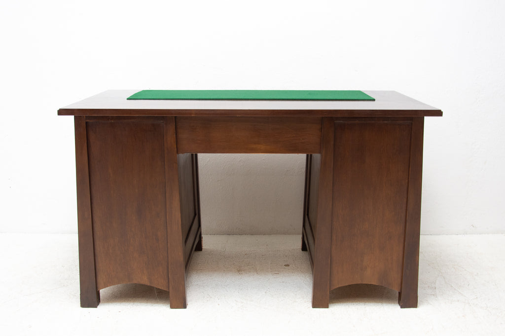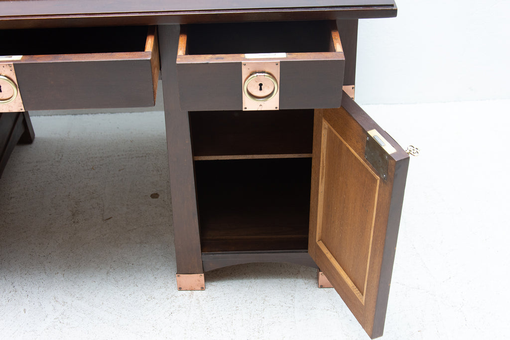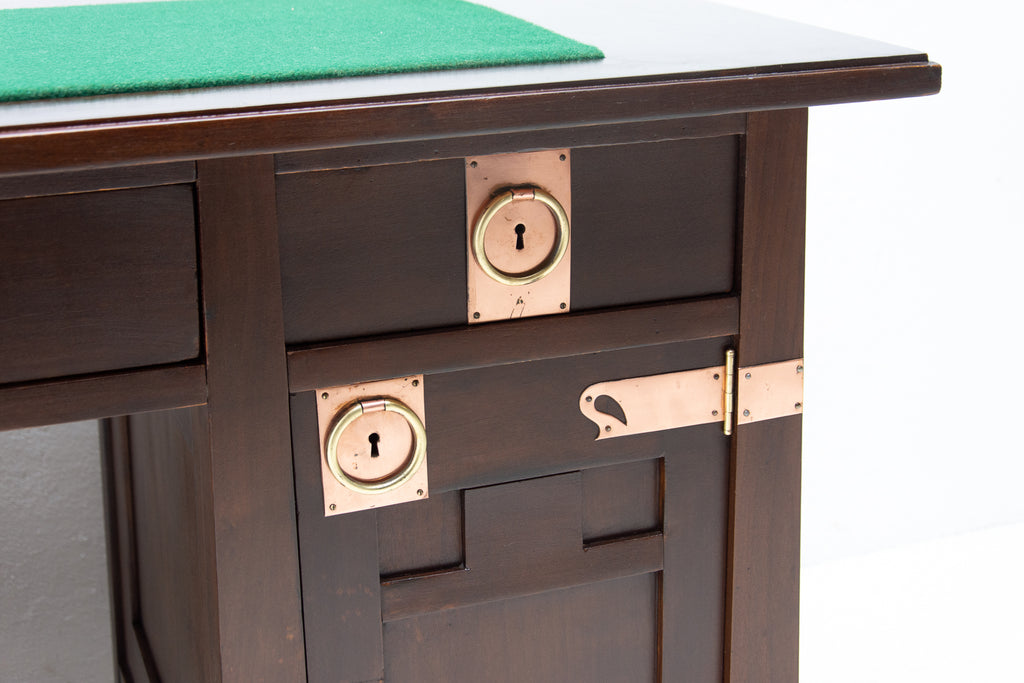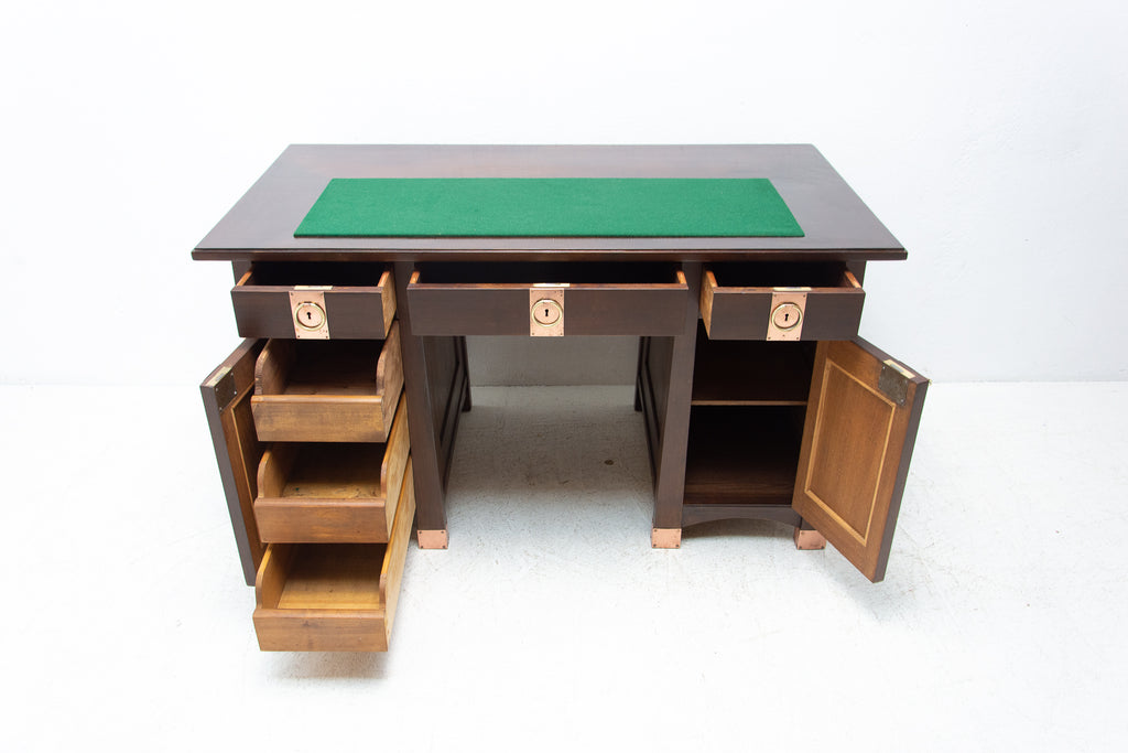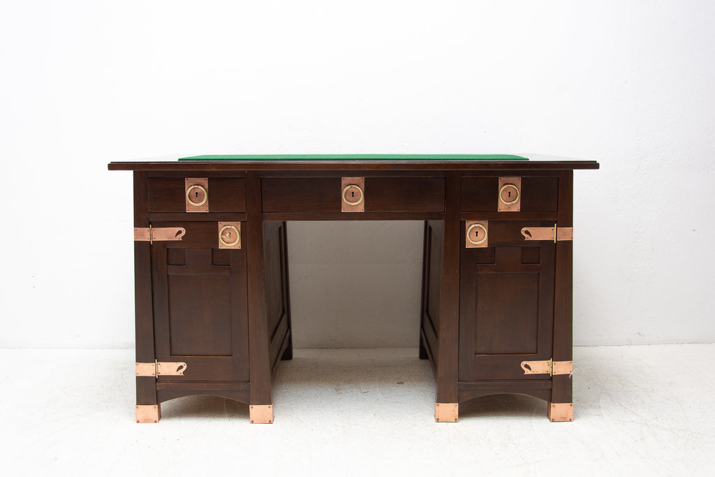 This luxurious-looking Art Nouveau writing desk was made in about 1910 in the former Austria-Hungary. It is made of oak wood. The table top is covered with green plush in the front. All original metal decorative parts were professionally cleaned, locks were repaired and cleaned. The table is in excellent condition after a complete professional renovation.