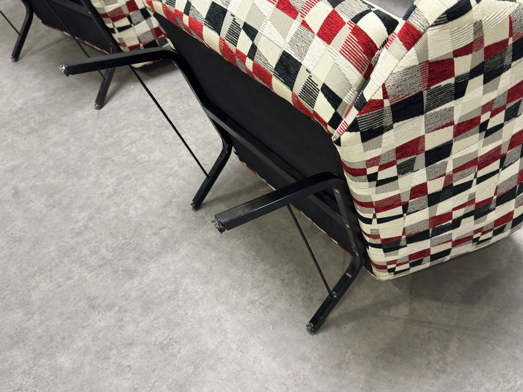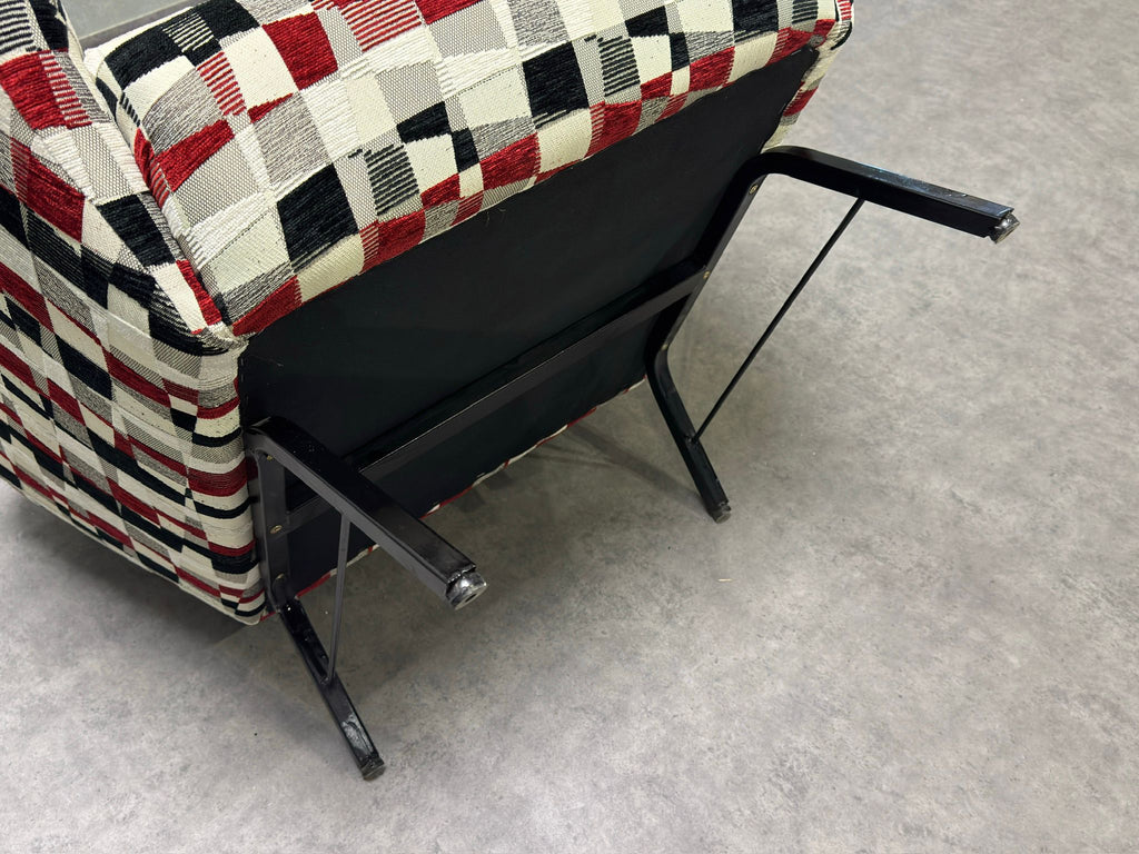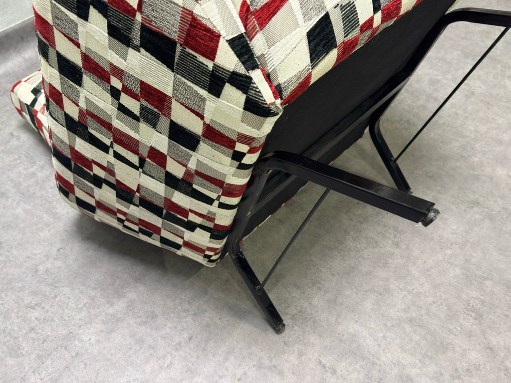 Color: Multicolor geometric upholstery (black, white, red, grey)