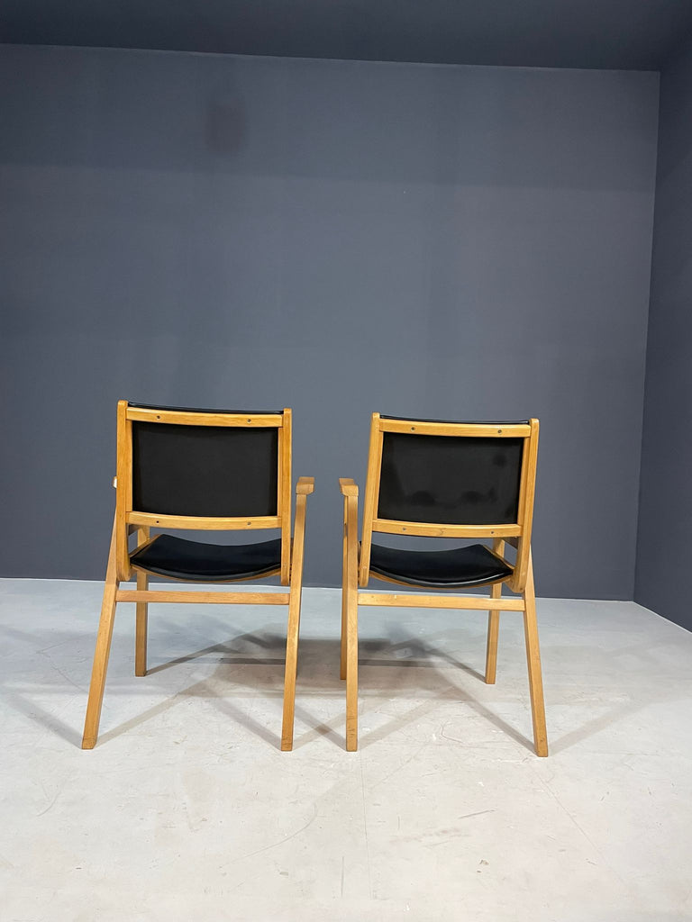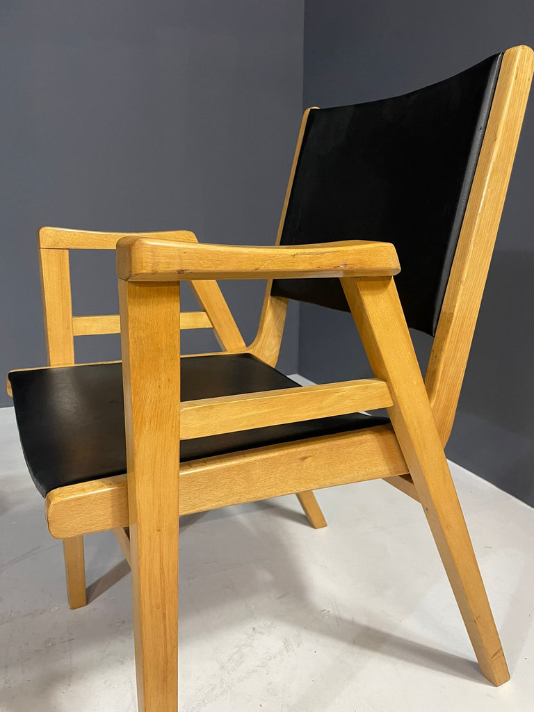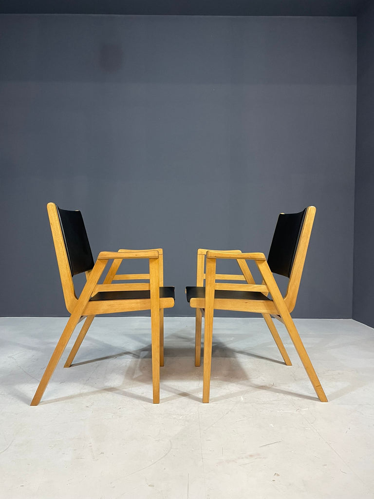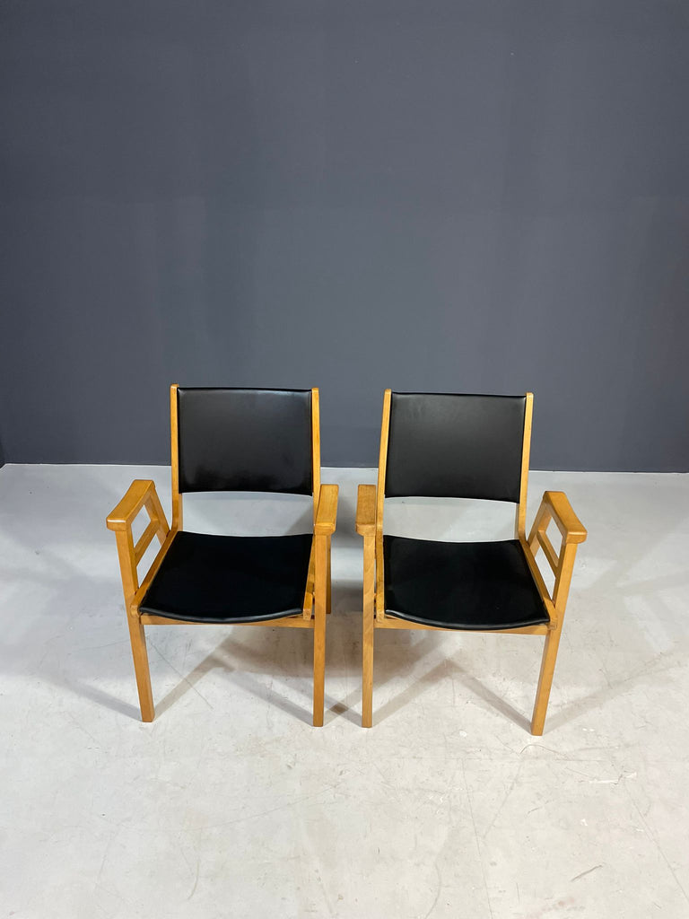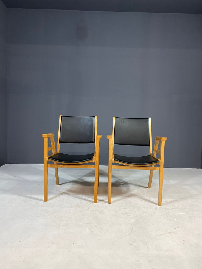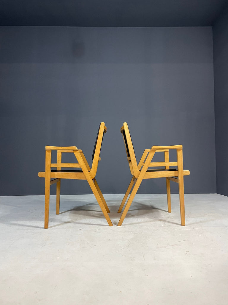 A pair of armchairs designed by František Jirák in the 1970s in former Czechoslovakia. Made of beech wood with black leatherette upholstery. The chairs remain in very good vintage condition with natural patina consistent with age and use. Price is for the pair.