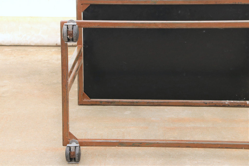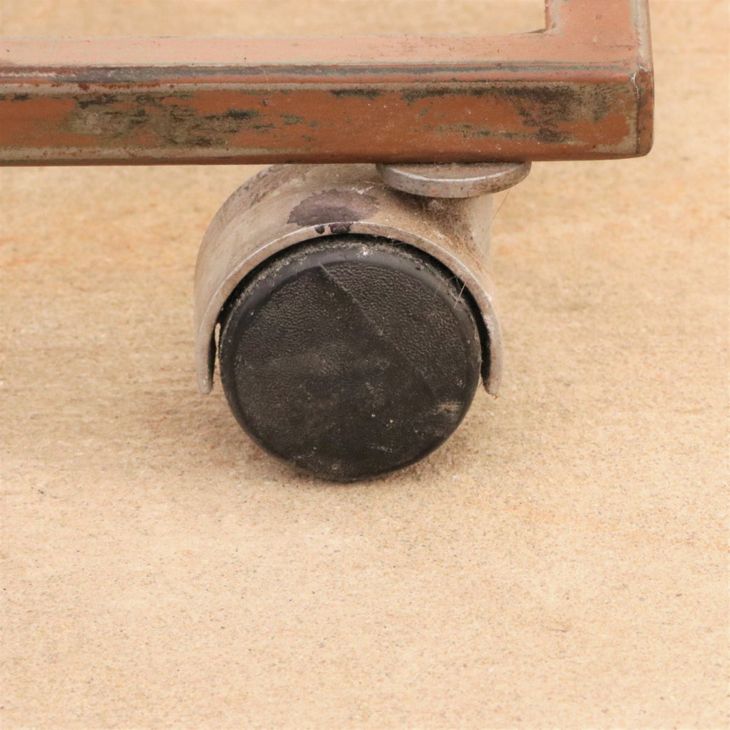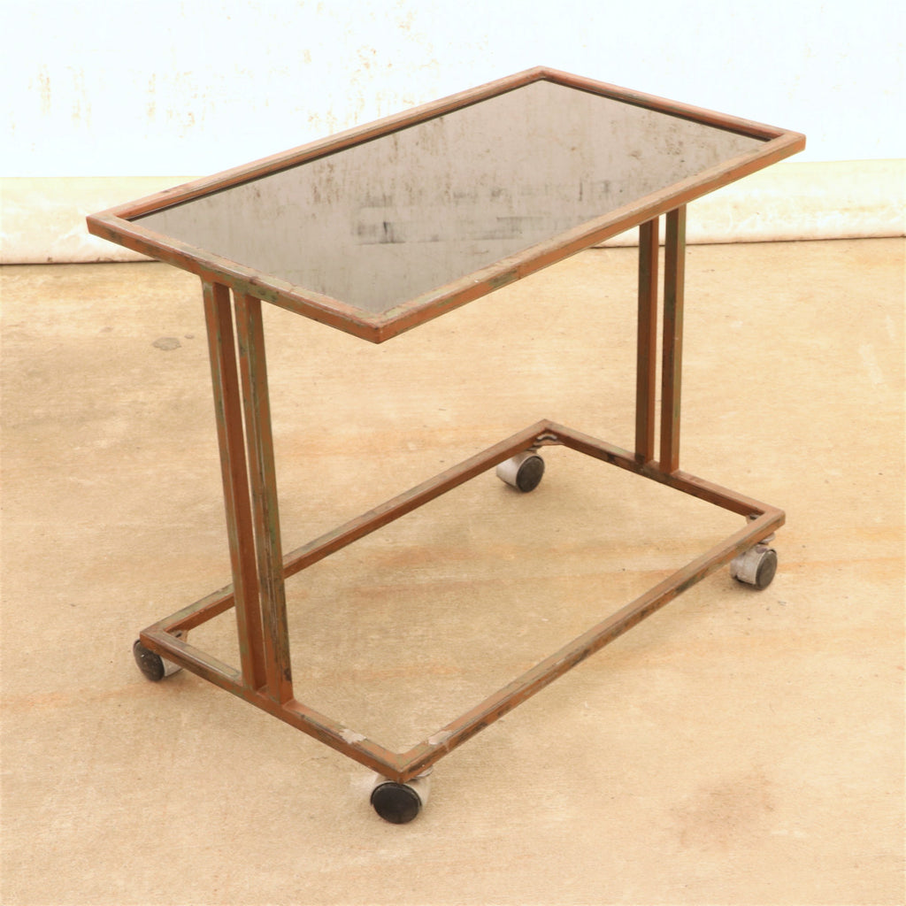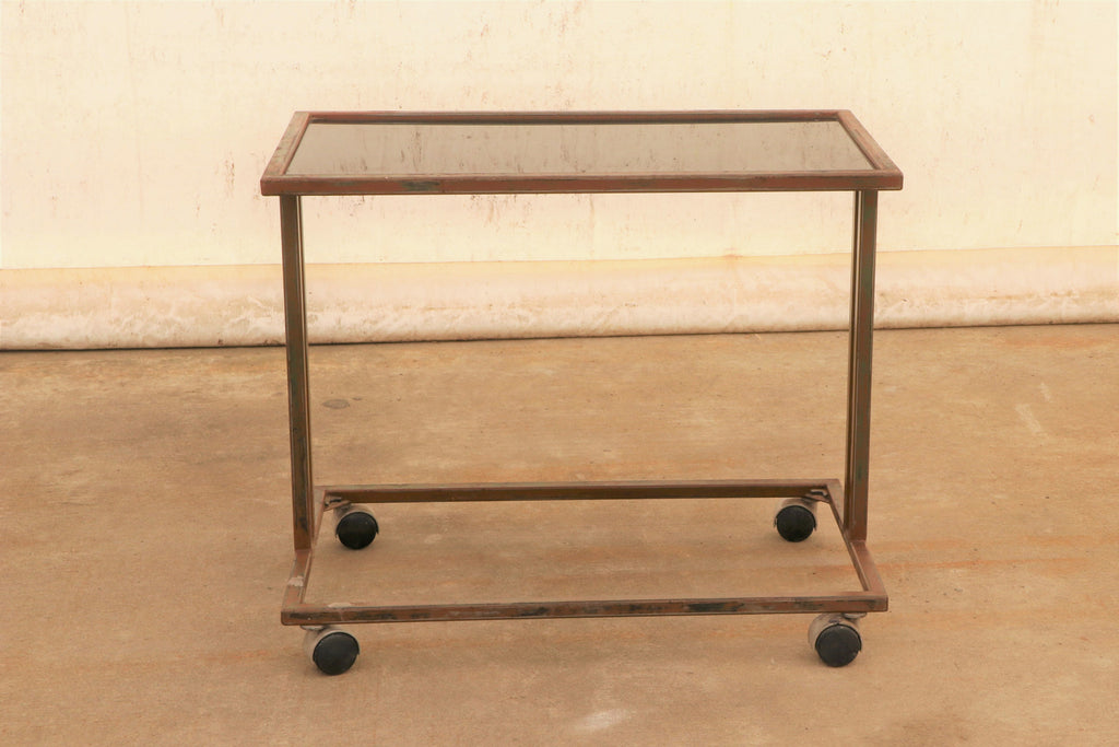 This Vintage-style serving trolley on wheels was made in the former Czechoslovakia in the 1970s. It features an iron structure and a glass top. The table is in good preserved condition. Signs of time and wear create an interesting and engaging patina to this piece.