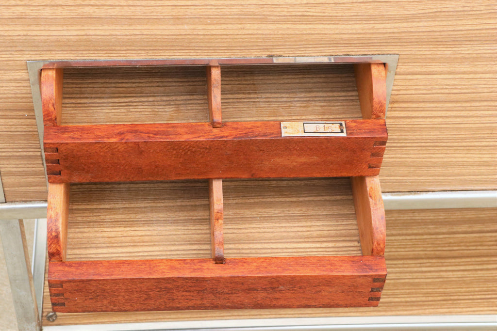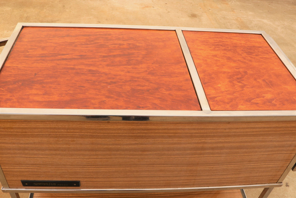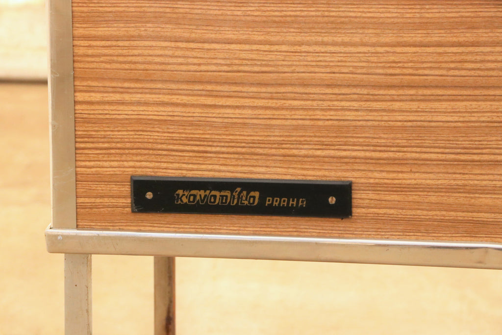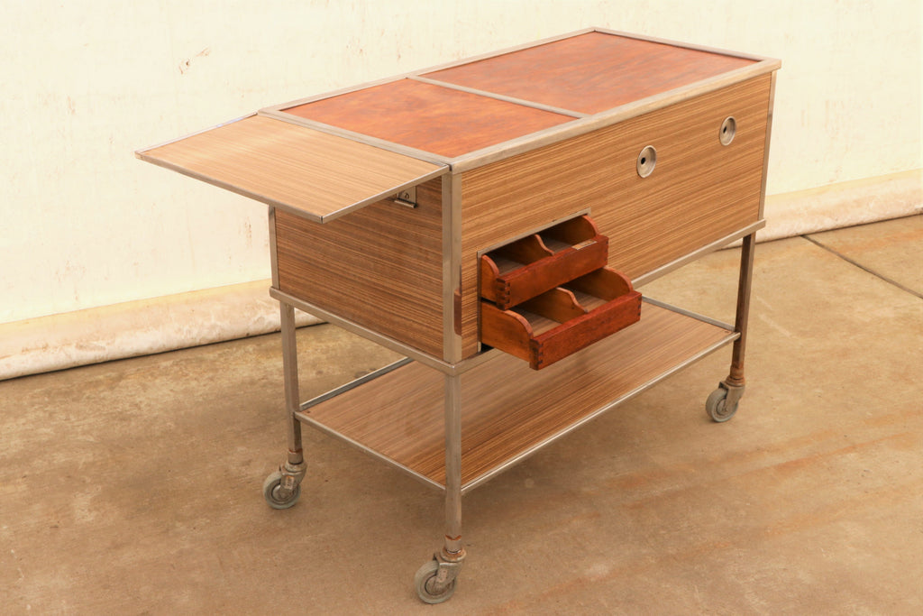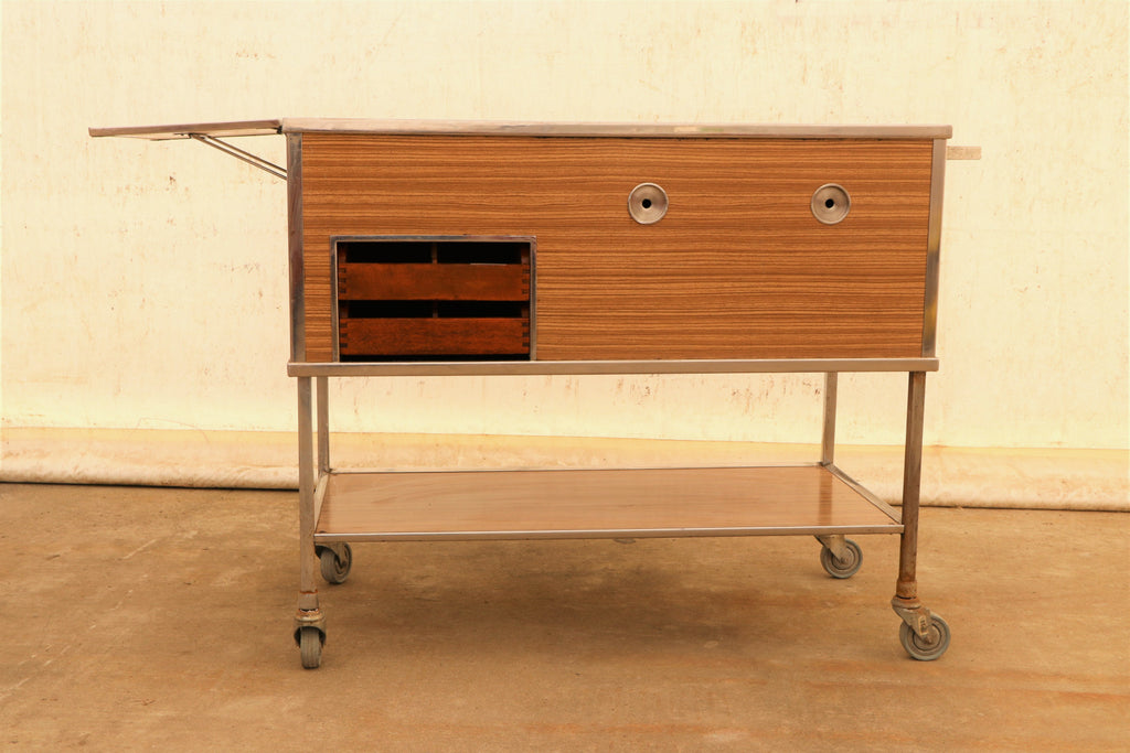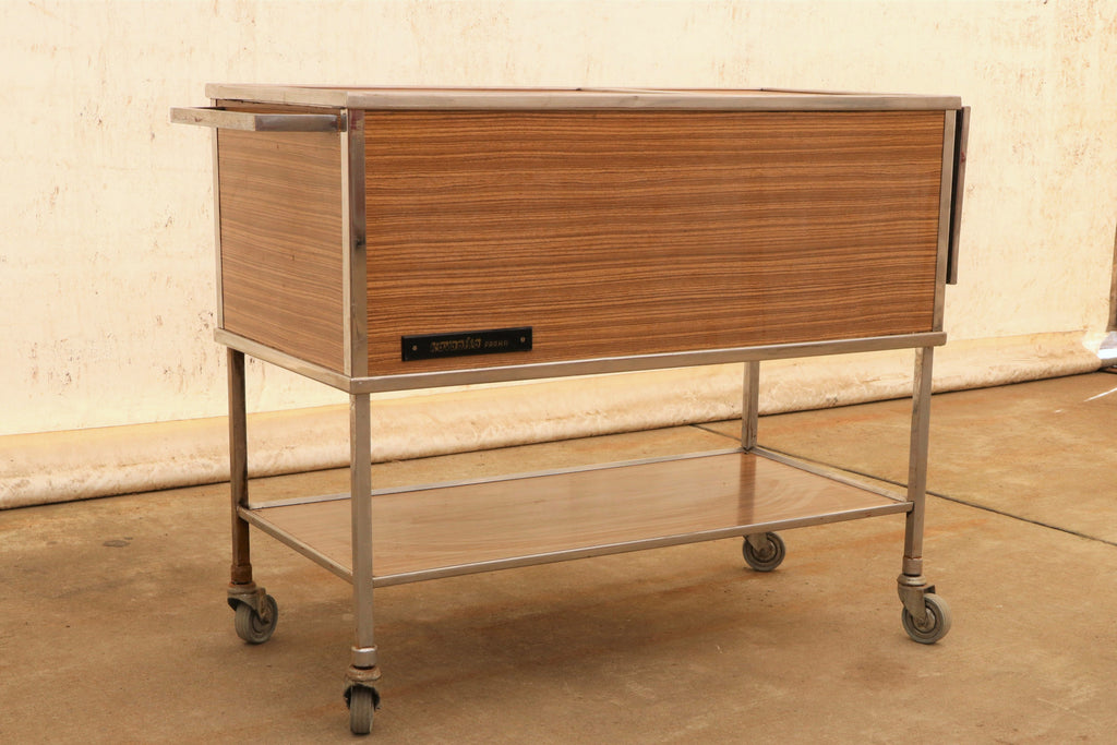 This Vintage-style serving trolley on wheels was made in the former Czechoslovakia in the 1970s. It was originally used as a serving table in the restaurant or hotel. Originally, dishes were inserted inside, this functionality is currently not preserved. At the moment, it is rather a great decoration for the interior. It features an iron structure and a formica surface with plywood boards on top and two wooden drawers. Unfolded is 127x47 cm The table is in good preserved condition. Signs of time and wear create an interesting and engaging patina to this piece.