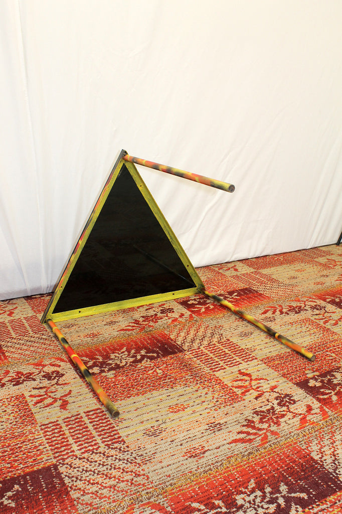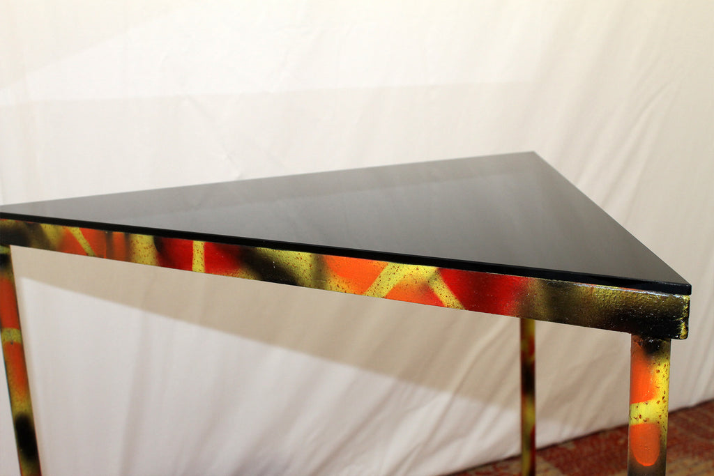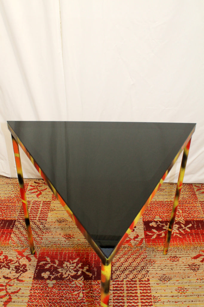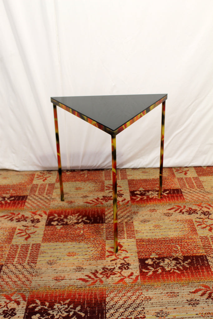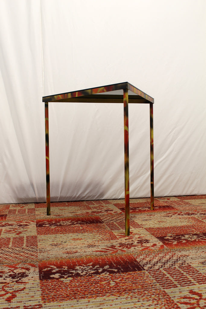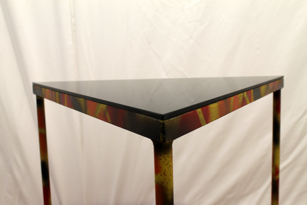 A charming Industrial iron vintage side table, made in the 1970s in the former Czechoslovakia. Colored legs and black glass on the top. In very good Vintage condition with matching and attractive patina.