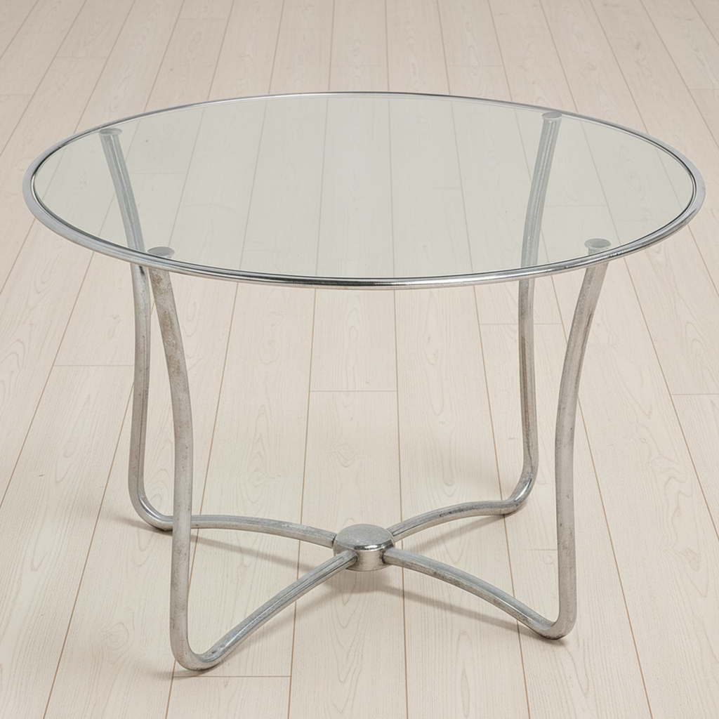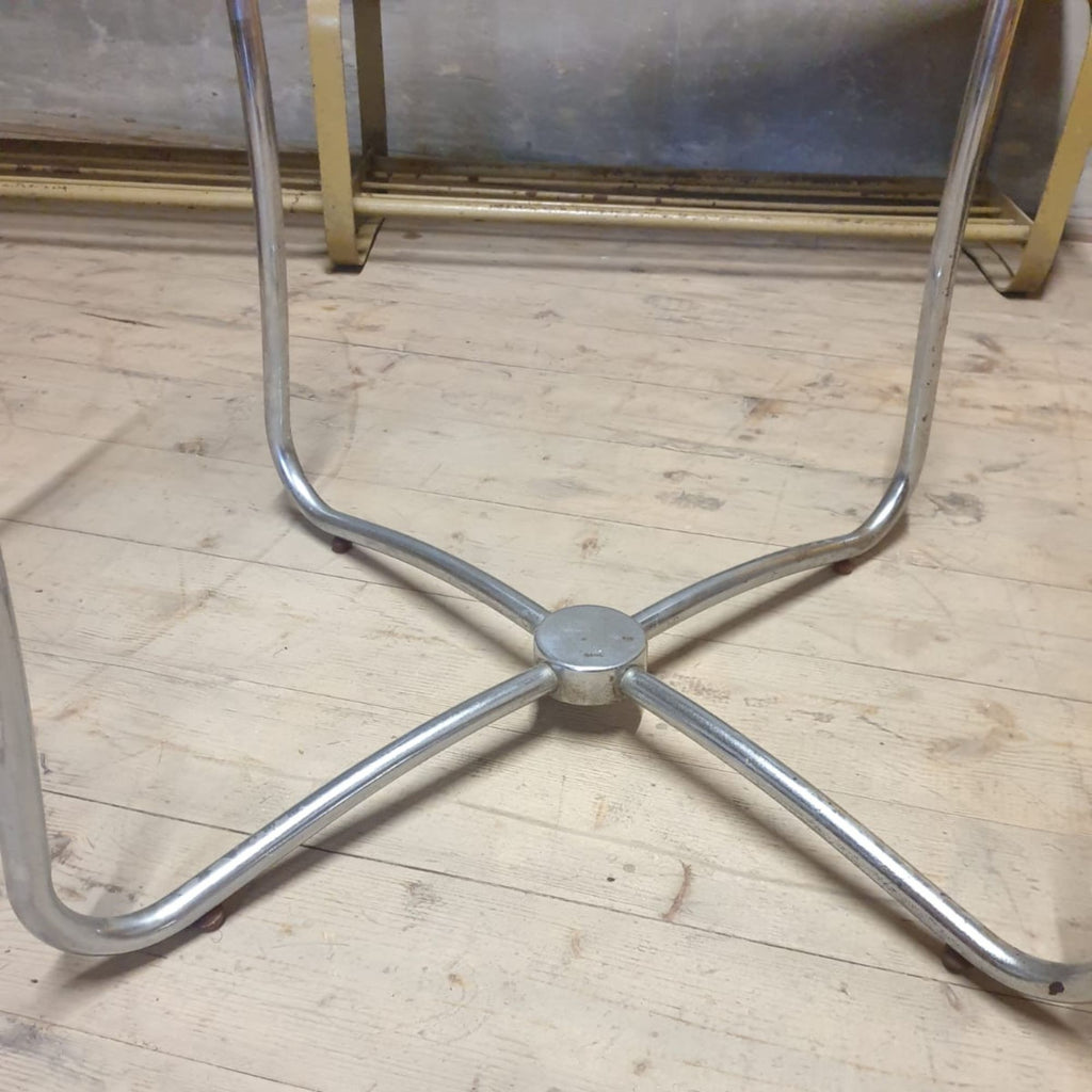 The table features a tubular steel frame with a characteristic cross-shaped base and a round glass top that rests on minimal metal supports. The structure shows light wear consistent with age, adding authentic character without affecting stability or function.
