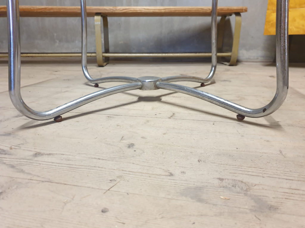 A round glass coffee table inspired by Bauhaus functionalist design, produced in former Czechoslovakia in the late 1930s–1940s. Its clean, geometric form reflects the modernist aesthetic typical of Central European metal furniture of the period.