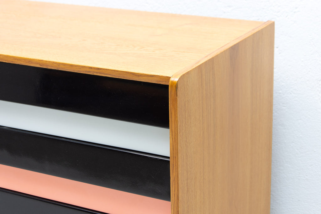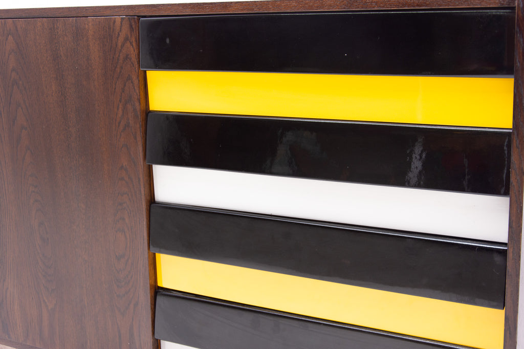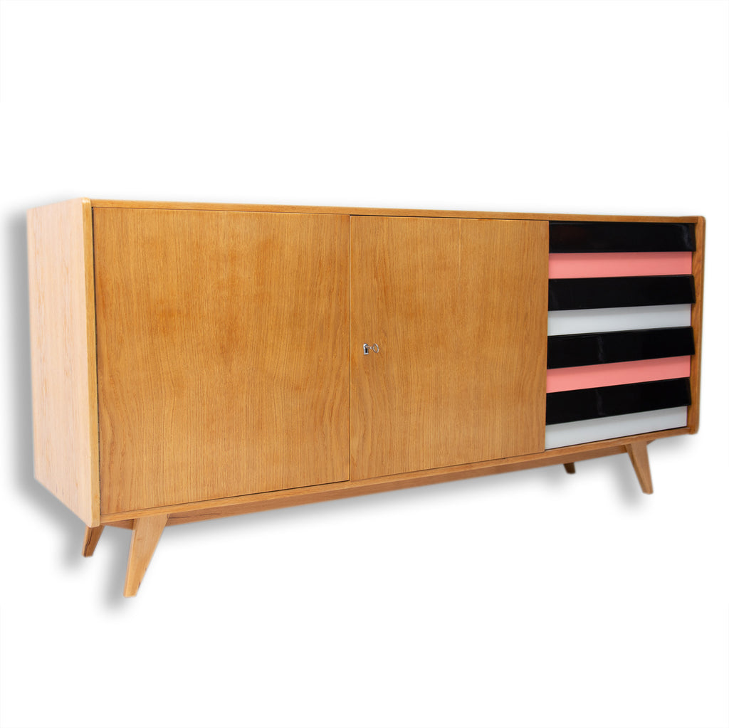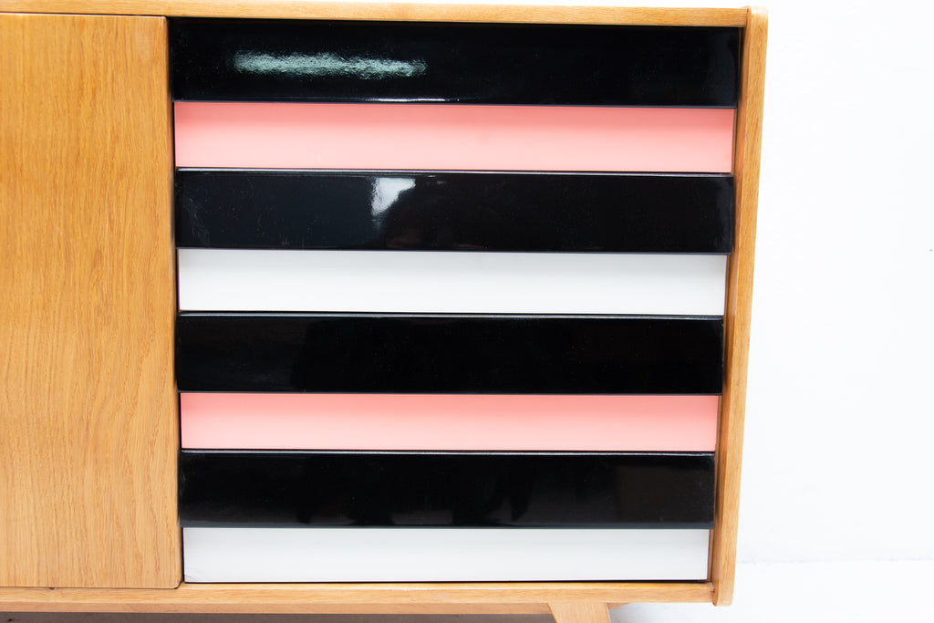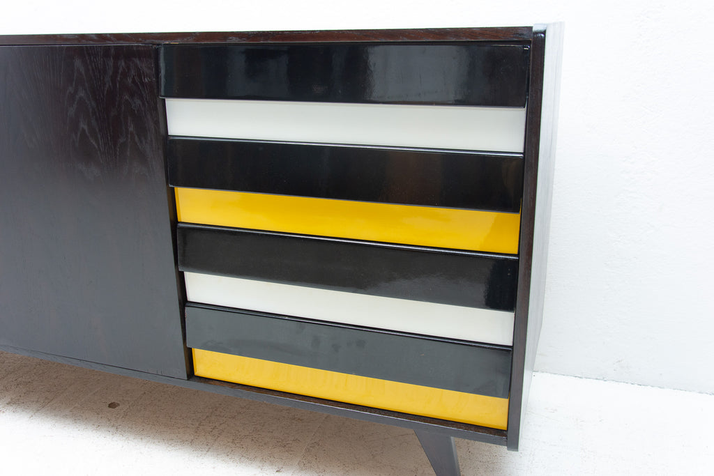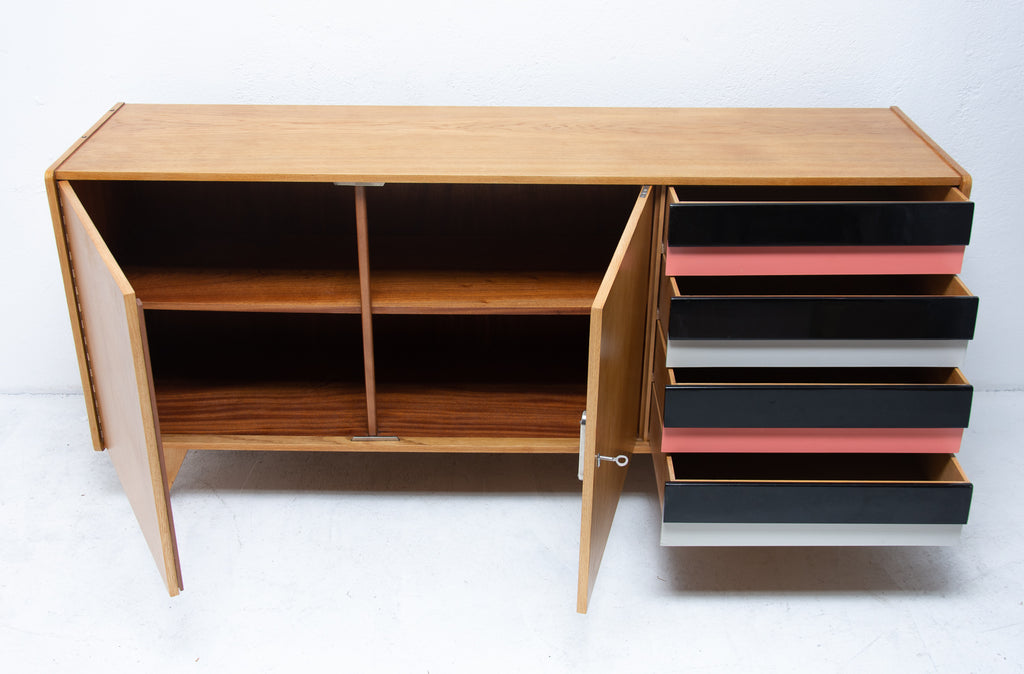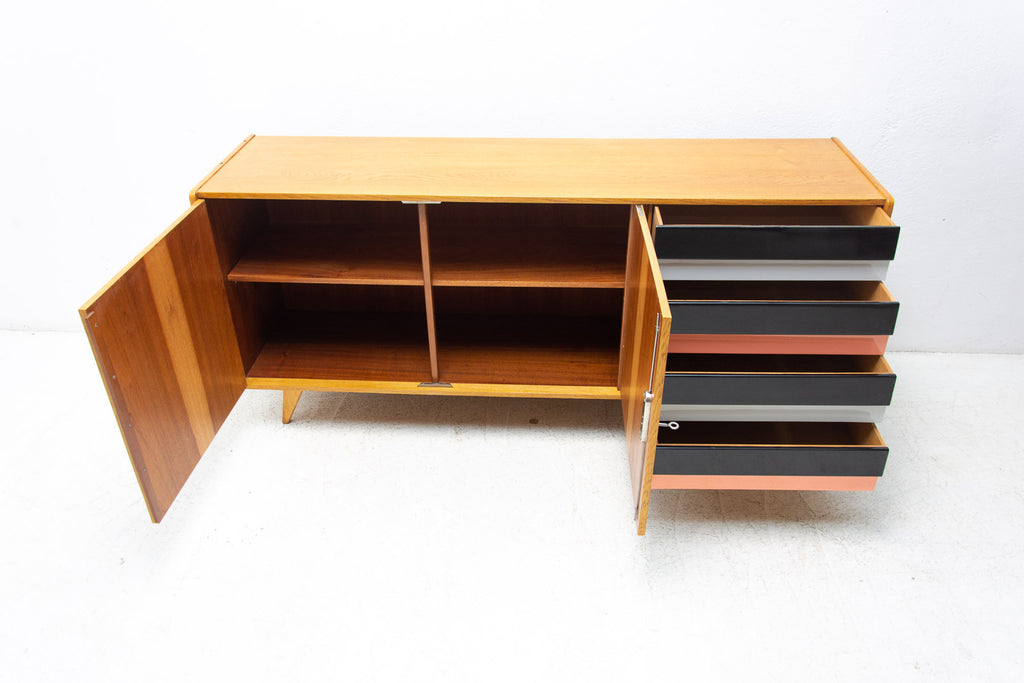 A popular Midcentury sideboard model U-460 from the 1960´s. It was designed by Jiri Jiroutek for Interier Praha. It features a beech wood, plywood, colored lacquered drawers. In very good condition, fully renovated.