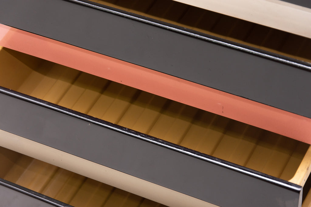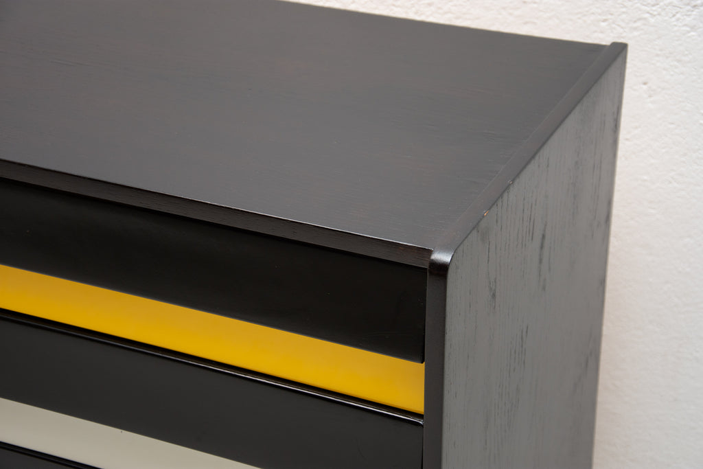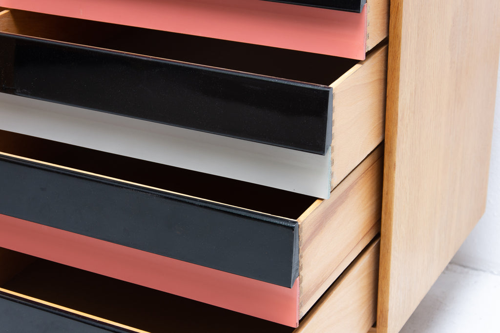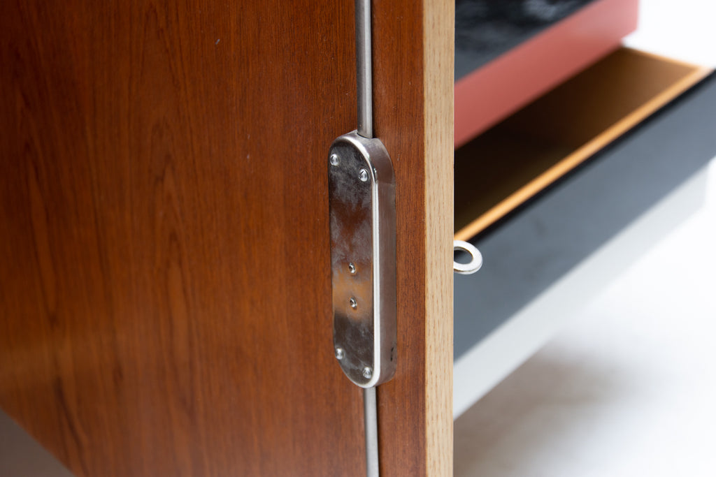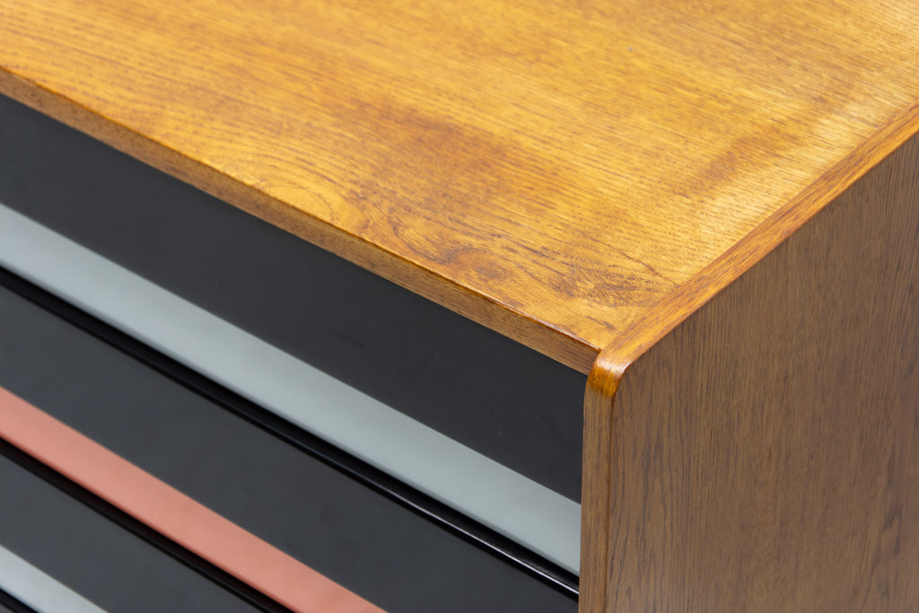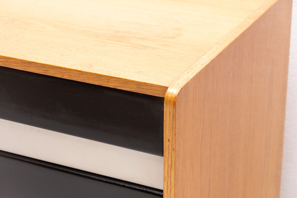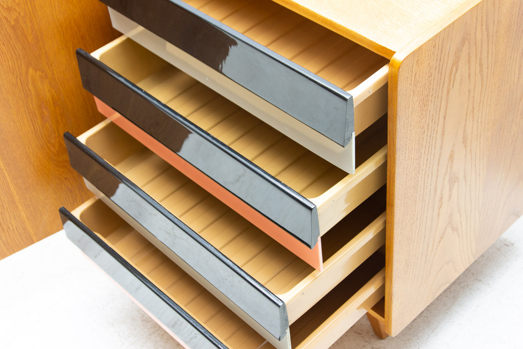 A popular Midcentury sideboard model U-460 from the 1960´s. It was designed by Jiri Jiroutek for Interier Praha. It features a beech wood, plywood, colored lacquered drawers. In very good condition, fully renovated.