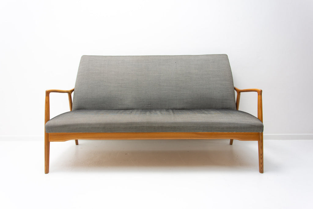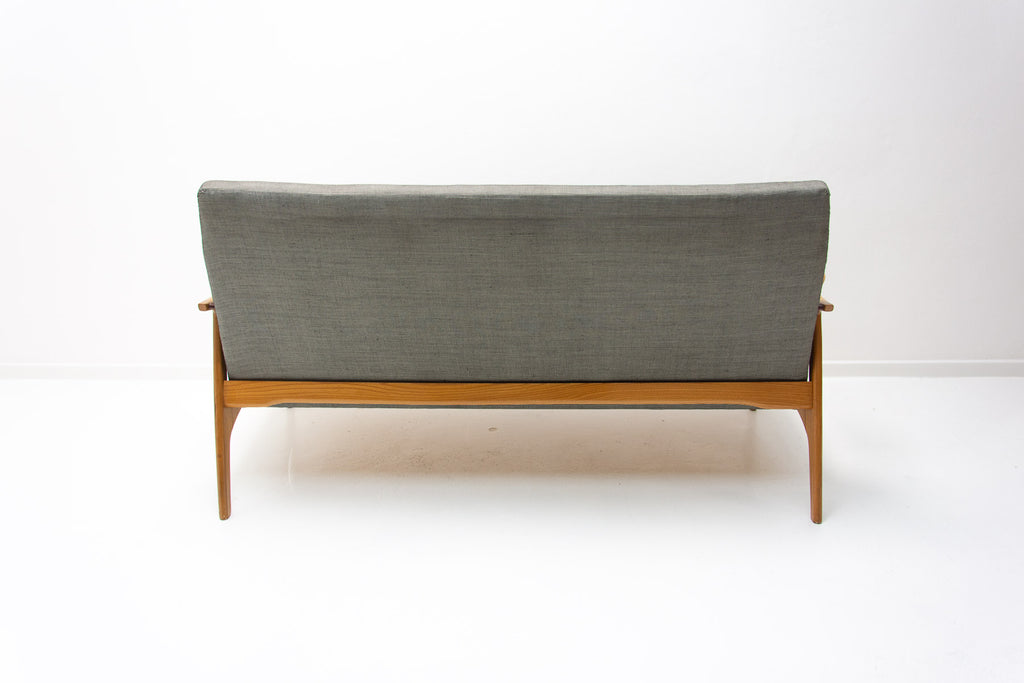 This Scandinavian midcentury style sofa was made by Krásná Jizba company in the former Czechoslovakia in the 1960´s. It´s upholstered with fabric. The structure is made of bent beech wood.