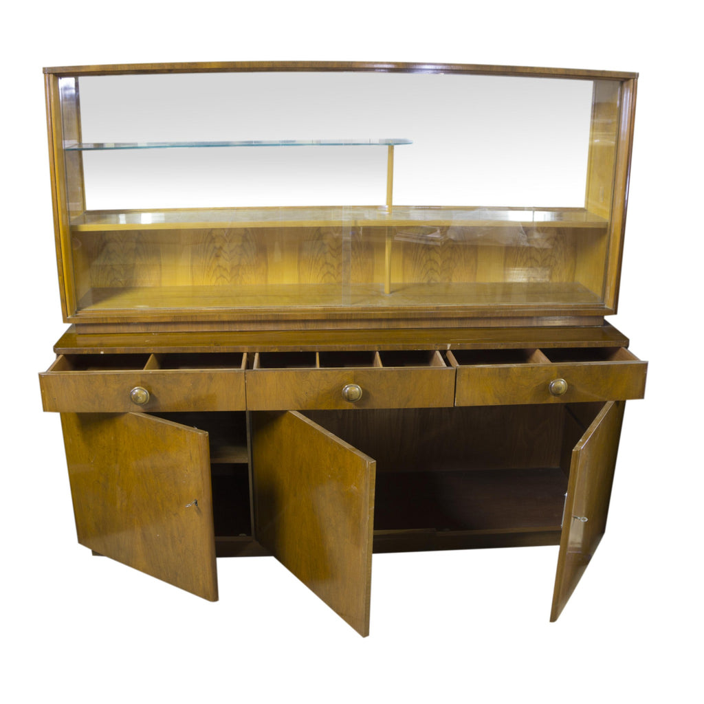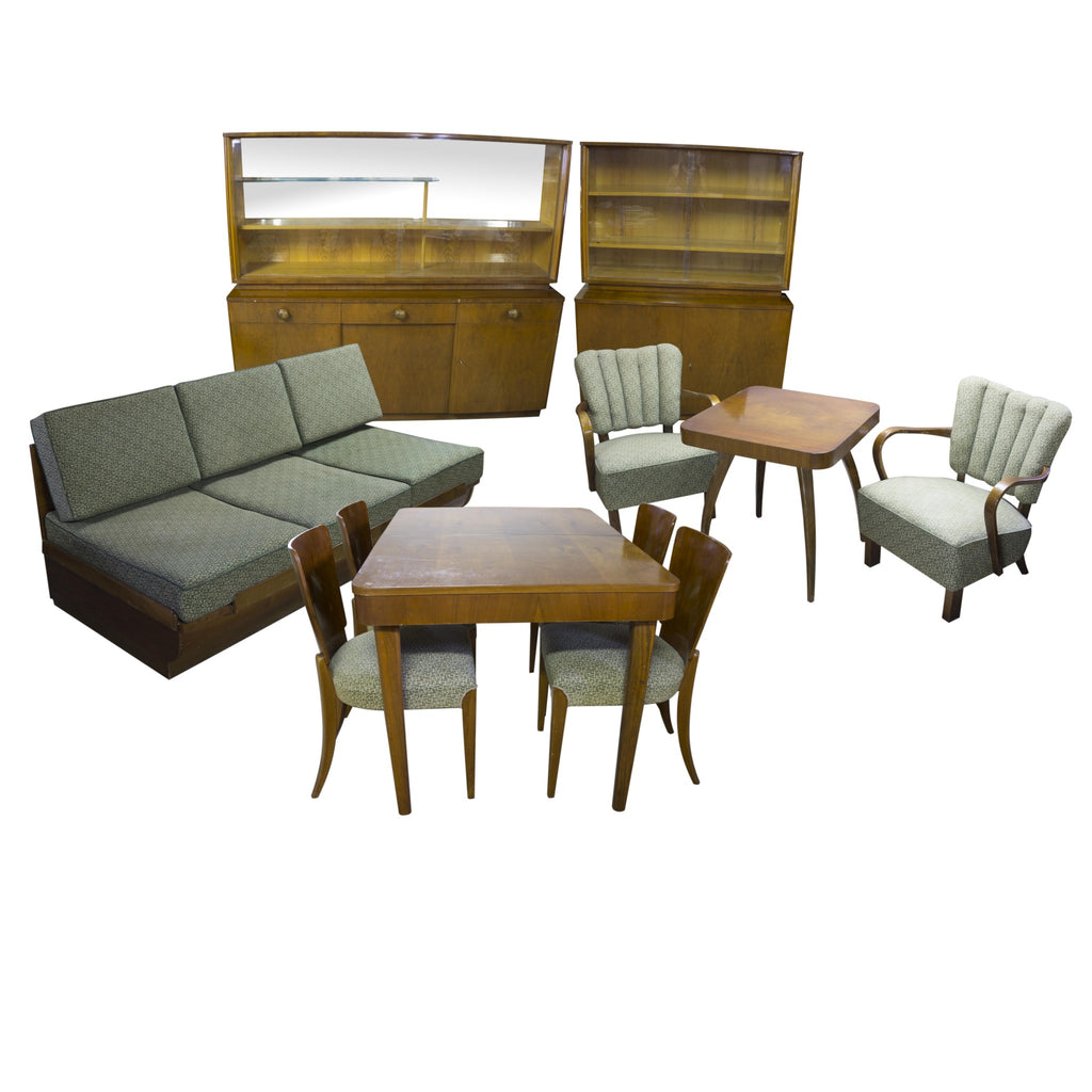 The Bookcase, designed by Jindřich Halabala, Mid-Century, manufactured ÚP Závody. Glazed upper part, glass shelves. Modern design. Polished veneer. Very good condition. The library is part of the living room, the other items can be found in our offer.