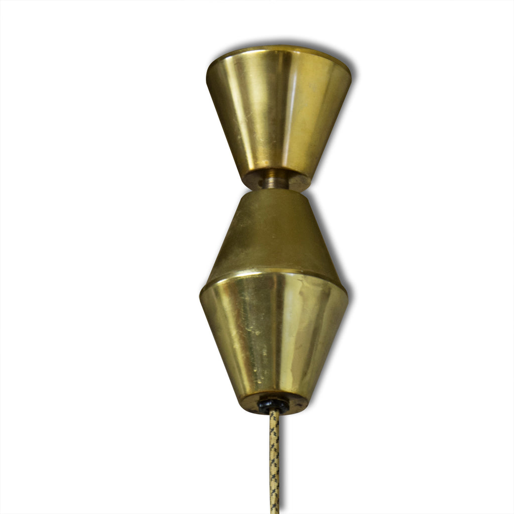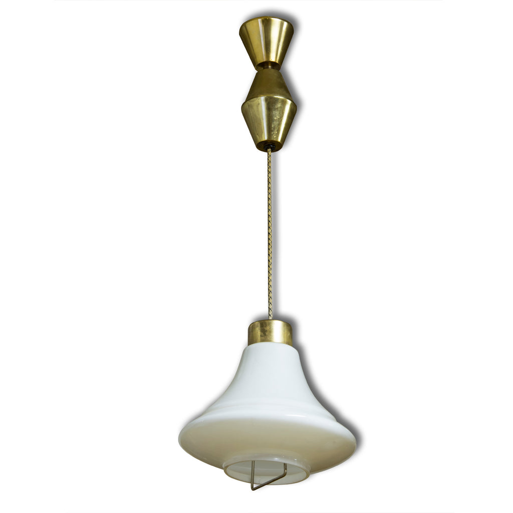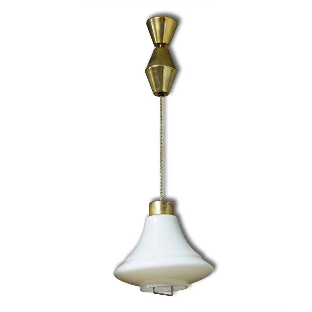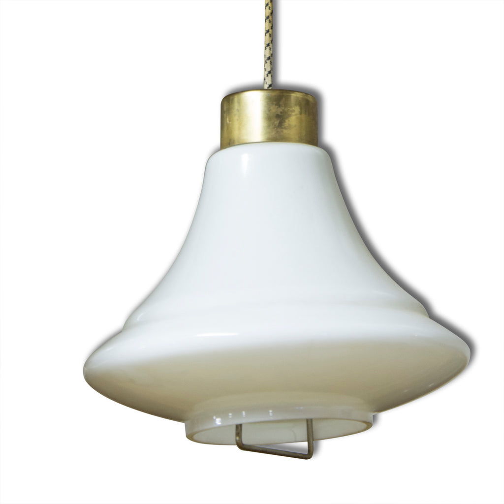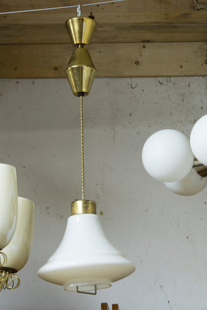 A vintage mid century pendant light, made in Czechoslovakia in 70´s. Material: milky glass, brass. In very good Vintage condition, consistent with age and use. Original wiring. Functionality has not been tested. If you are interested, we will provide a new wiring.