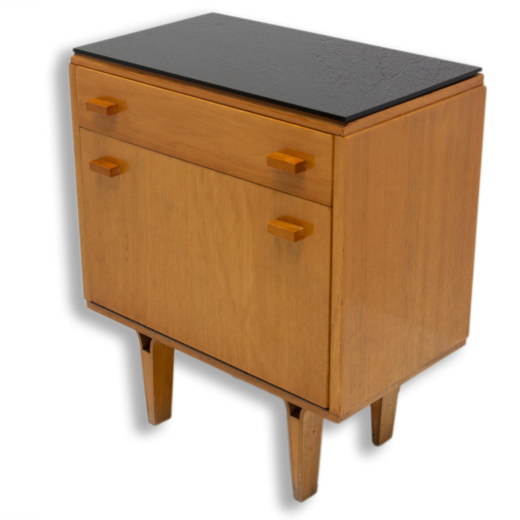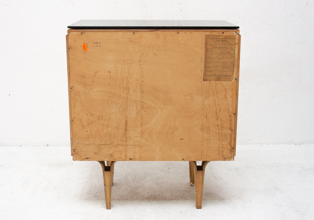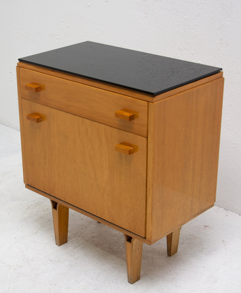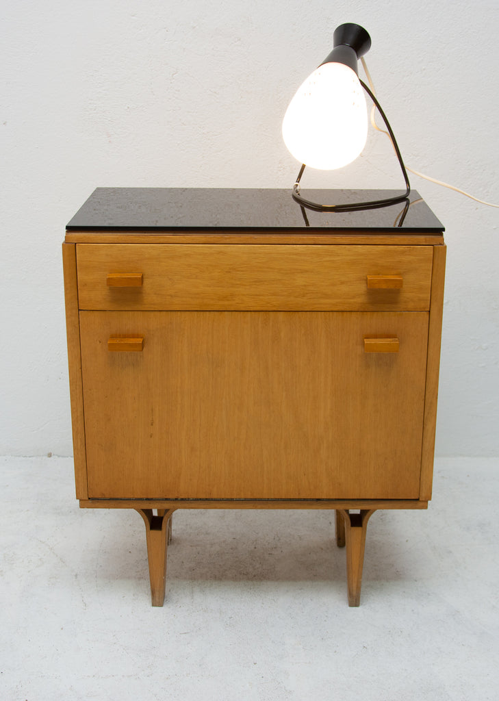 This night stand can be used also as a small chest of drawers. It was made by furniture company "Nový Domov" in former Czechoslovakia in the 1960´s. It features black glass on the top, one drawer and storage space at the bottom. Very intersting and simple design. This item is in very good Vintage condition.