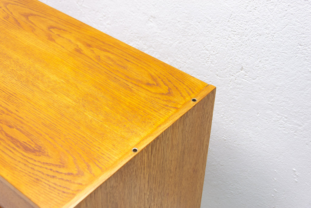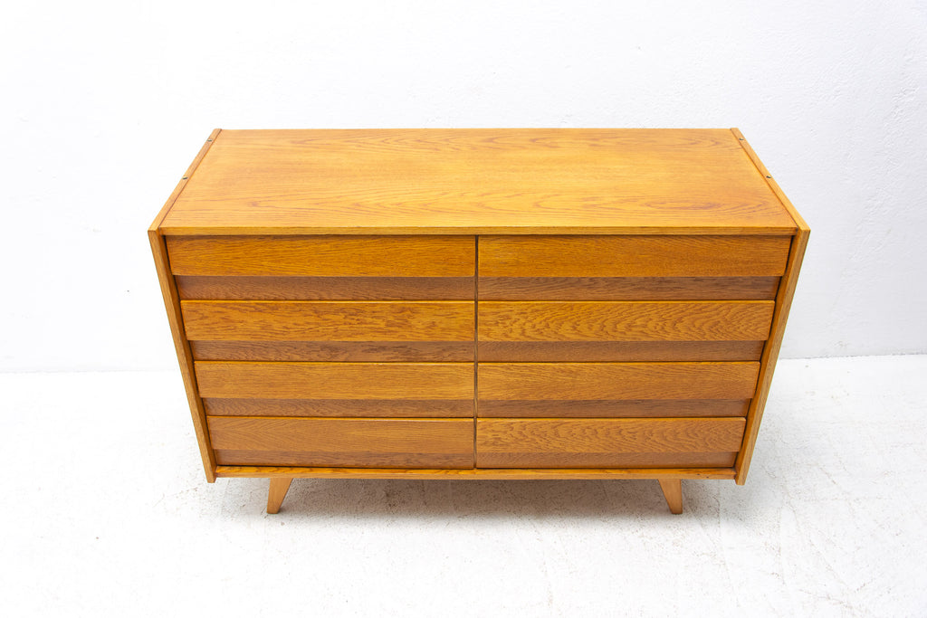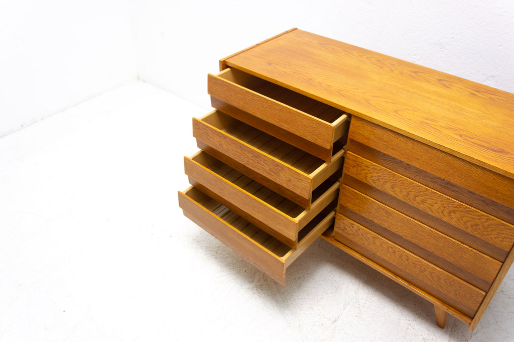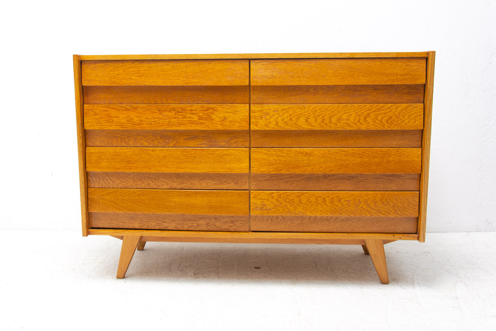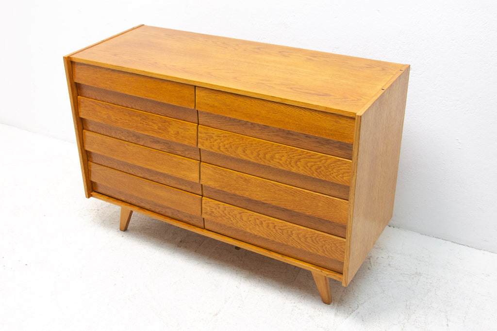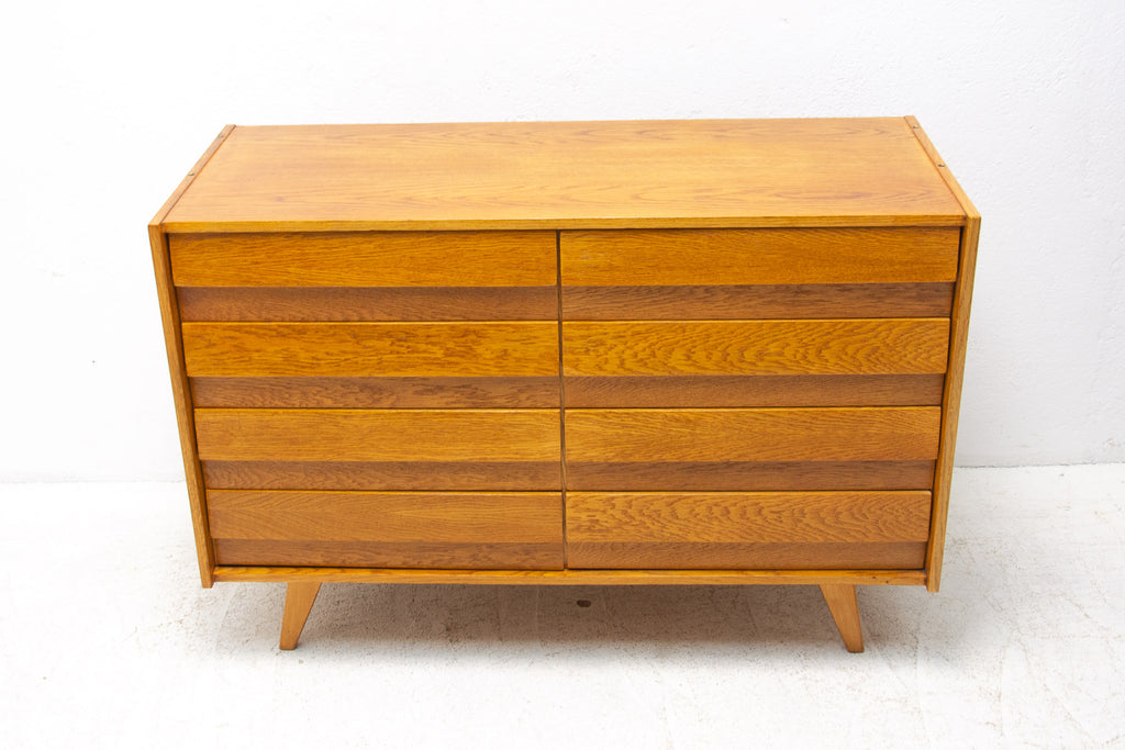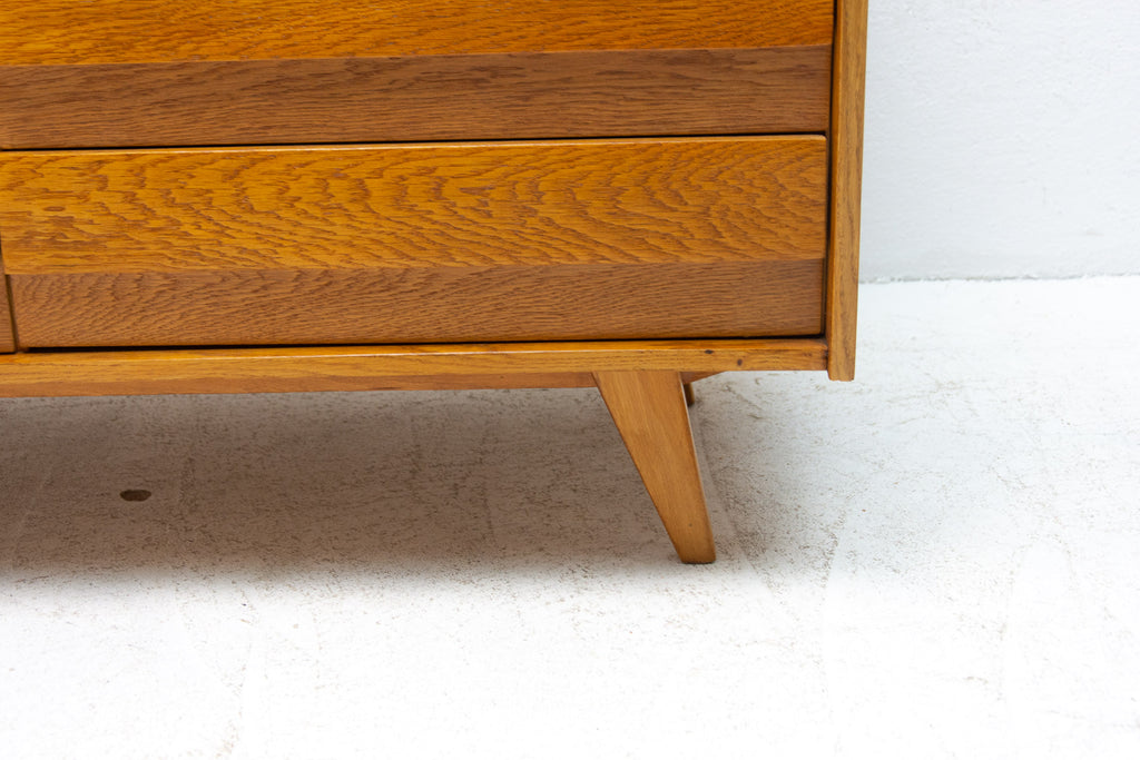 Mid century chest of drawers, model no. U-453, designed by Jiří Jiroutek for Interiér Praha. It was made in the former Czechoslovakia in the 1960´s. This model is associated with the world-famous EXPO 58 in Brussels. It´s made of oak wood and and plywood and drawers have plastic inner parts.