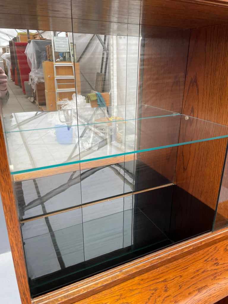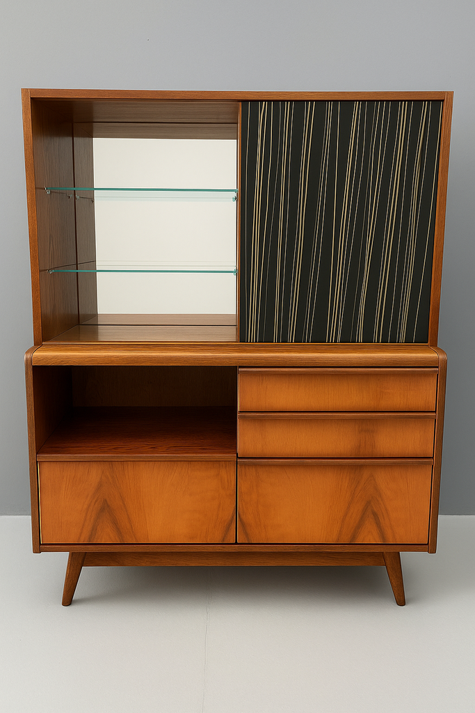 This elegant cabinet features signature mid-century modern elements including rounded edges, contrasting materials, and a smart layout. The upper section includes a glass display case with glass shelving and mirrored backing. The other half features a striking black sliding door with a fine linear pattern. The lower portion contains spacious cabinets and drawers for practical storage.