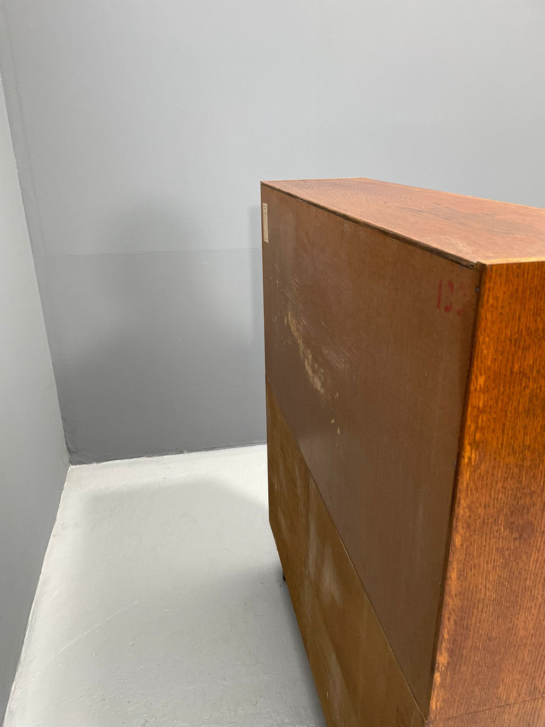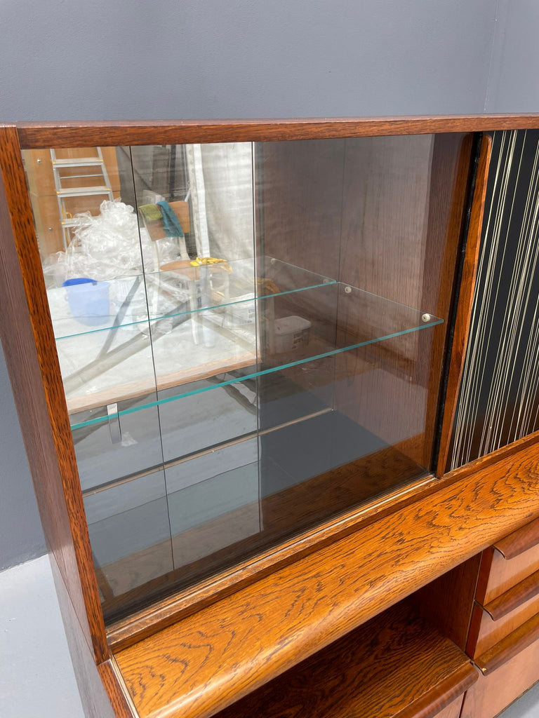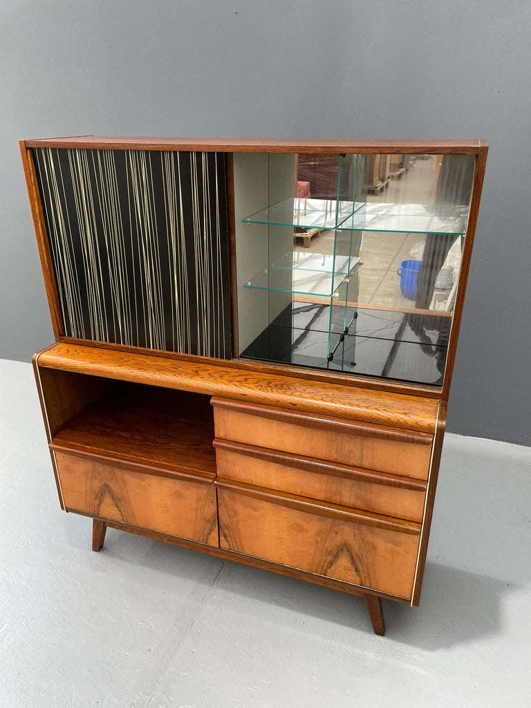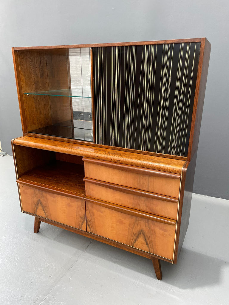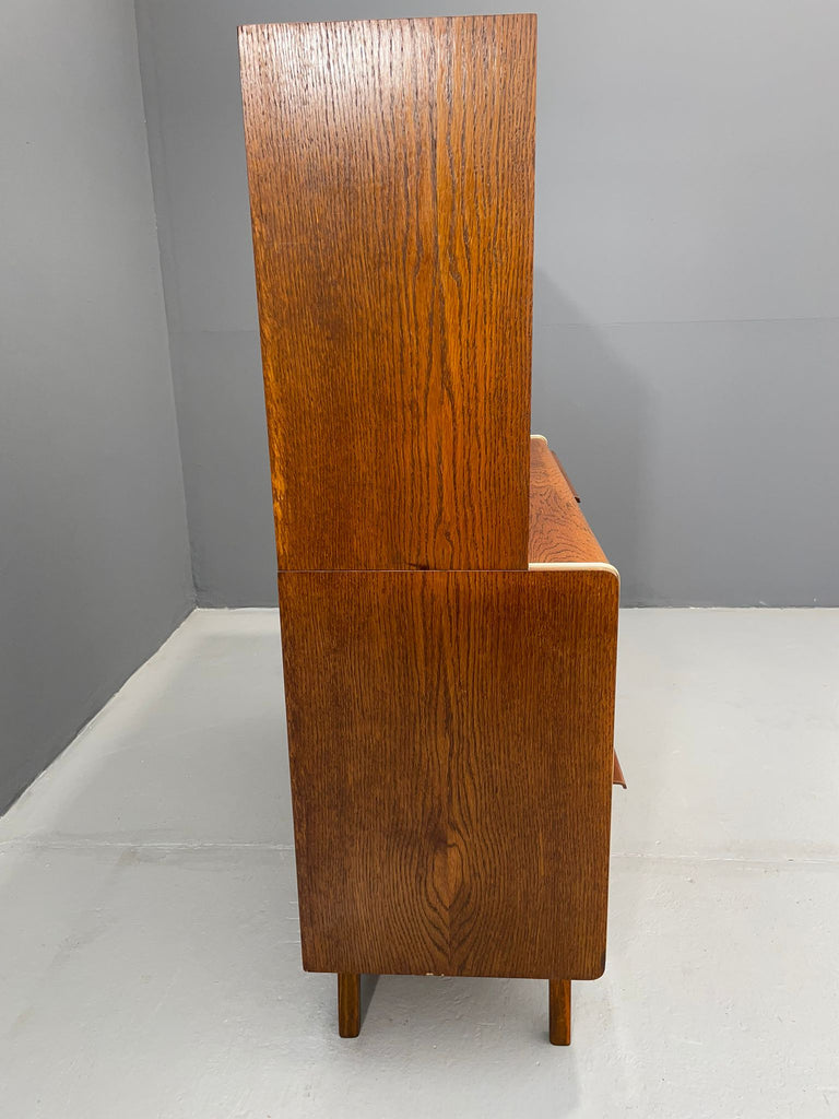 Crafted from oak and ash veneer with warm wood tones, this piece is accented with original brass trim and showcases the unique aesthetic of 1960s Czech design.