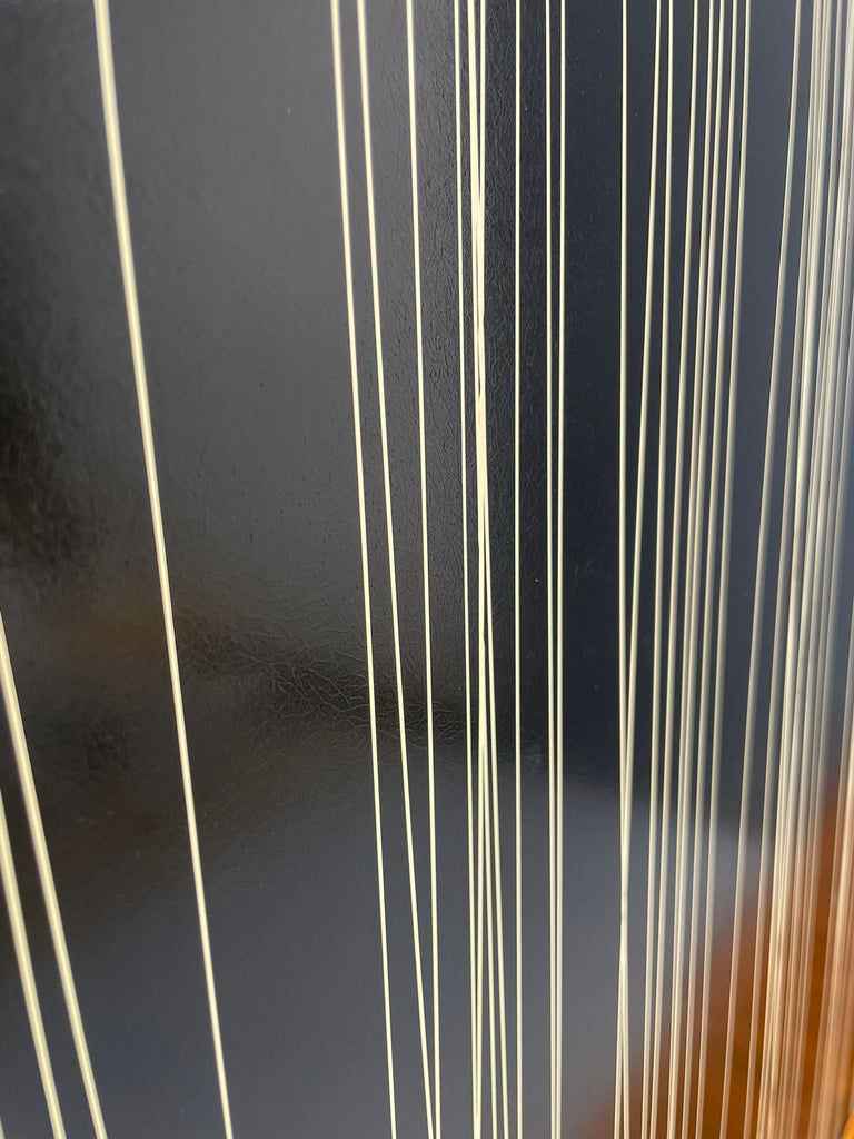 Condition: Original and very good with minor wear consistent with age. Small veneer damage and a chip in the black opaline glass. Light streaks visible on the patterned sliding door.