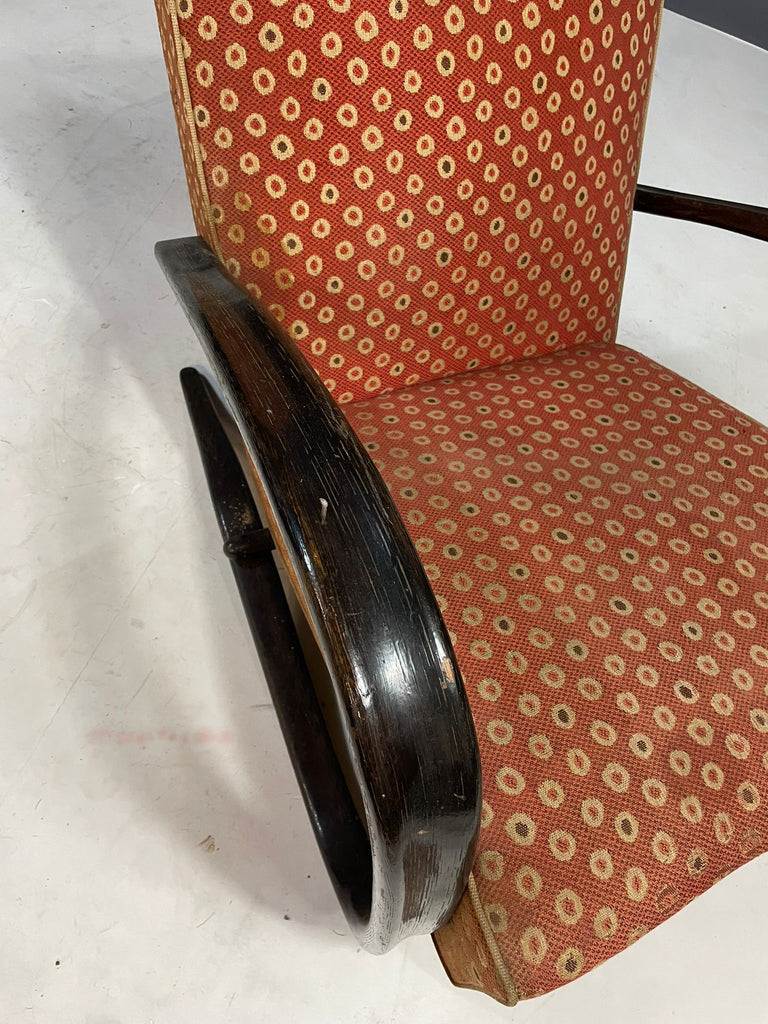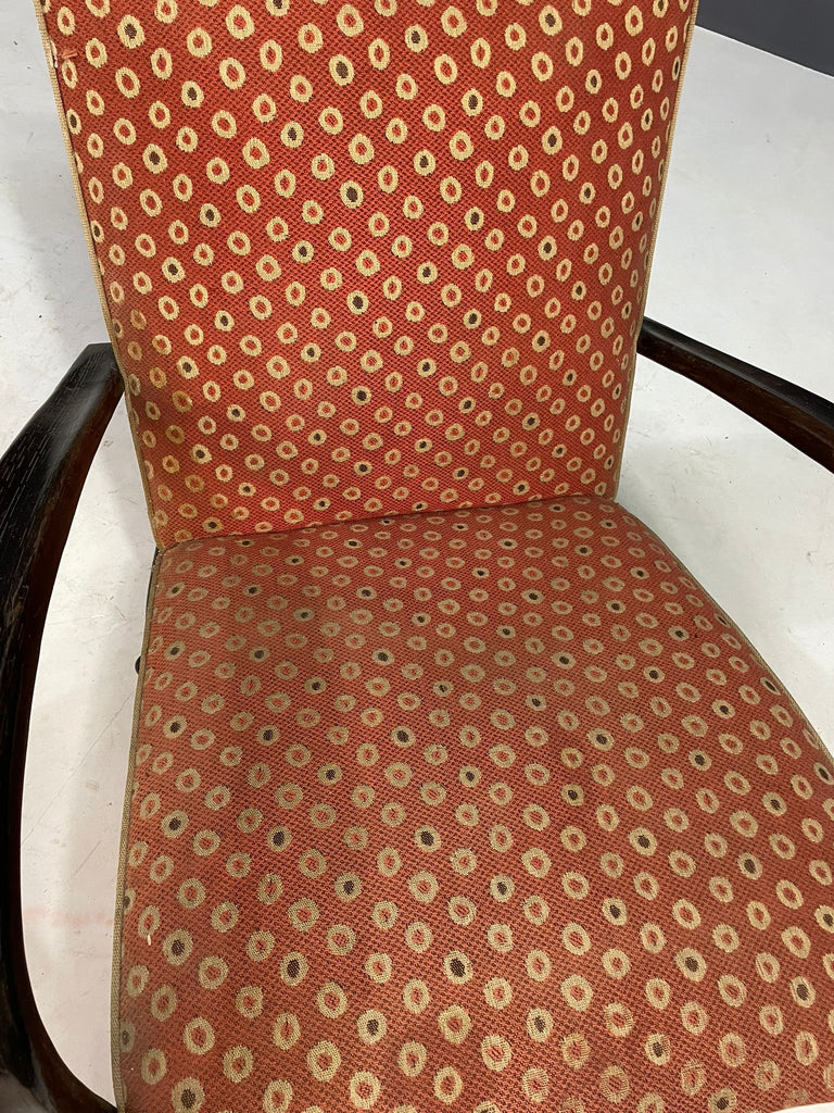 The chairs retain their original character with vintage upholstery in very good condition for their age, and beautifully aged dark-stained wood.