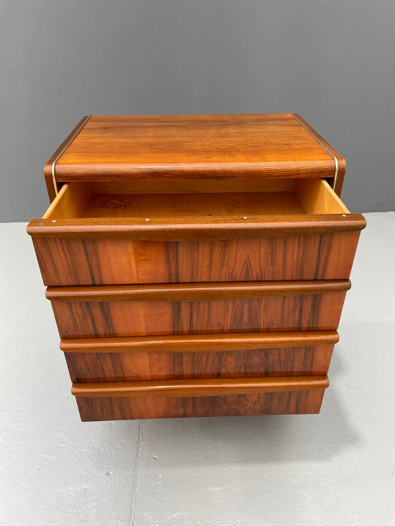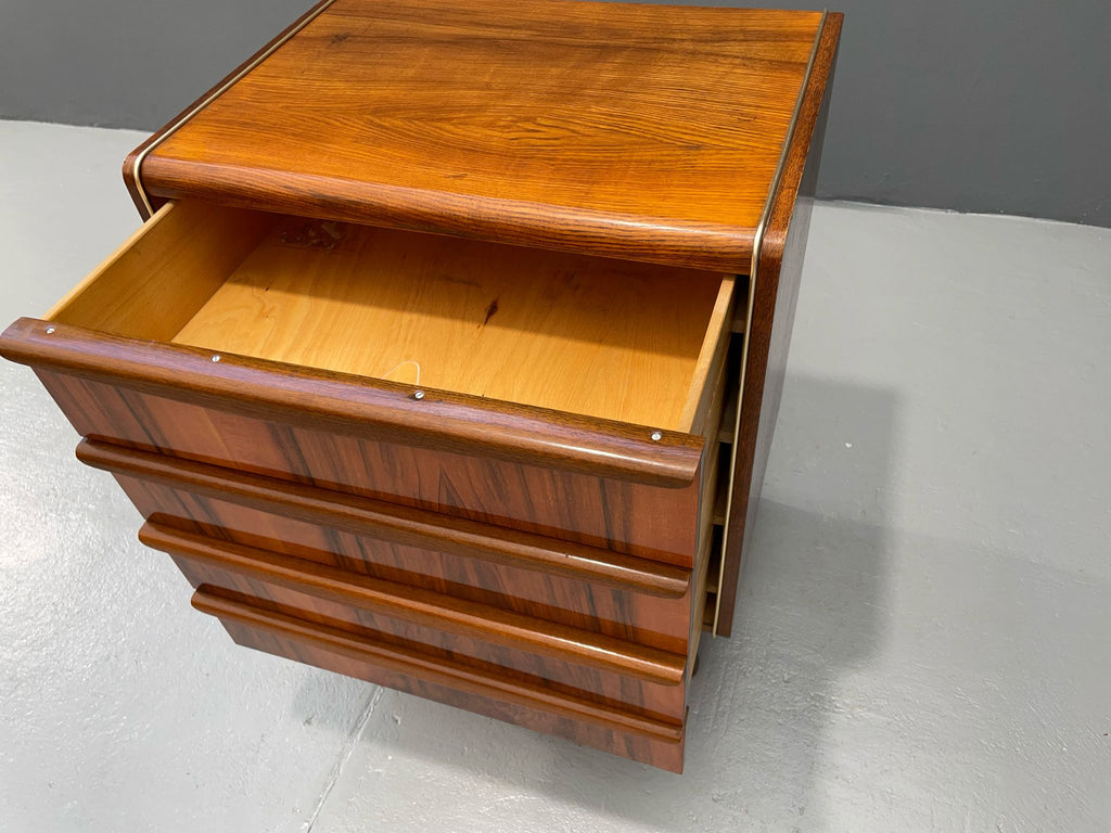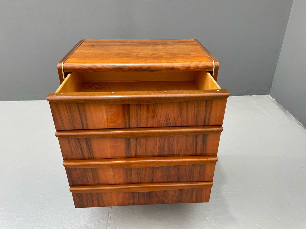 The chest features four drawers with integrated groove pulls and a richly grained wood veneer in warm tones. The sculpted edges on the sides add a light, dynamic quality to the design.