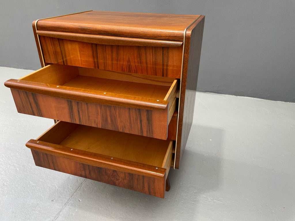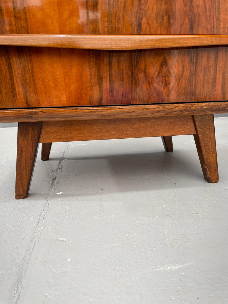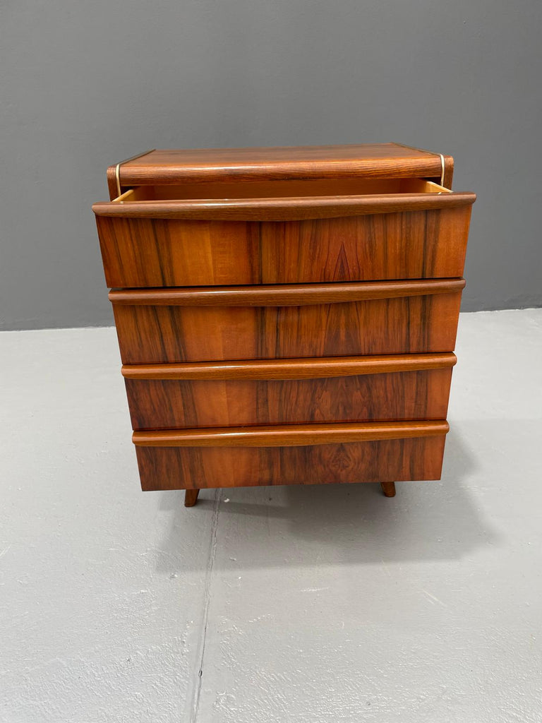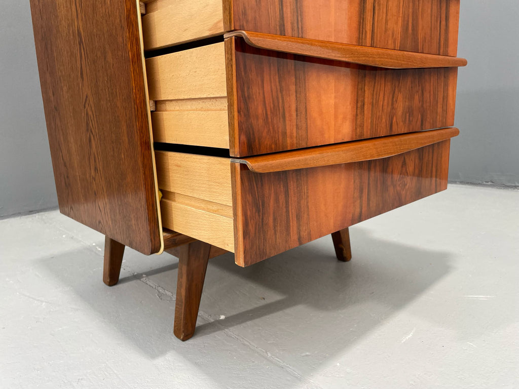 We offer an elegant chest of drawers from the 1960s, designed by Bohumil Landsman, a designer associated with the Czech furniture manufacturer Jitona. This piece exemplifies postwar Czechoslovak modernism — clean, compact form on angled legs, stripped of decoration, focused on function and form.