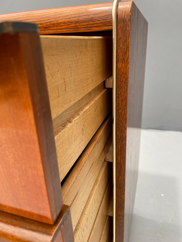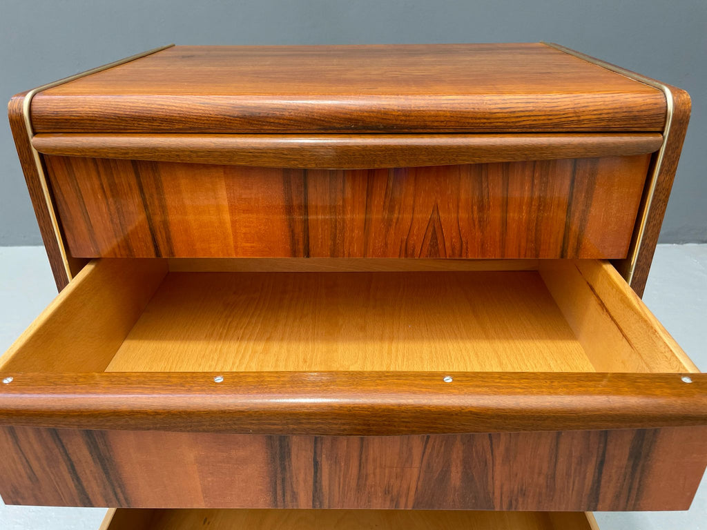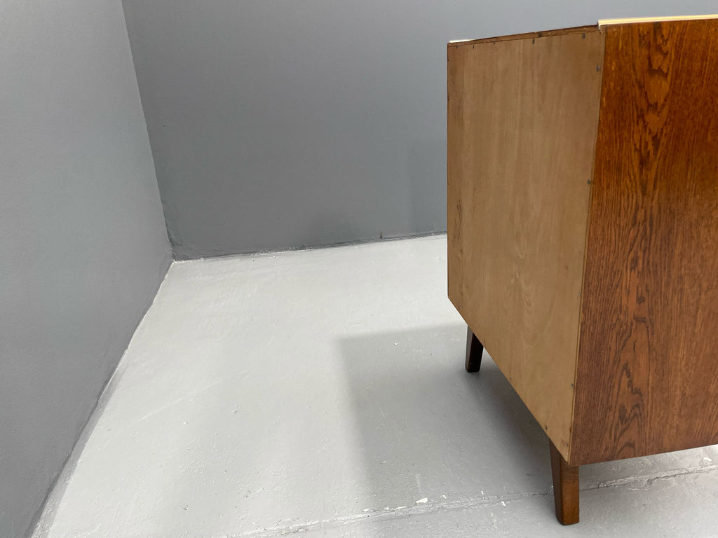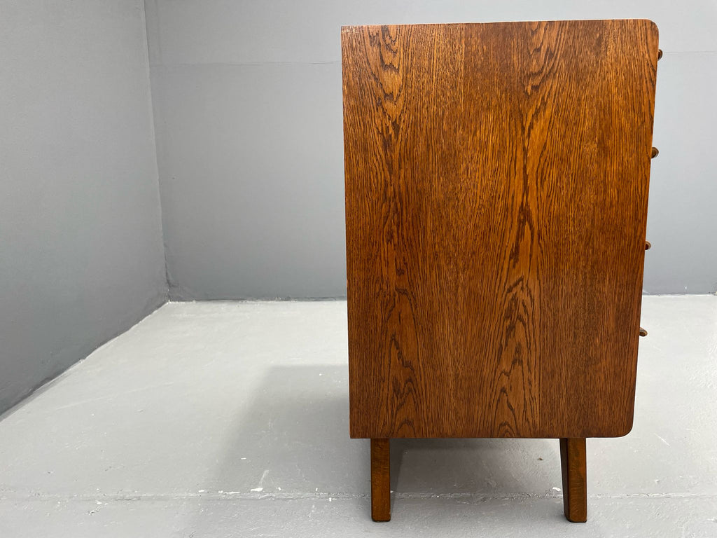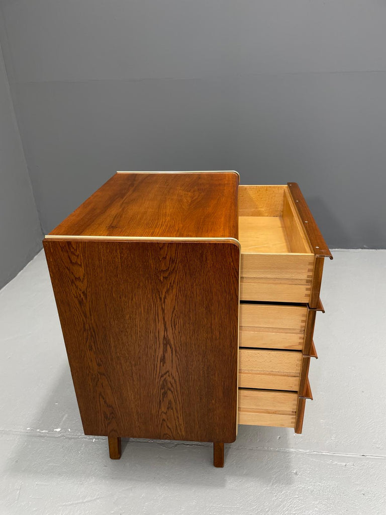 We offer an elegant chest of drawers from the 1960s, designed by Bohumil Landsman, a designer associated with the Czech furniture manufacturer Jitona. This piece exemplifies postwar Czechoslovak modernism — clean, compact form on angled legs, stripped of decoration, focused on function and form.