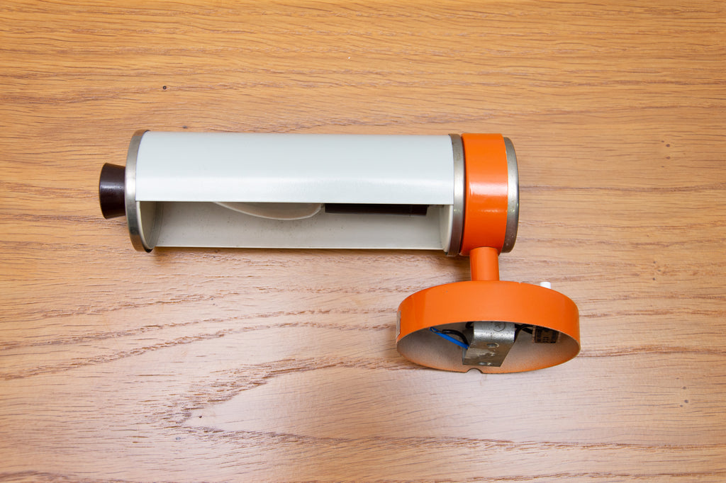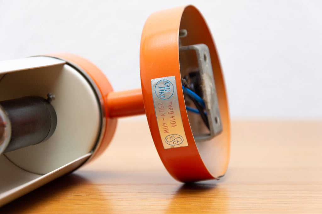 This wall lamp was designed by Josef Hurka in the 1960s. Material: plastic, aluminium, chrome. Lamp uses one E14 bulb.