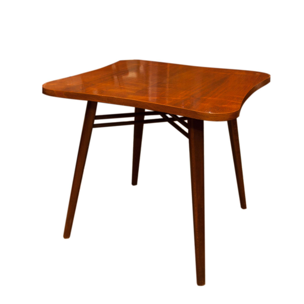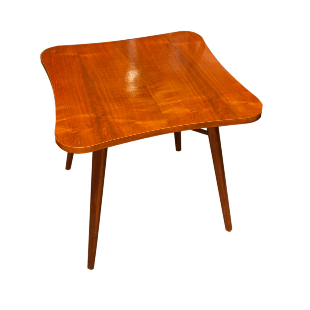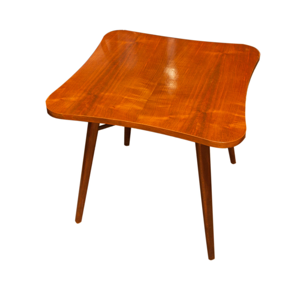 Designer coffee table, unconventional profile, 50s, Central Europe. Exceptionally well-preserved condition, Almost as new. Curved edges. polished veneer. Dimensions: Height 62 cm, tabletop 59x62 cm.