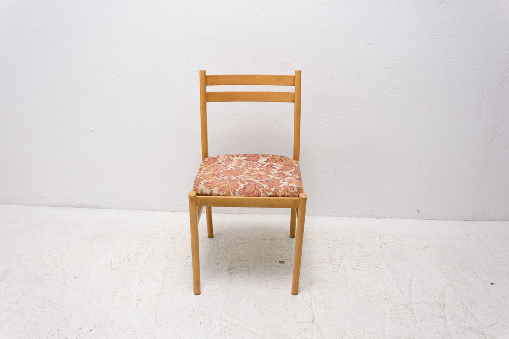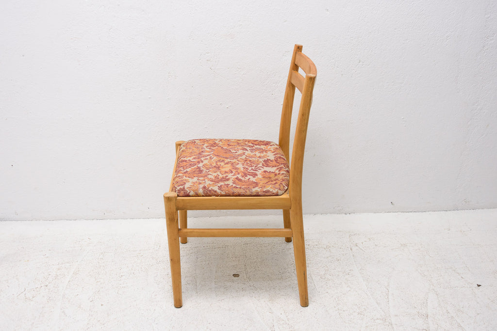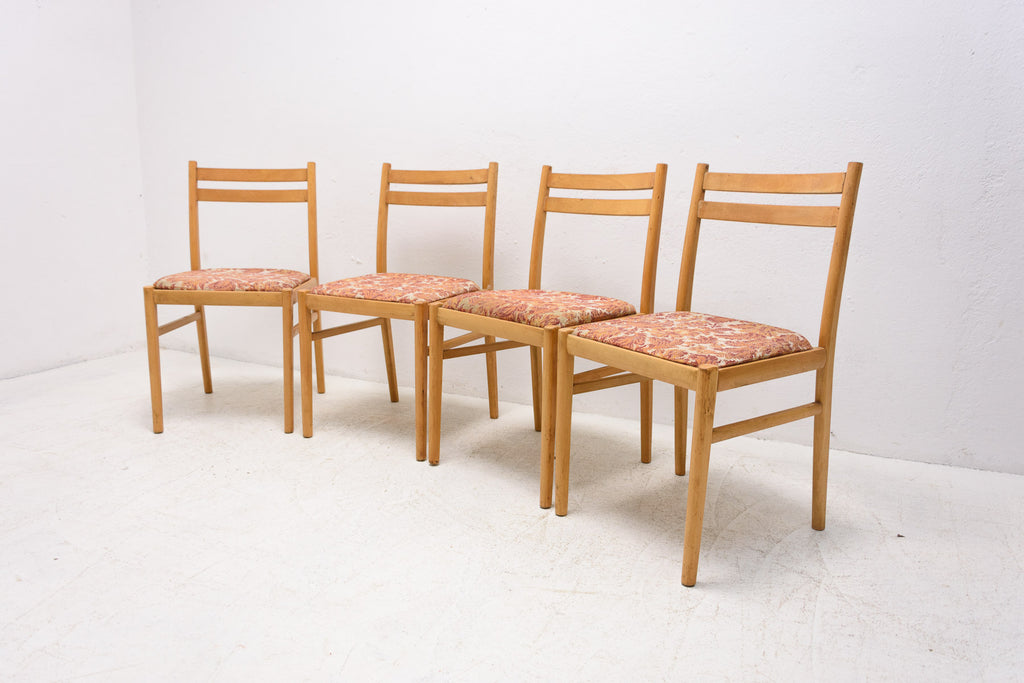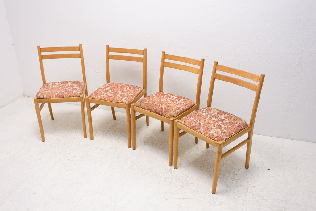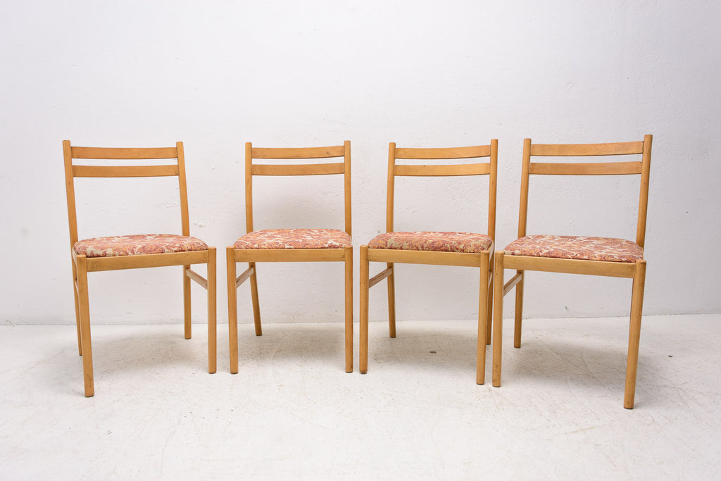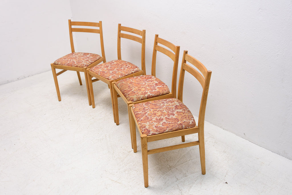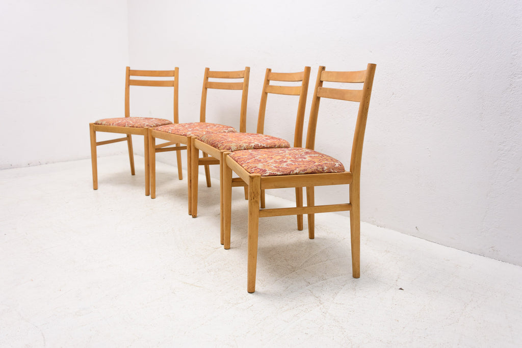 Mid century upholstered dining chairs, made in Czechoslovakia in the 1960´s. Beech wood, fabric. In good Vintage condition, without any damage, showing signs of age and using. Price is for the set of four.