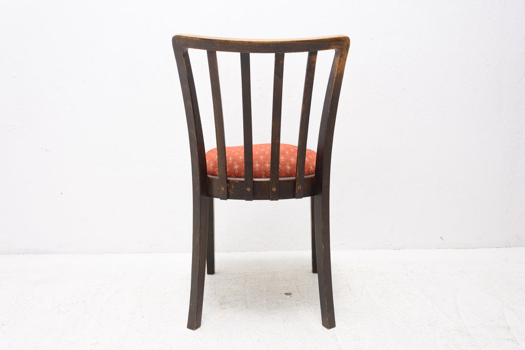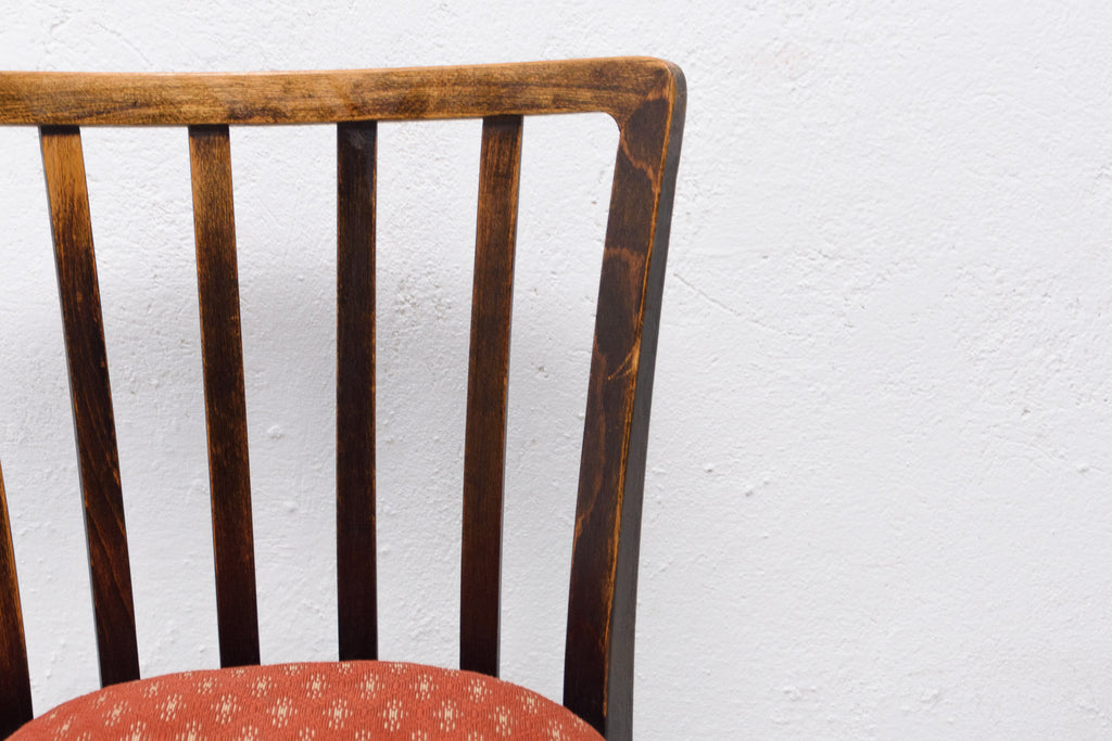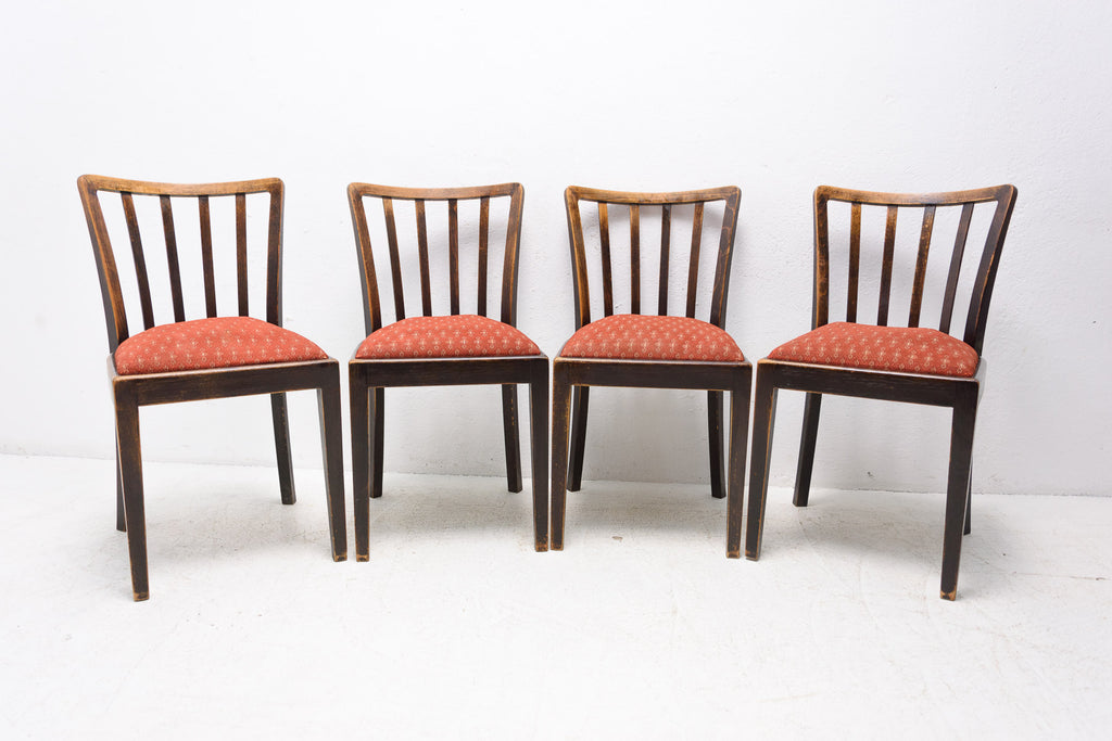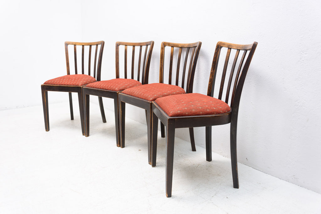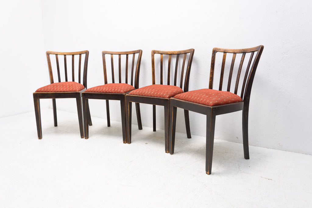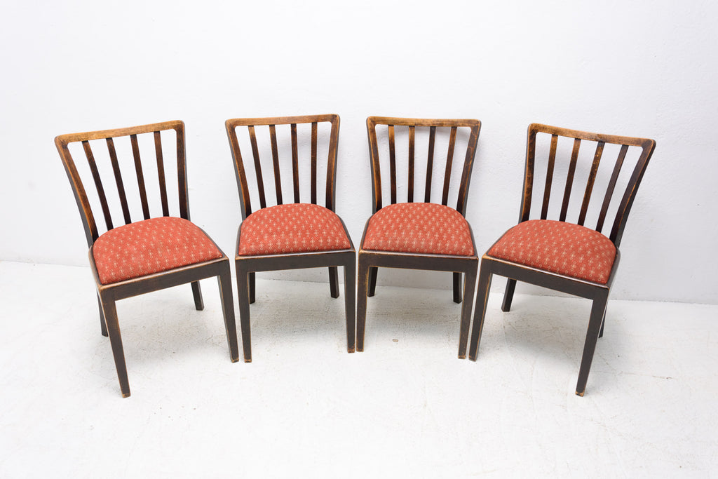 Set of four dining chairs, these were made in the former Czechoslovakia in the 1950´s . Made of beech wood and upholstered in fabric. The chairs are in good Vintage condition, with wear appropriate for the age of chairs. Price is for the set of four.