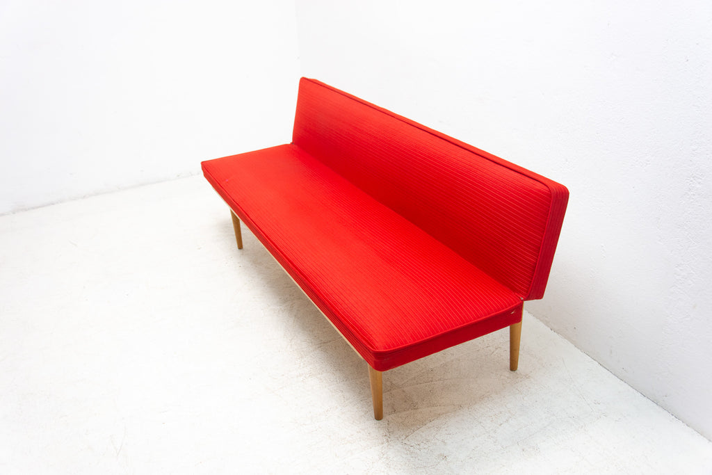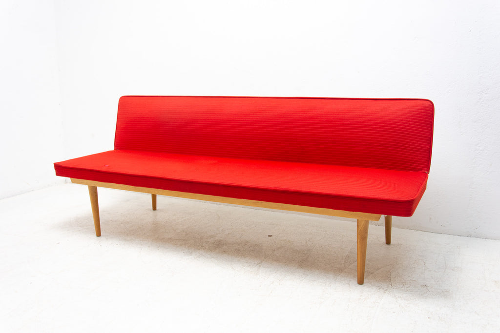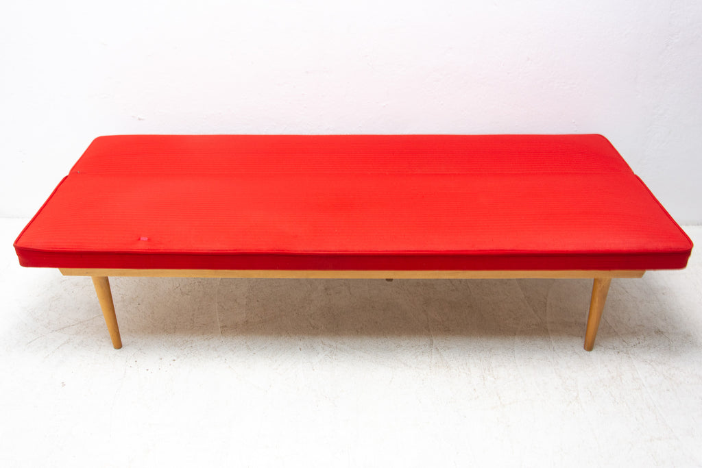 Mid century sofa/daybed, made in the former Czechoslovakia in the 1960´s, designed by Miroslav Navrátil. Material: beech wood, fabric. The sofa is in very good Vintage condition, the fabric has been sewn in one place in the past, but it´s almost invisible at the first sight.