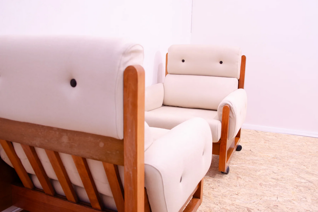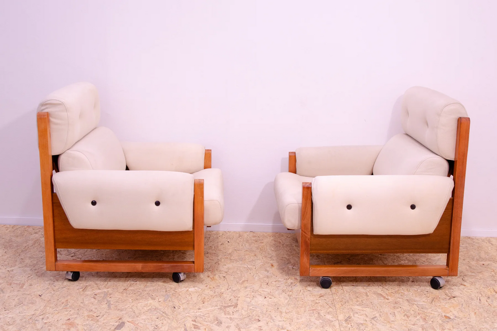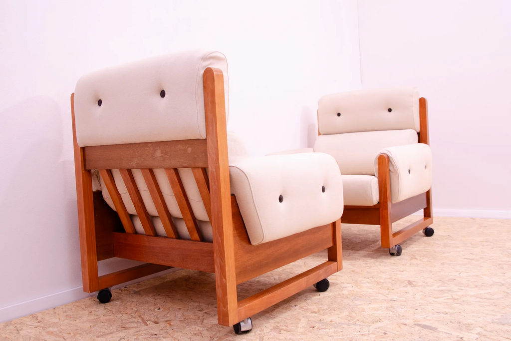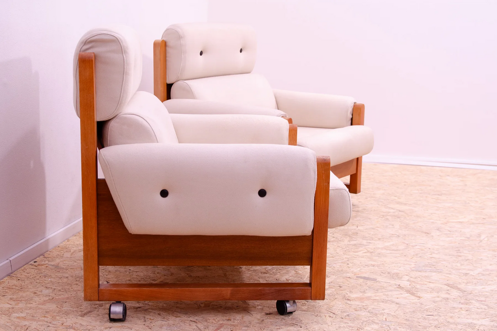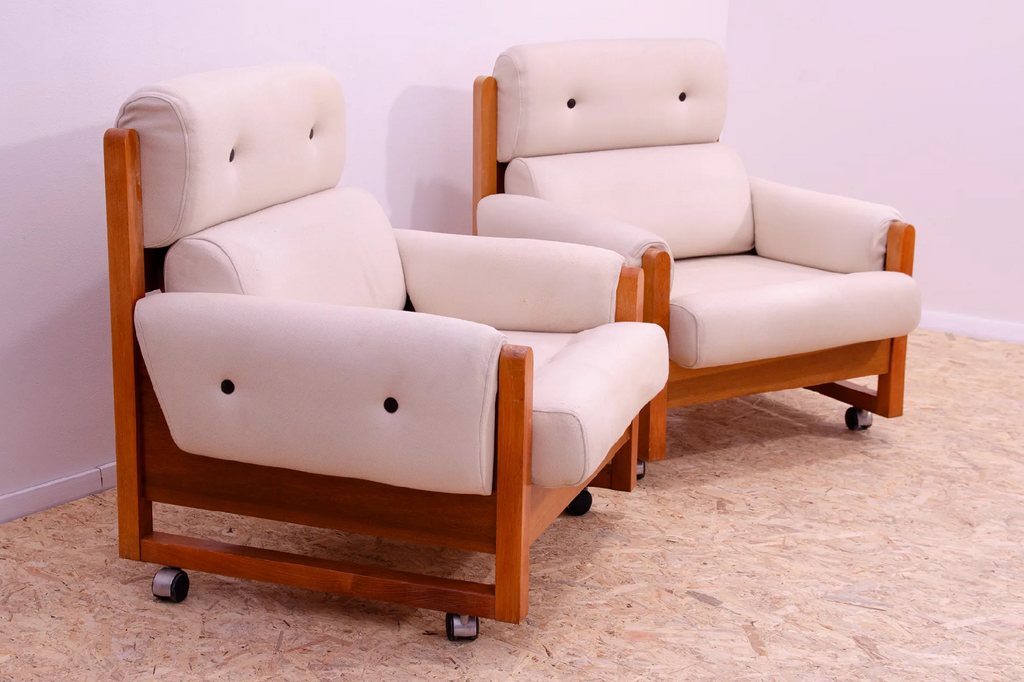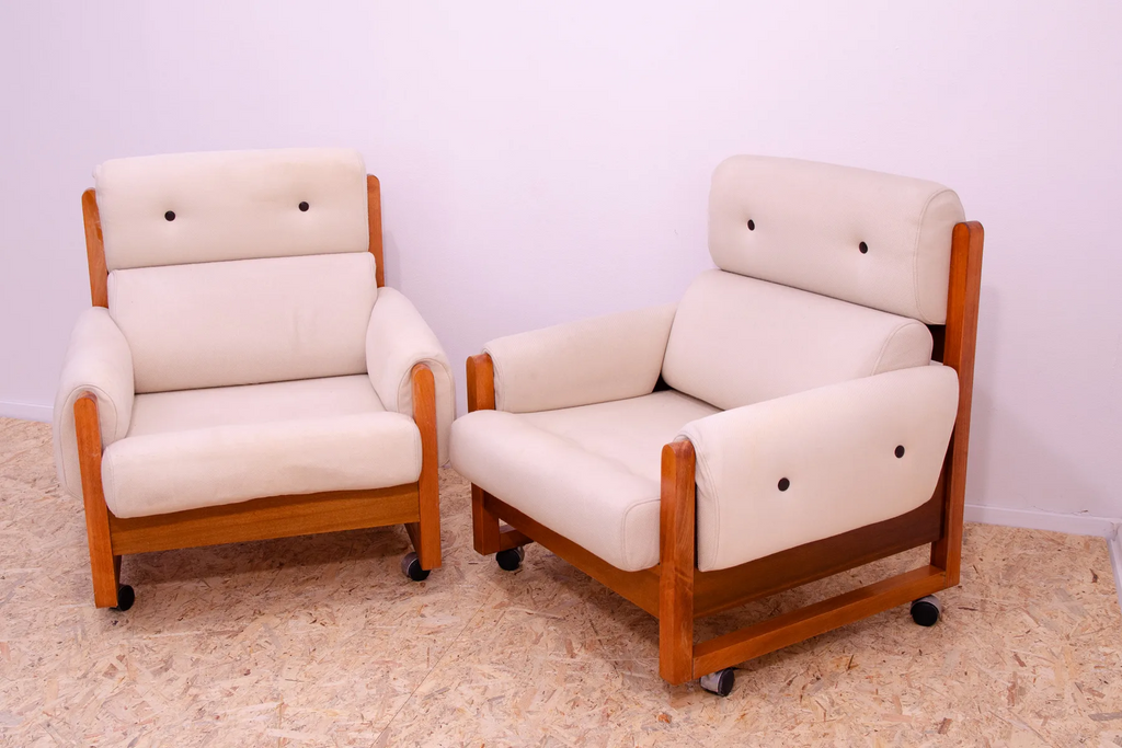 This lounge Scandinavian style armchairs were made in the 1970´s. It is upholstered with fabric. The structure is made of beech wood and the furniture stands on metal wheels. All in very good Vintage condition, shows slight signs of age and use. Price is for the pair.