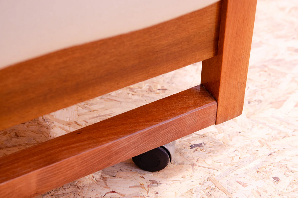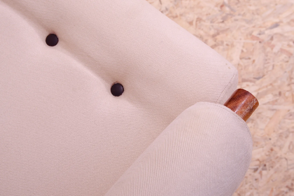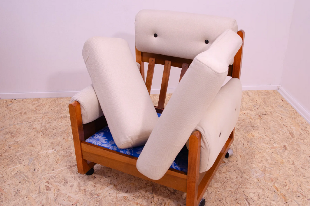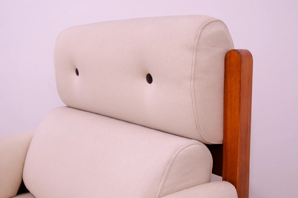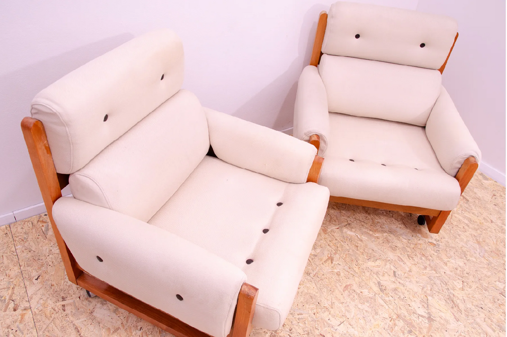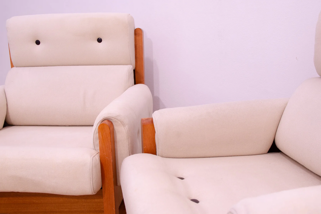 This lounge Scandinavian style armchairs were made in the 1970´s. It is upholstered with fabric. The structure is made of beech wood and the furniture stands on metal wheels. All in very good Vintage condition, shows slight signs of age and use. Price is for the pair.