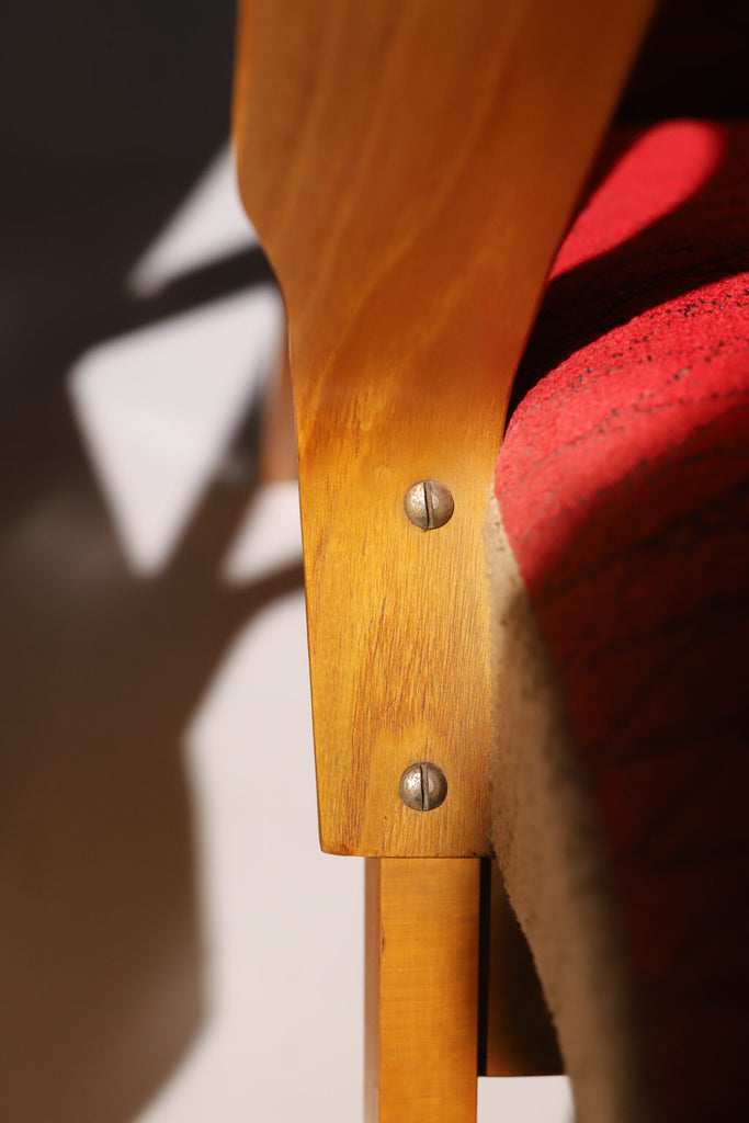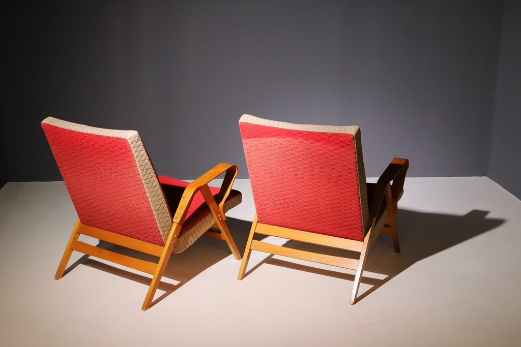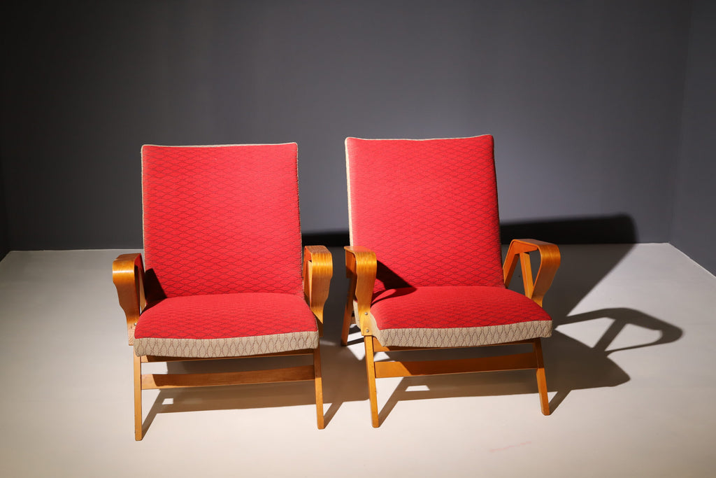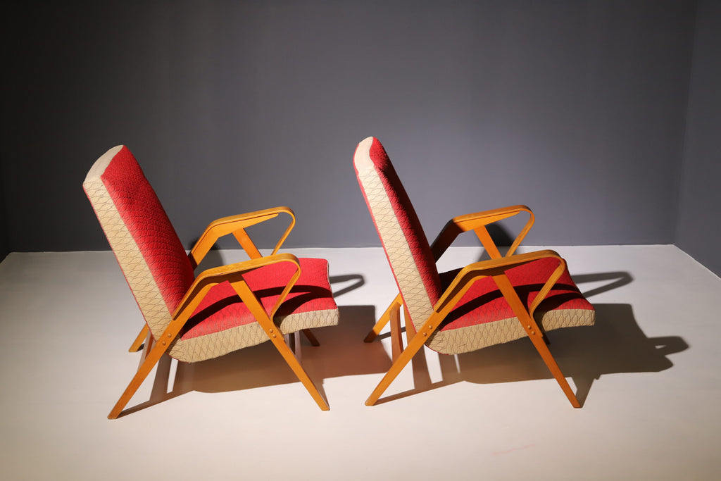 Pair of a popular occasional bentwood armchairs designed by Frantisek Jirák for Tatra nábytok, made in the former Czechoslovakia in the 1970´s. It´s made of beechwood and plywood, upholstery. In good Vintage condition, shows signs of age and use.
