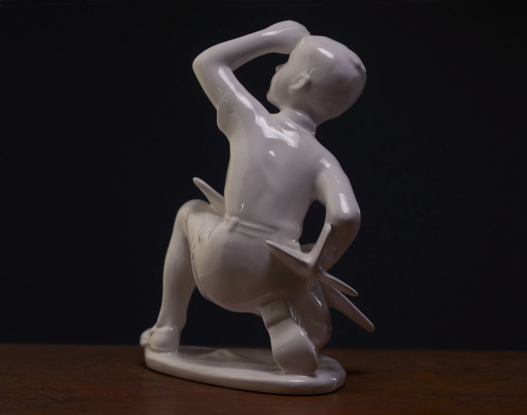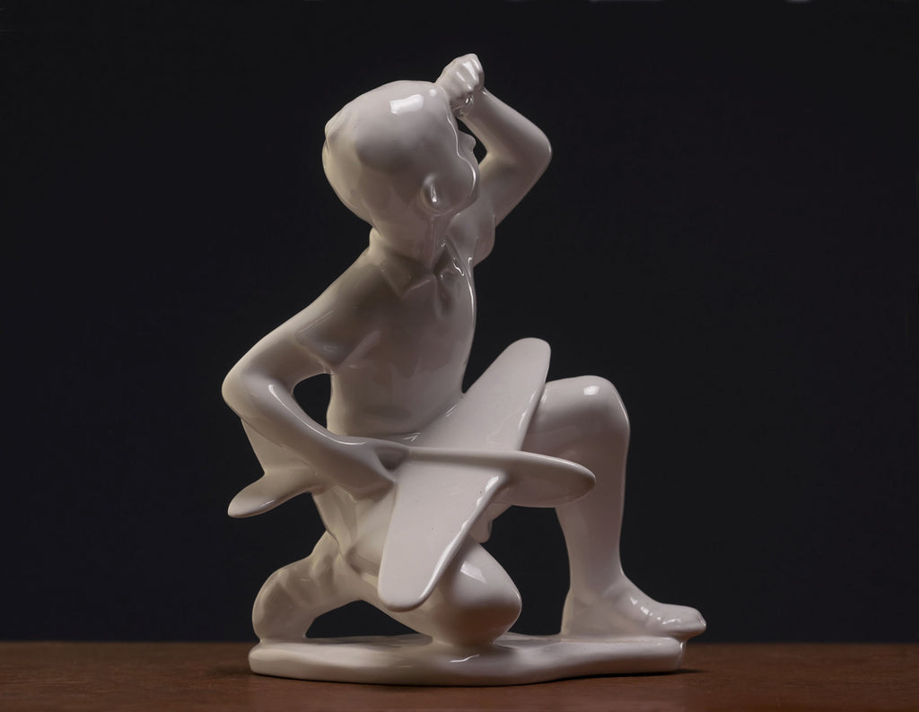 This ceramic figurine was produced in the 1950s by F. Pexider & Co., a noted fireclay stove and ceramics manufacturer in Letovice. The piece represents a young boy holding a toy airplane, a motif typical of postwar Czech decorative sculpture.