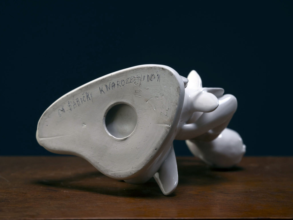Made of glazed ceramics, the statuette remains in undamaged, well-preserved condition. The surface shows the characteristic finish of mid-century Czech ceramic production, with subtle age-appropriate patina.