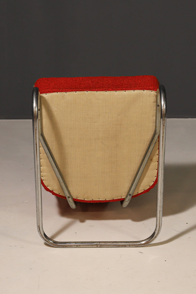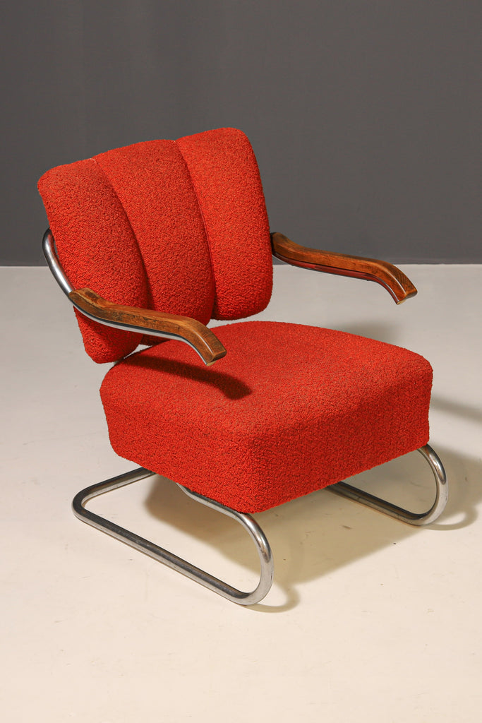 This S-411 functionalist armchair was produced in the 1940s–1950s by Kovona, Brandýs nad Orlicí. The chrome cantilever frame provides light flexibility, ensuring a comfortable seating experience.