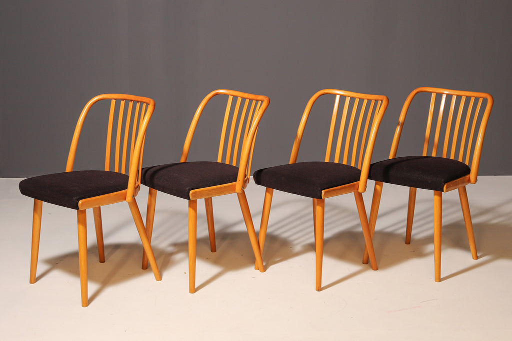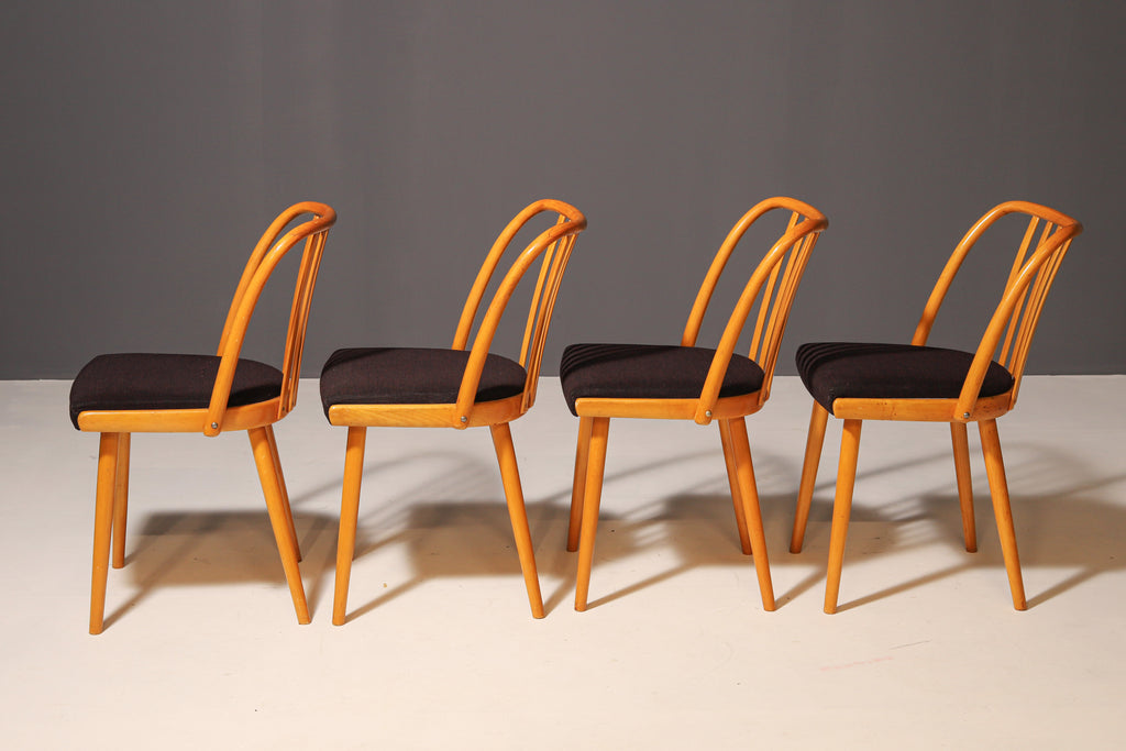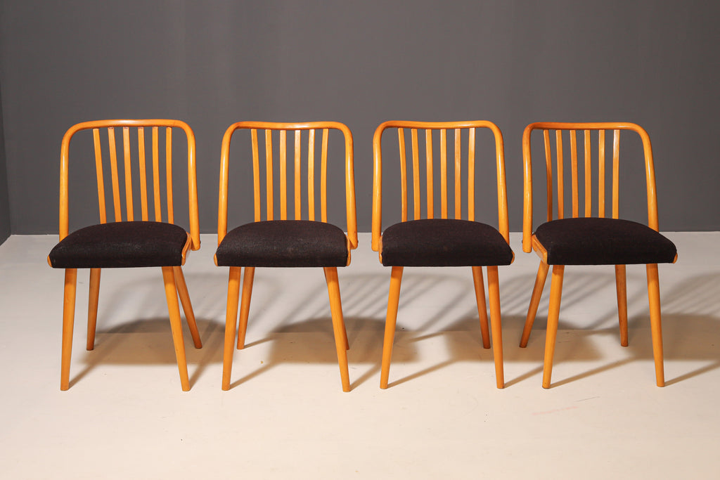 This set of four elegant wooden chairs was designed by the renowned Czech designer Antonín suman. His work is characterized by simple yet thoughtful lines and high-quality craftsmanship, which is evident in this timeless design.