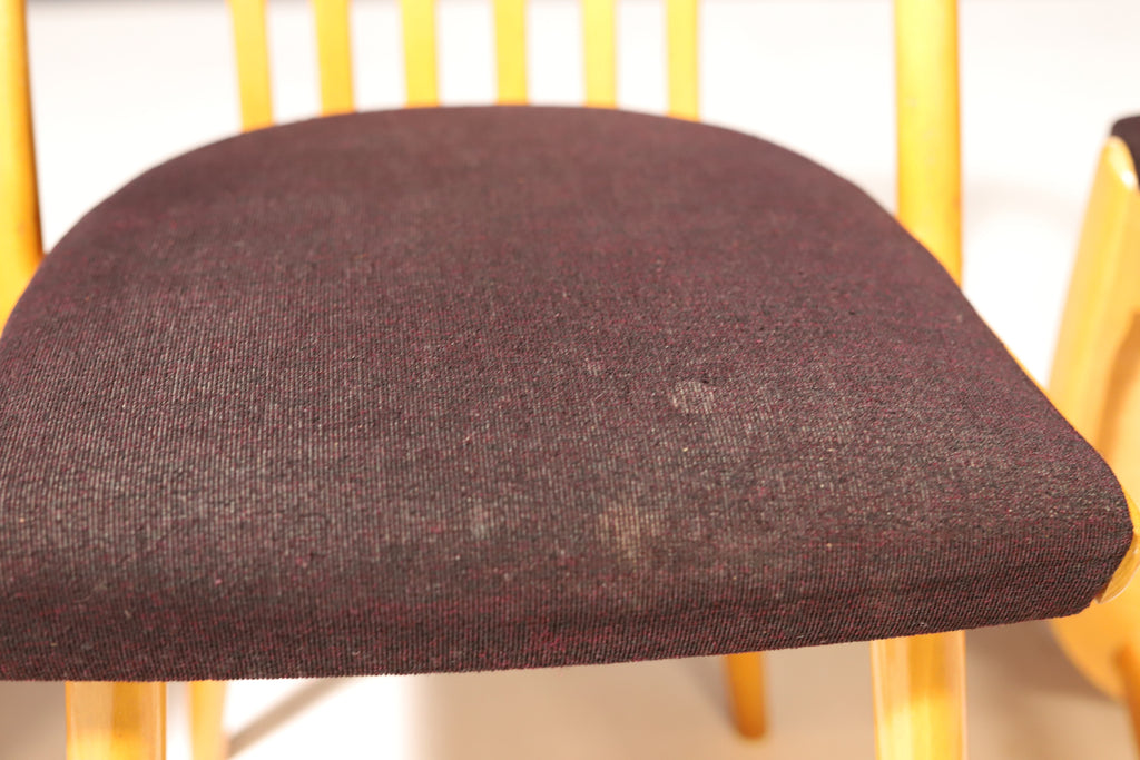 The chairs are made of solid wood, ensuring stability and long-lasting durability. The backrest features delicately shaped vertical slats, giving the chairs an airy and lightweight appearance. The comfortably upholstered seat provides seating comfort, though the fabric shows some signs of wear. Despite this, the overall condition of the chairs is very good, with a sturdy and stable wooden frame.
