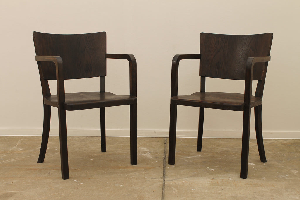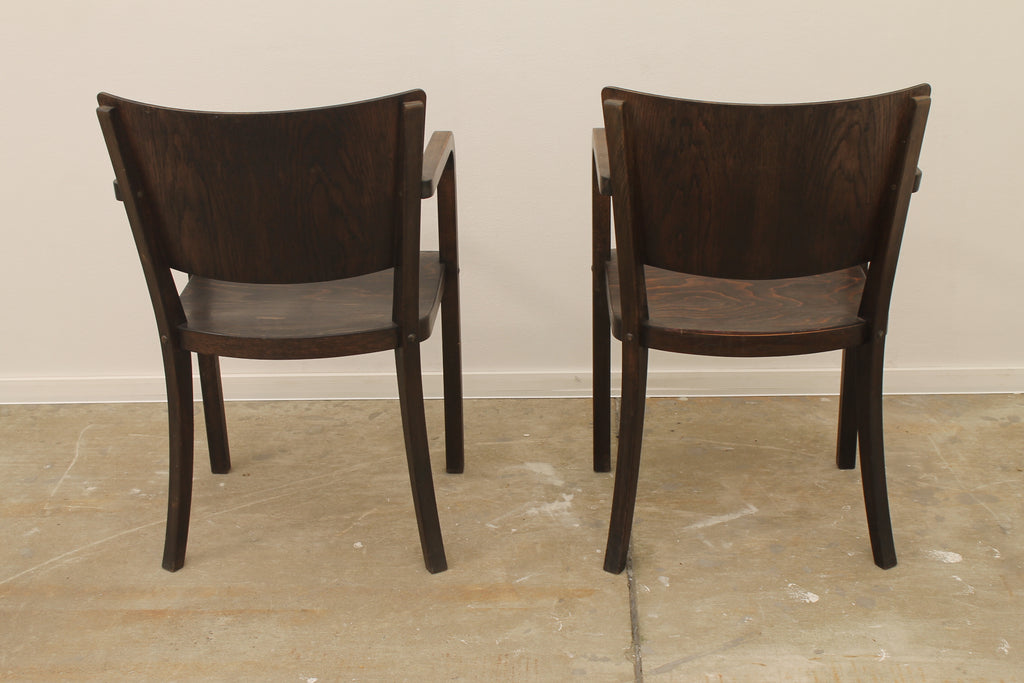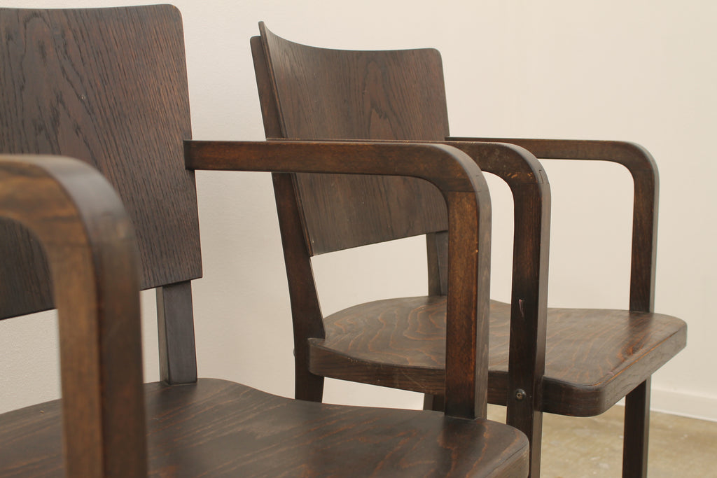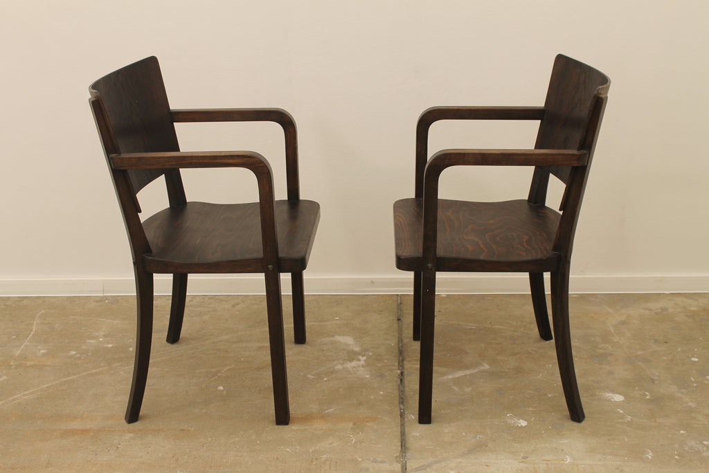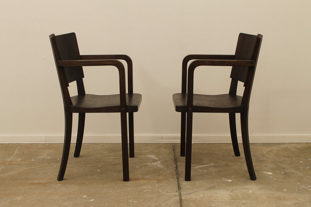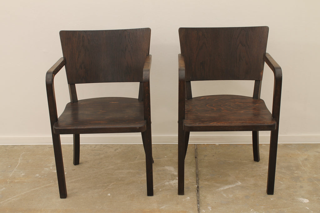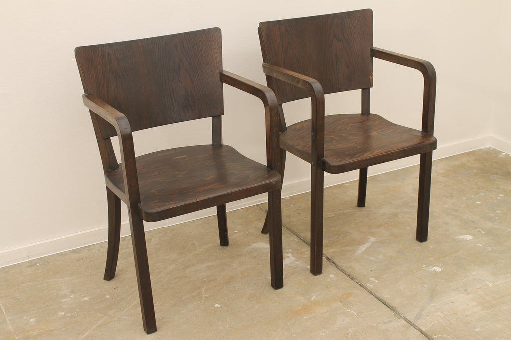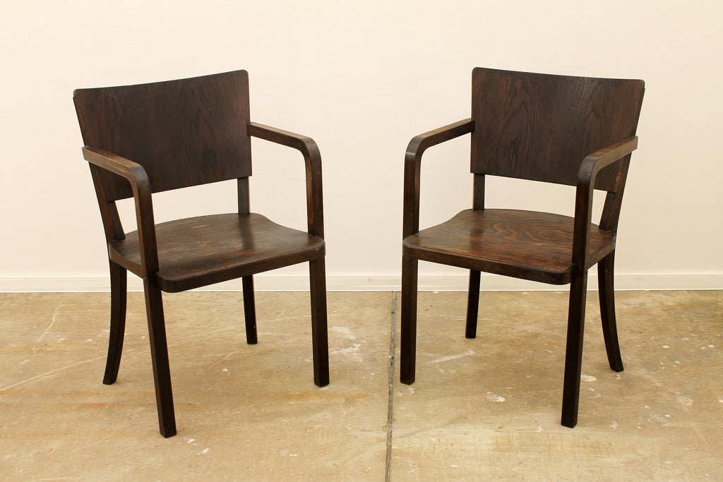 These midcentury armchairs were made in the former Czechoslovakia in the 1950´s. Made of dark stained beechwood. Can be used as office chairs or writing desk chairs. They are in very good Vintage condition, showing slight signs of age and using.
