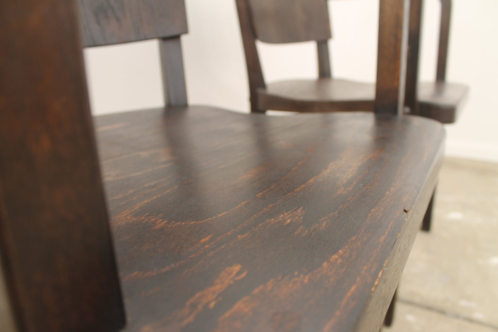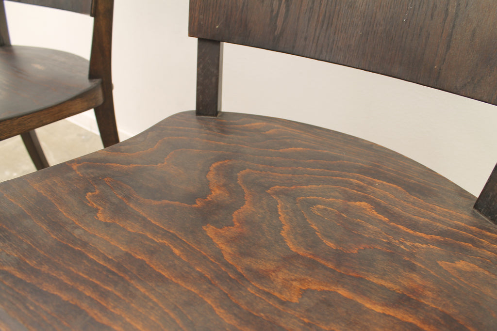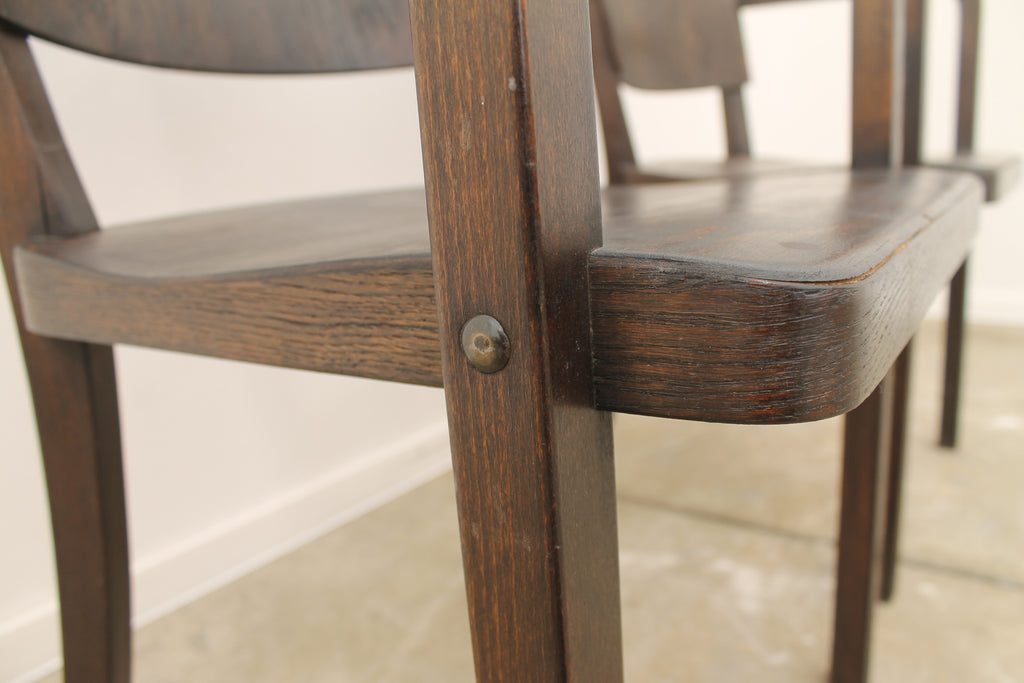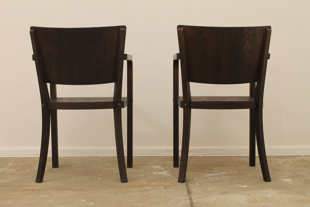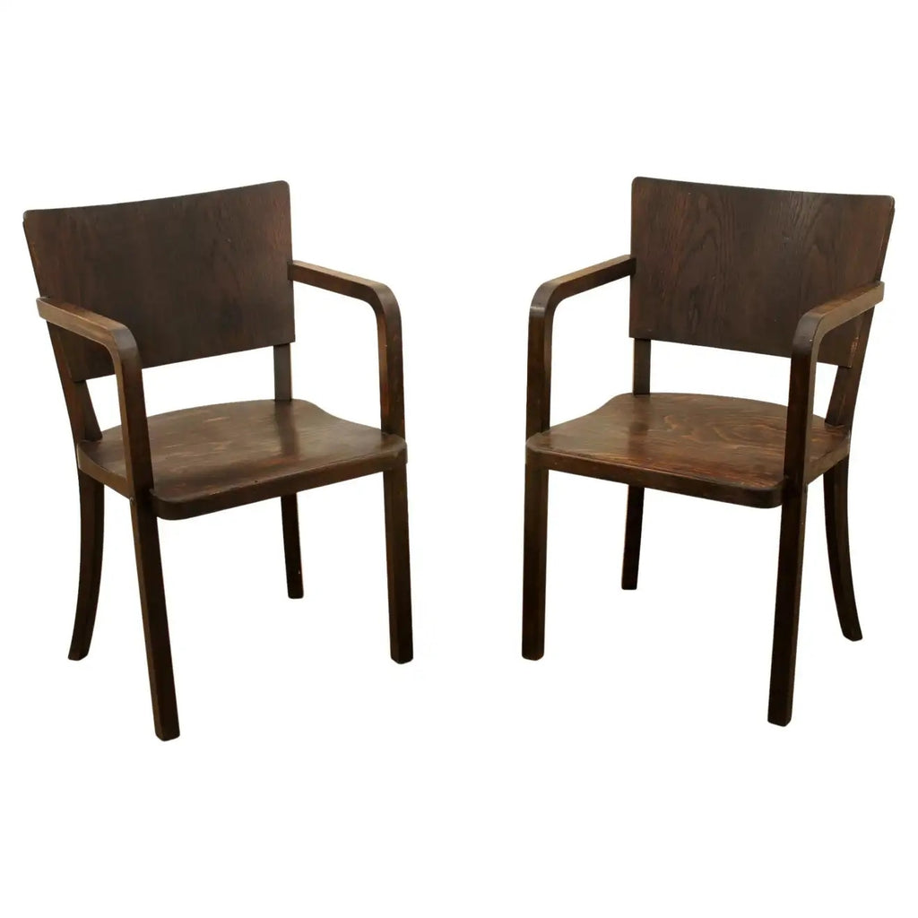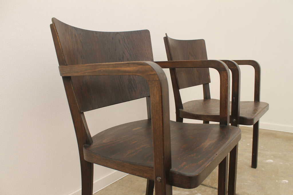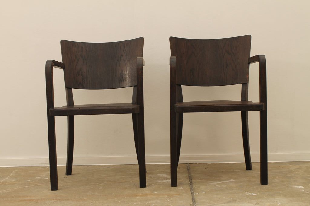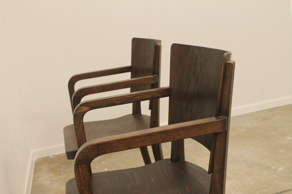 These midcentury armchairs were made in the former Czechoslovakia in the 1950´s. Made of dark stained beechwood. Can be used as office chairs or writing desk chairs. They are in very good Vintage condition, showing slight signs of age and using.