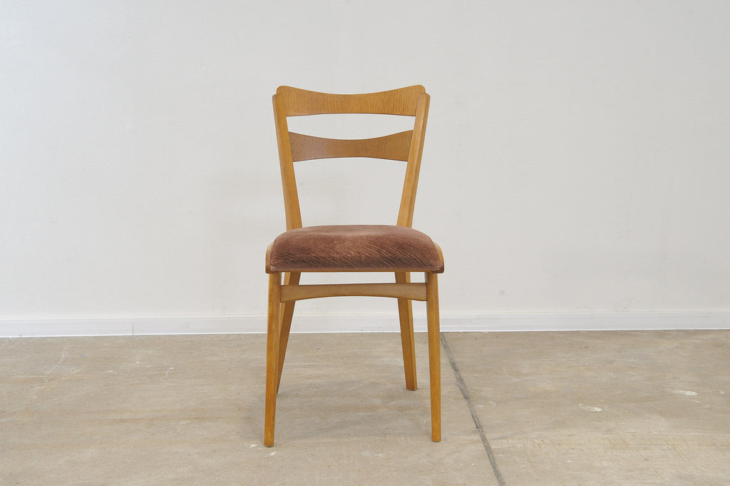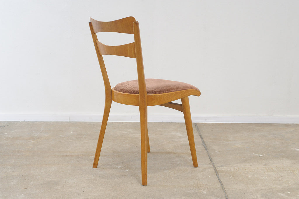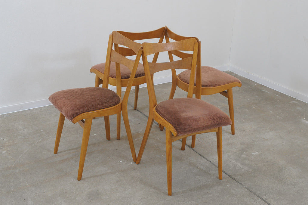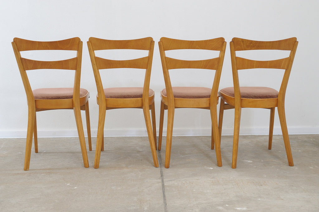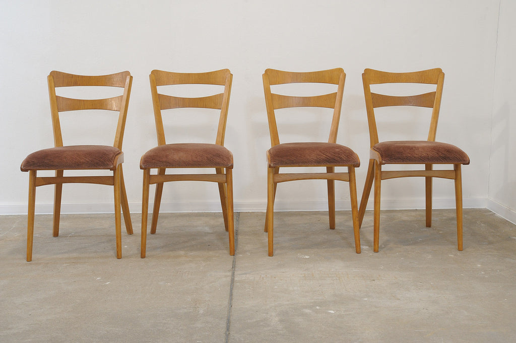 Set of four midcentury upholstered dining chairs, made in the former Czechoslovakia by Tatra nábytok company in the 1960s. The chairs are constructed of beech wood. Very interesting shaping. The upholstery and wood are in very good condition. Price is for the set of 4.