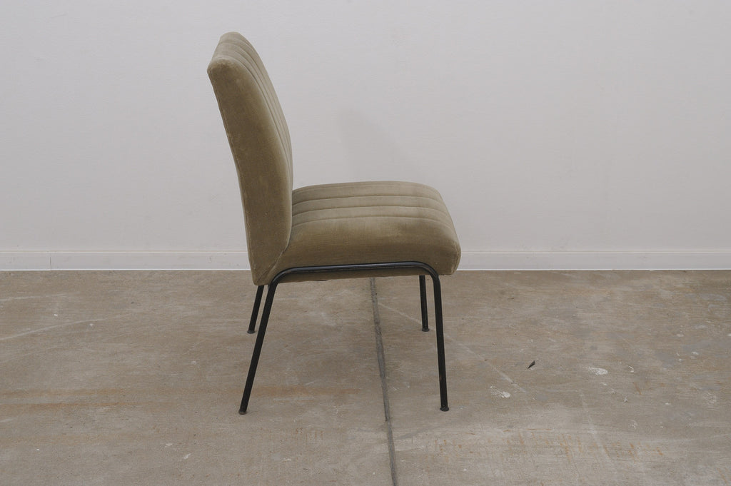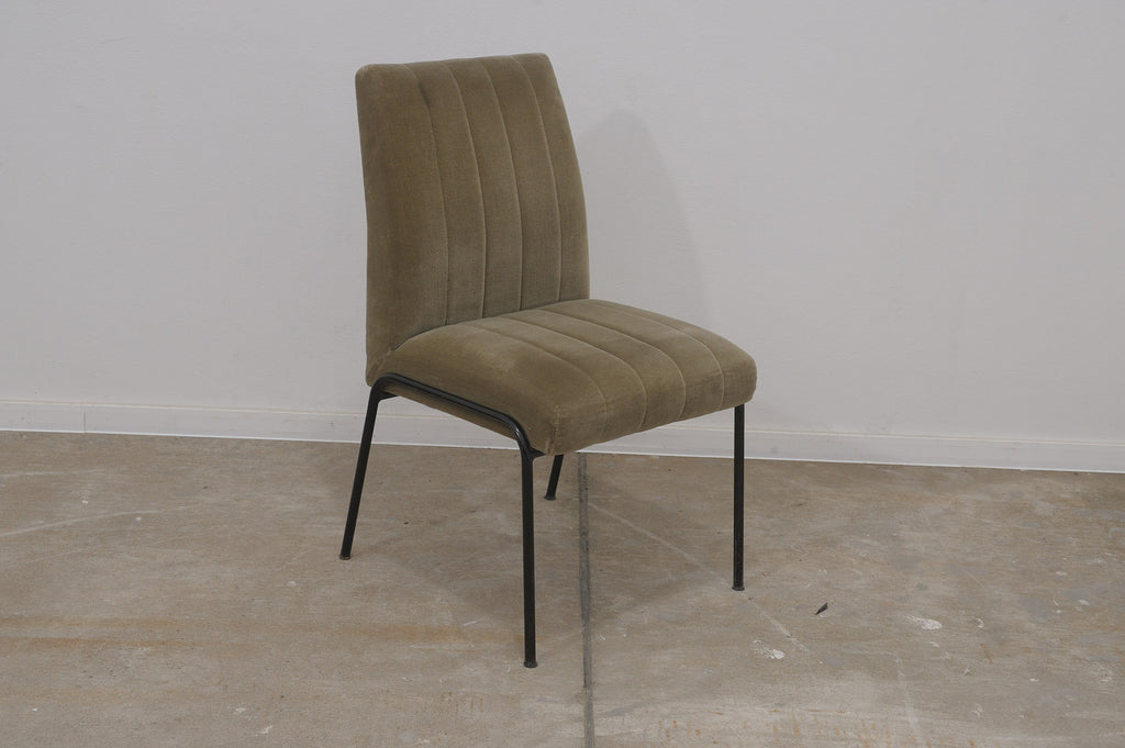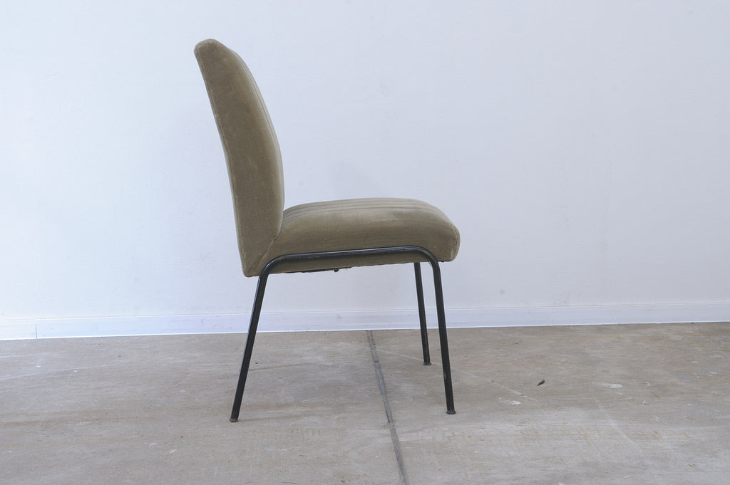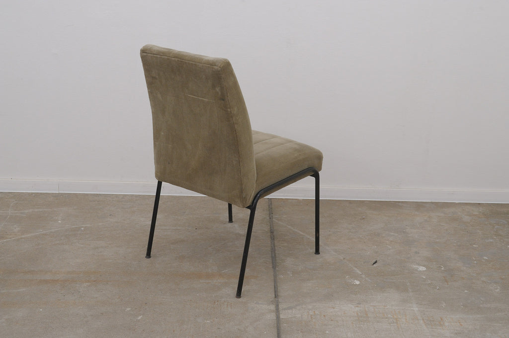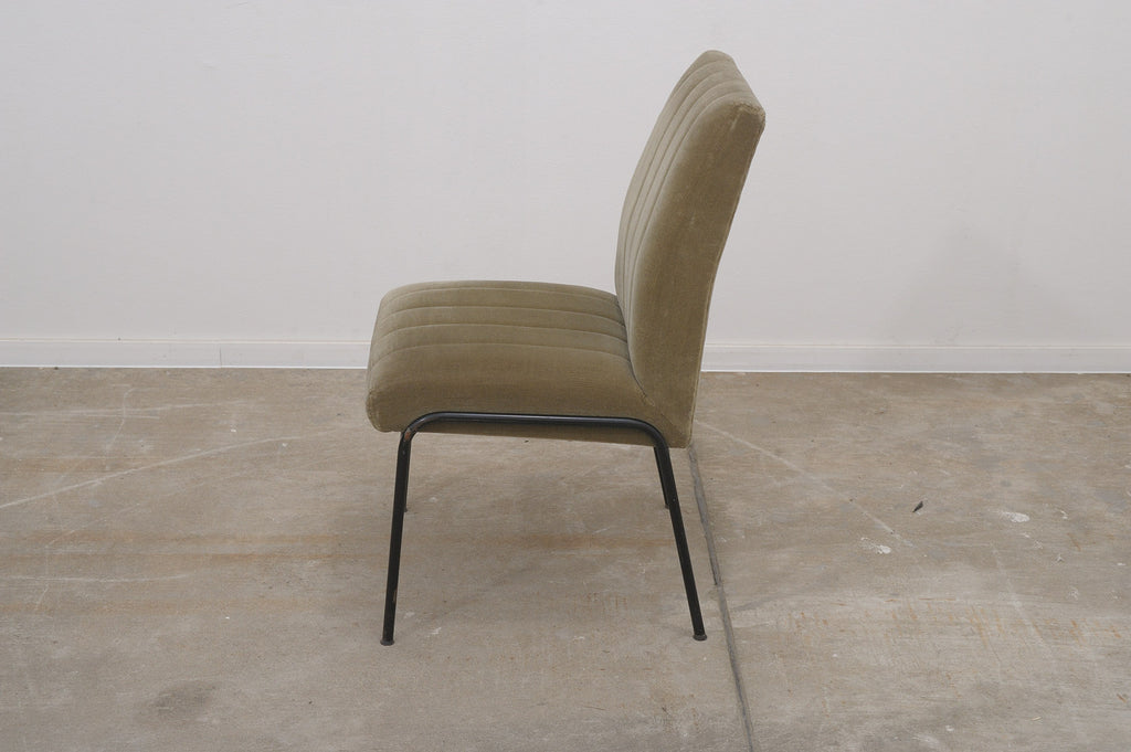 Set of four upholstered chairs from the 1960s. Interestingly curved seat backs. The chairs reminds works of Piere Guariche. Upholstery in good Vintage condition. Metal construction. Chairs bears some signs of use and age.