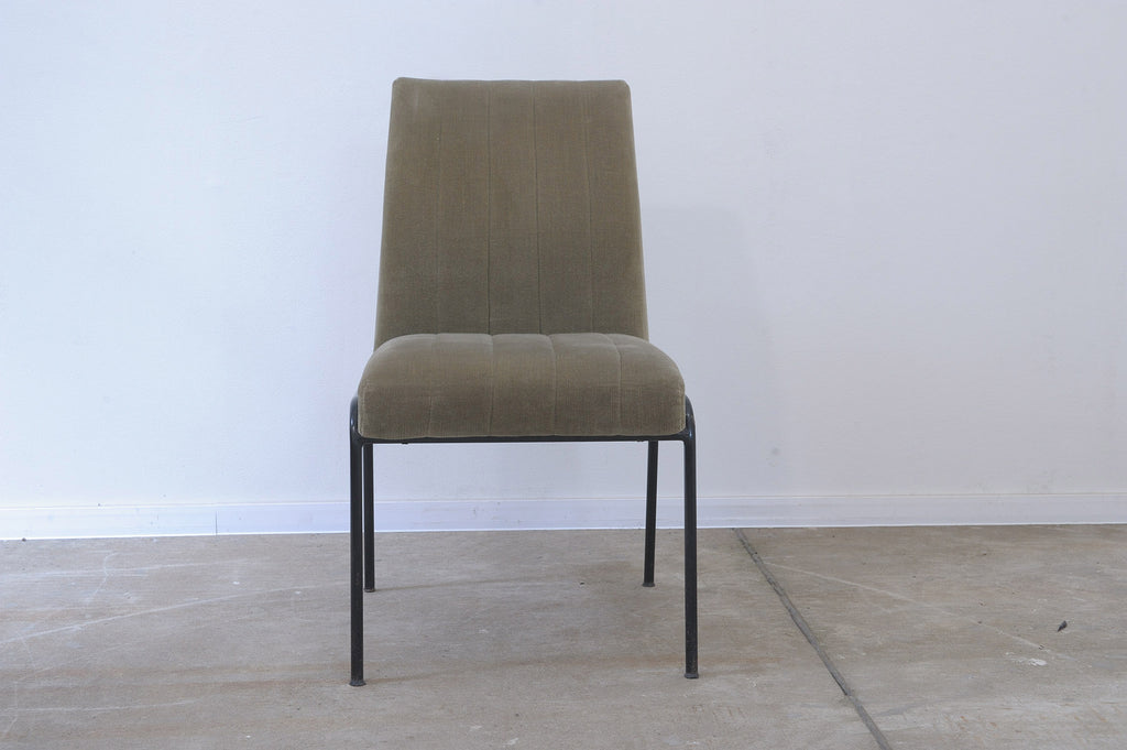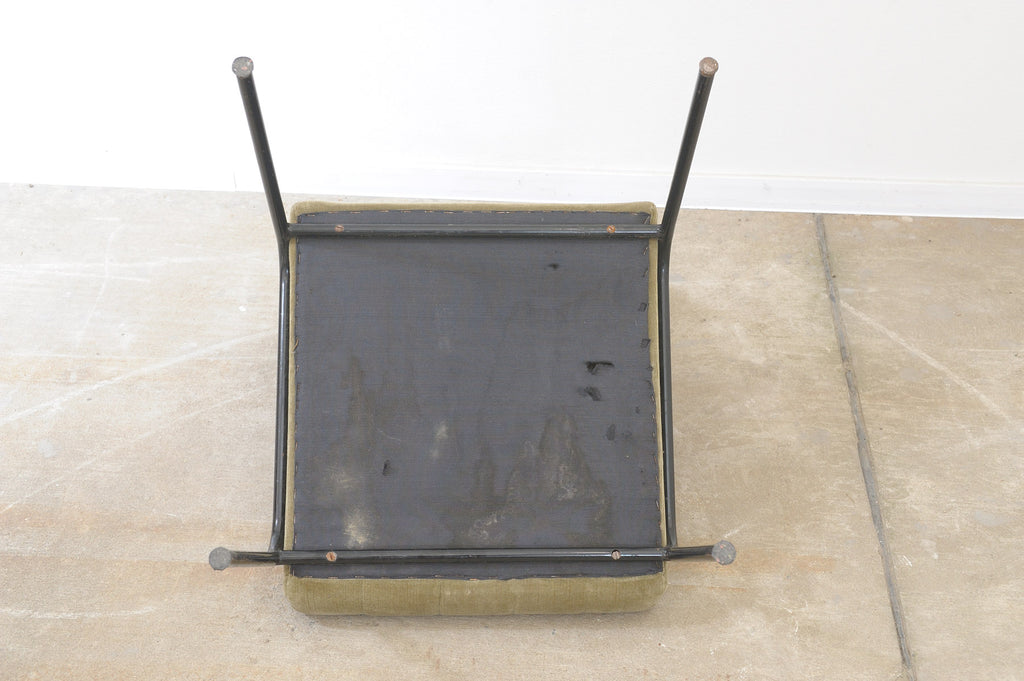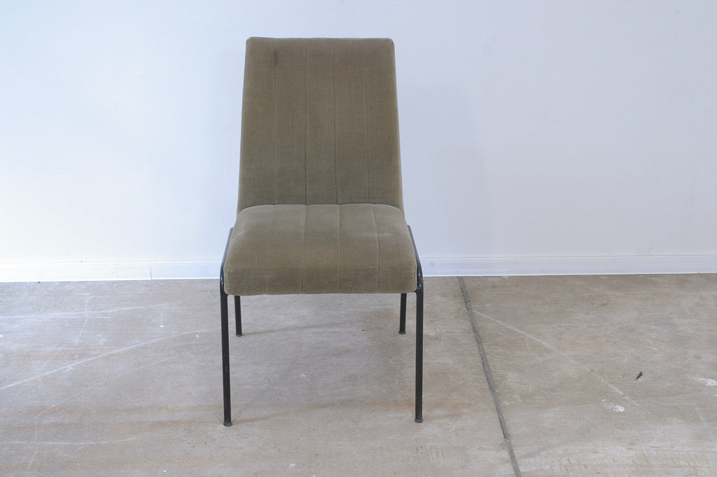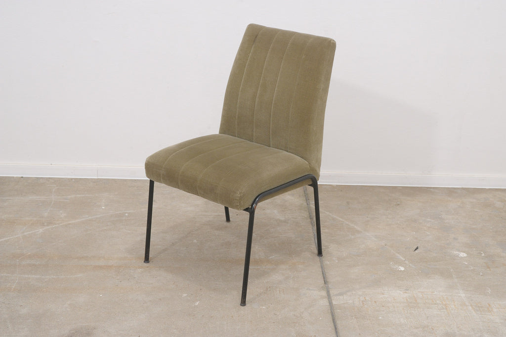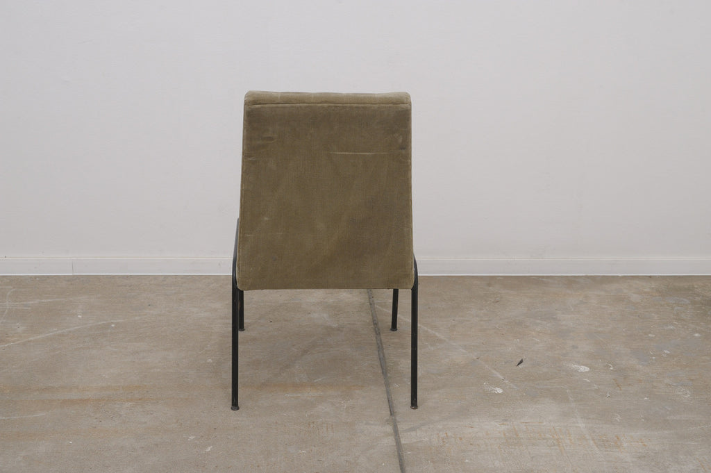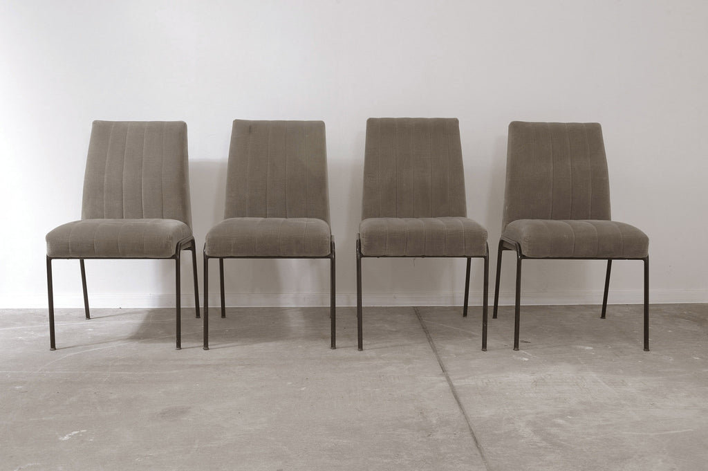 Set of four upholstered chairs from the 1960s. Interestingly curved seat backs. The chairs reminds works of Piere Guariche. Upholstery in good Vintage condition. Metal construction. Chairs bears some signs of use and age.