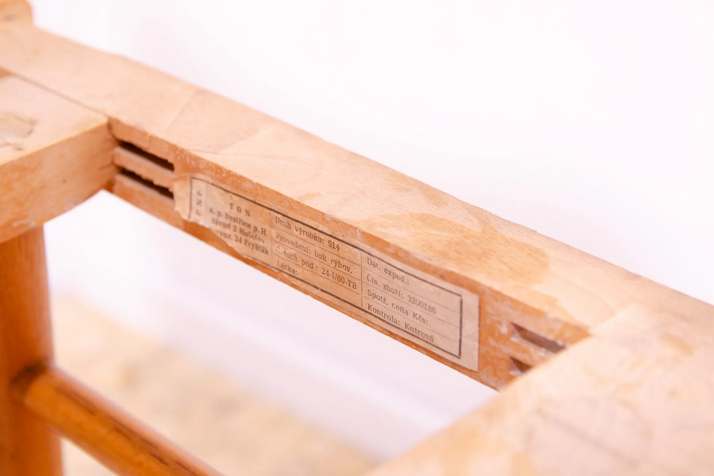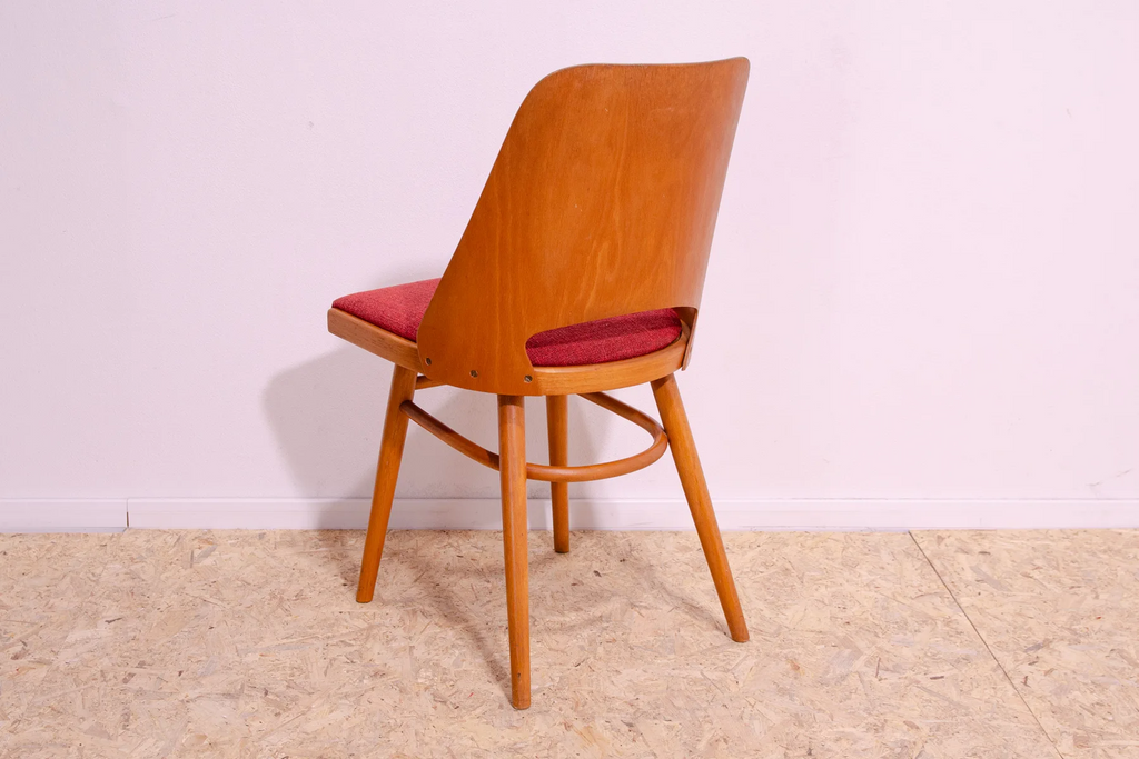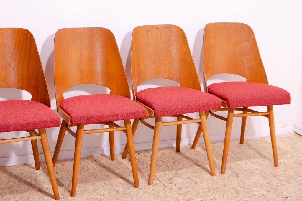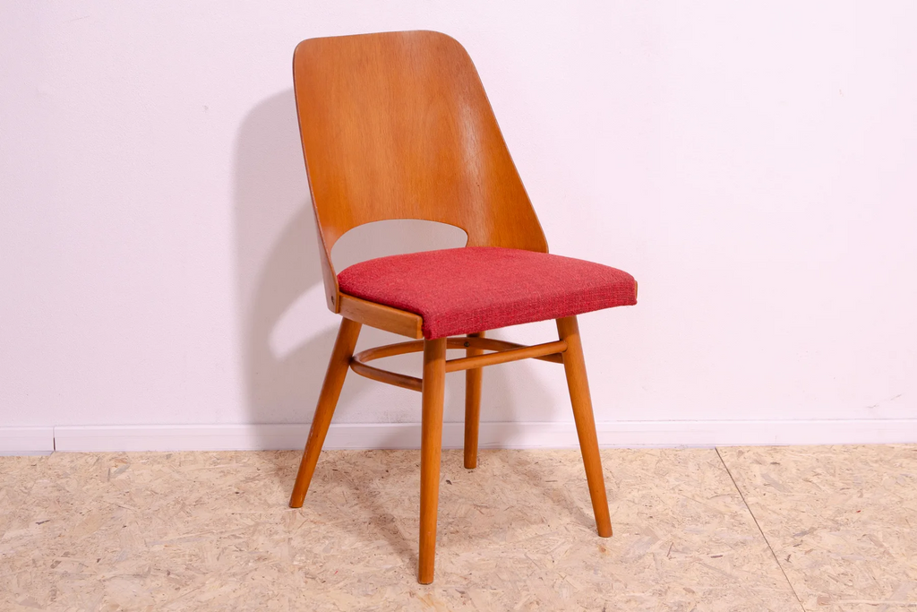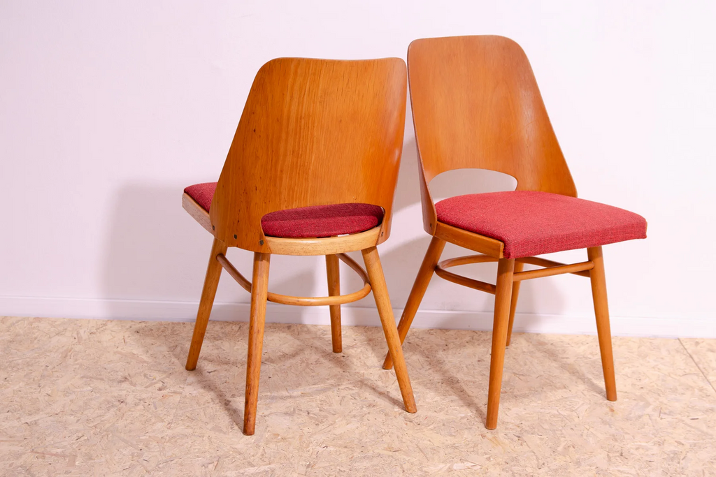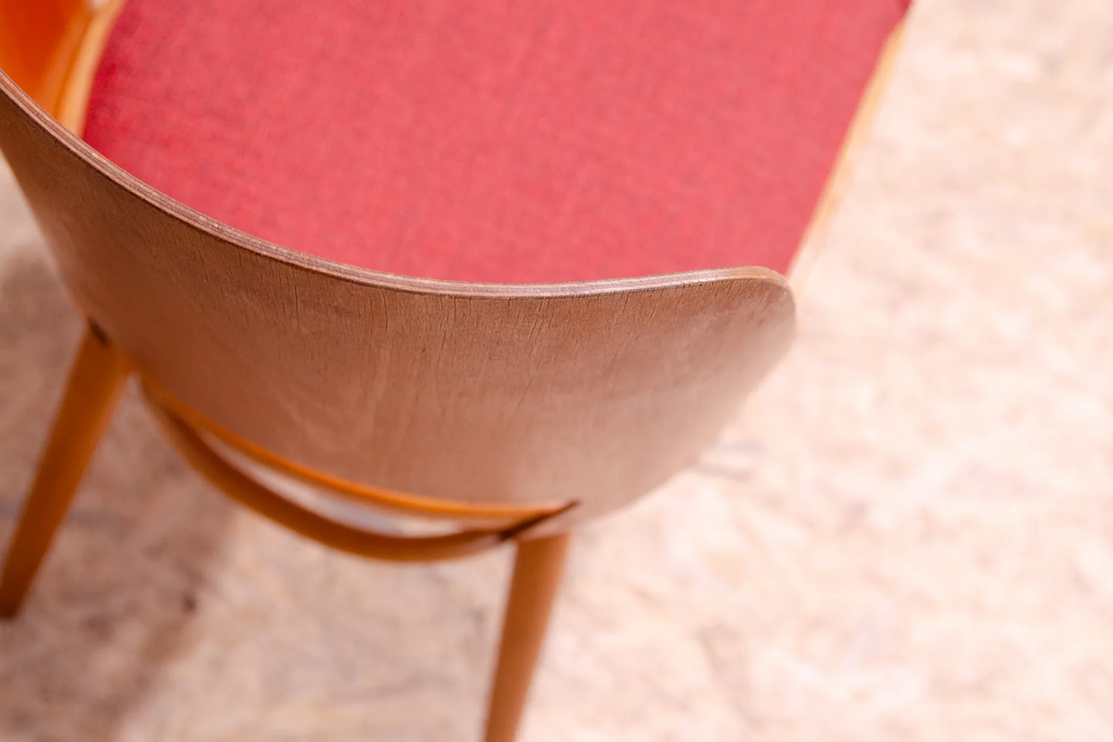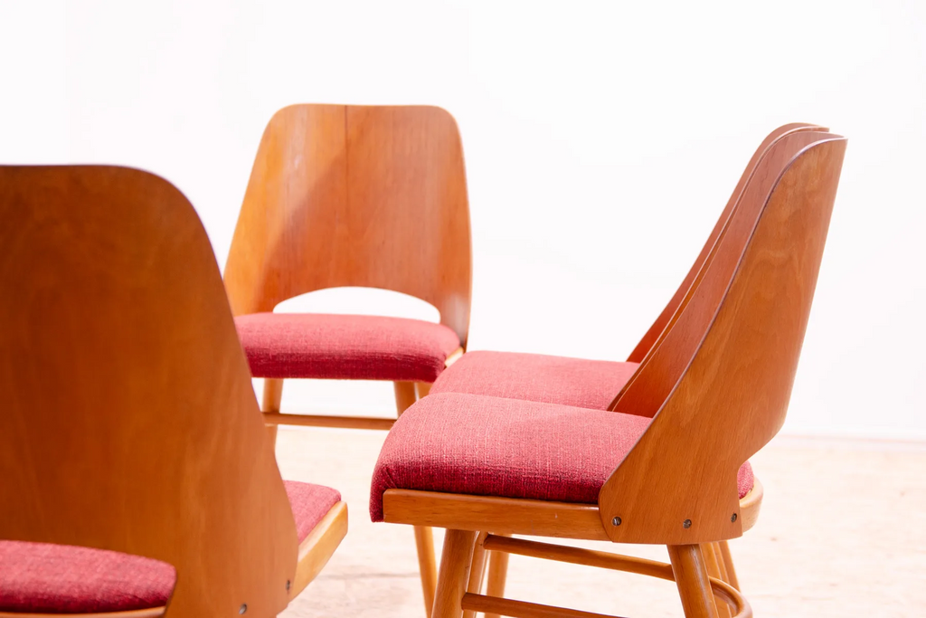 An interesting model of mid century bentwood dining chairs. Designed by Radomír Hofman for TON Bystřice pod Hostýnem (Thonet successor in Czechoslovakia after World War 2) . They were made in the former Czechoslovakia in the 1960´s. The chairs are made of bent plywood, have beech wood structure and are upholstered with fabric.