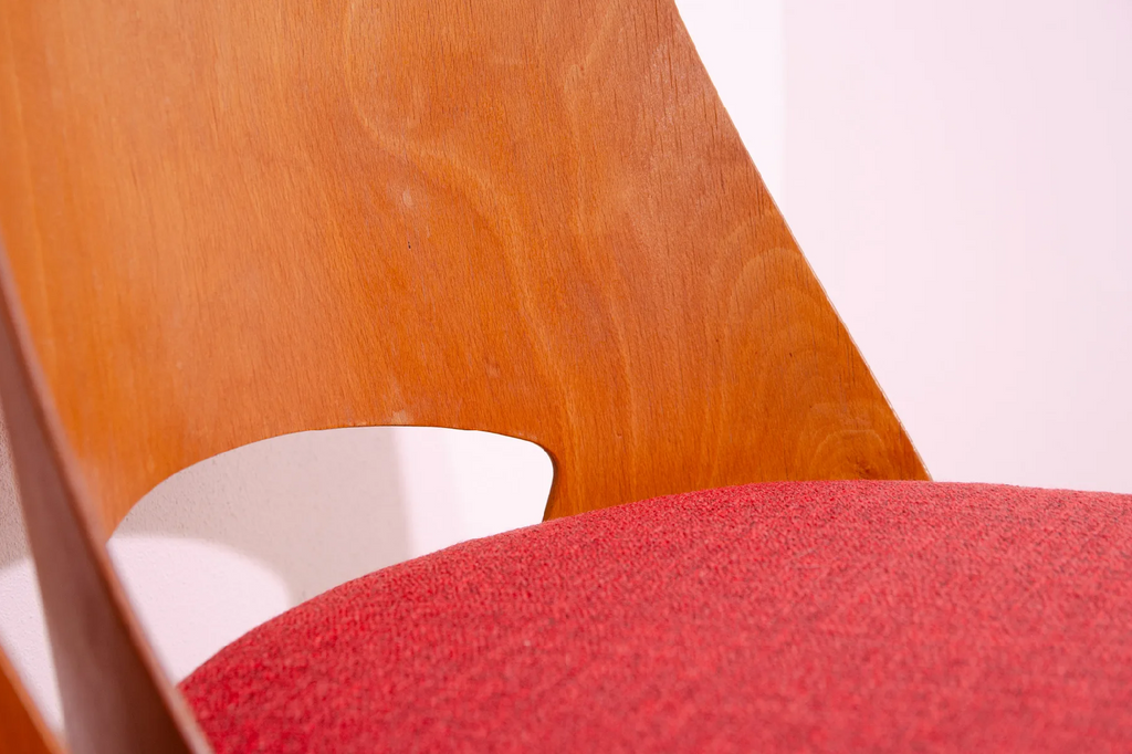 An interesting example of Czechoslovak design after the huge success of the Czechoslovak pavilion at Expo 58 in Brussels. The chairs are overall in very good Vintage condition, the wood shows signs of age and using, the seats have a new fabric.