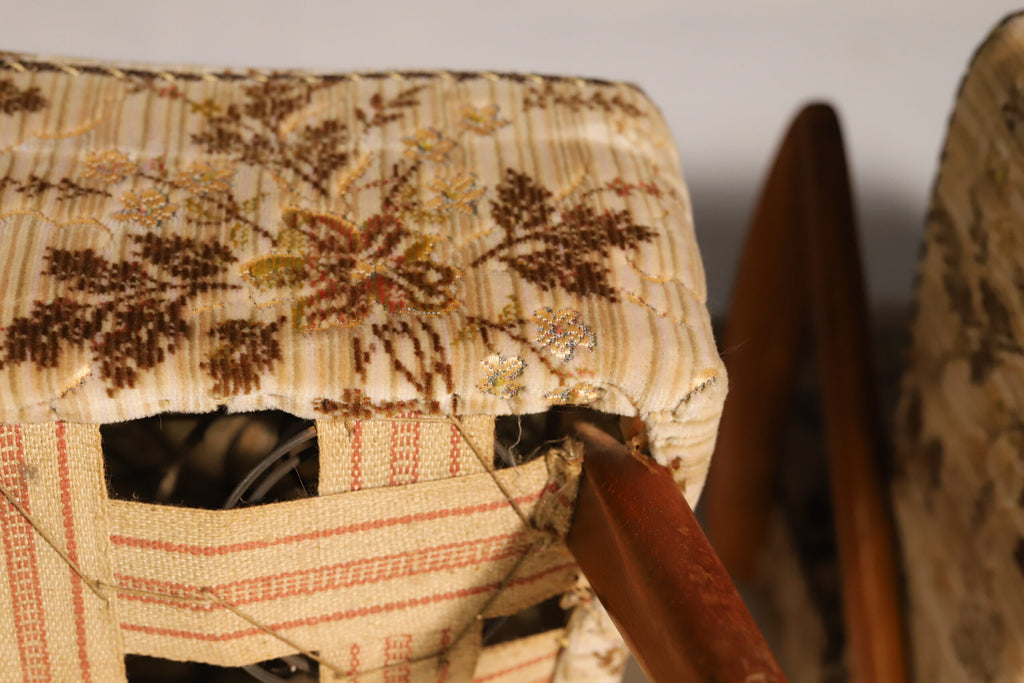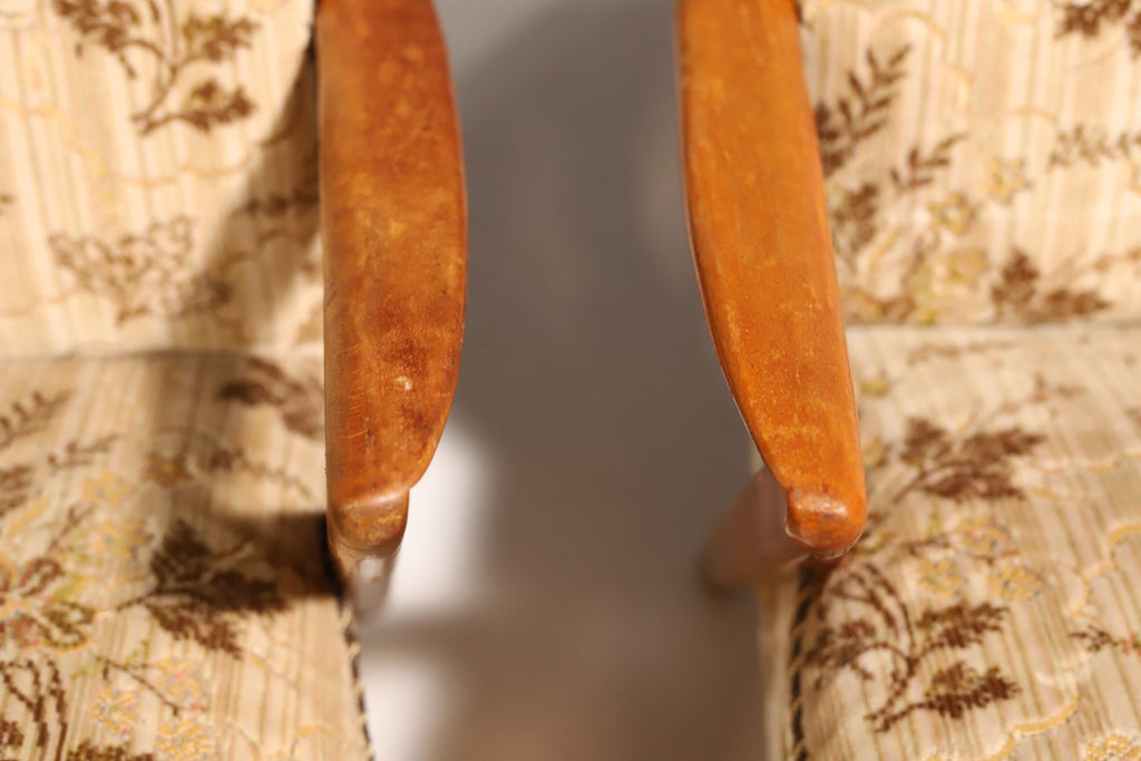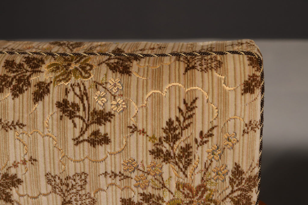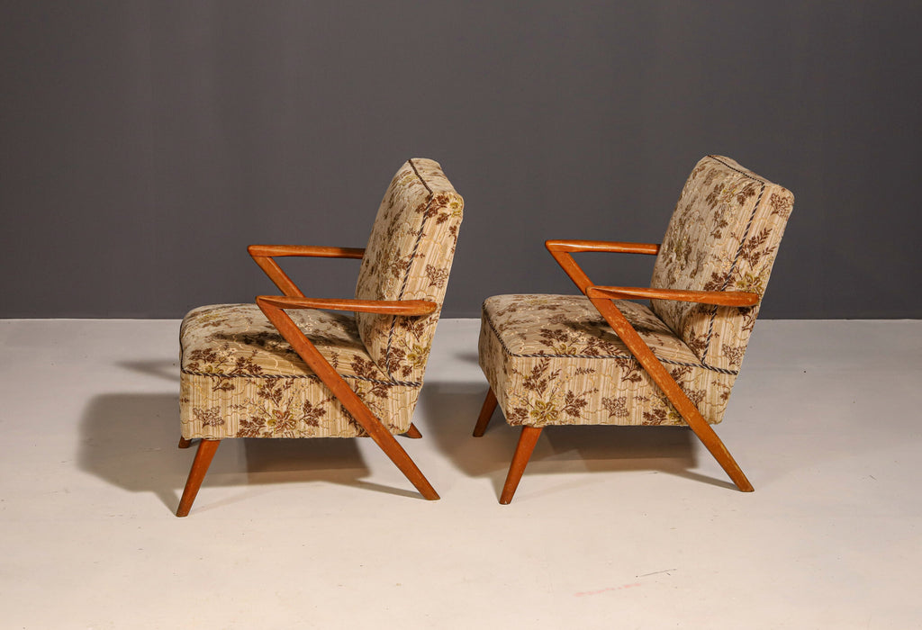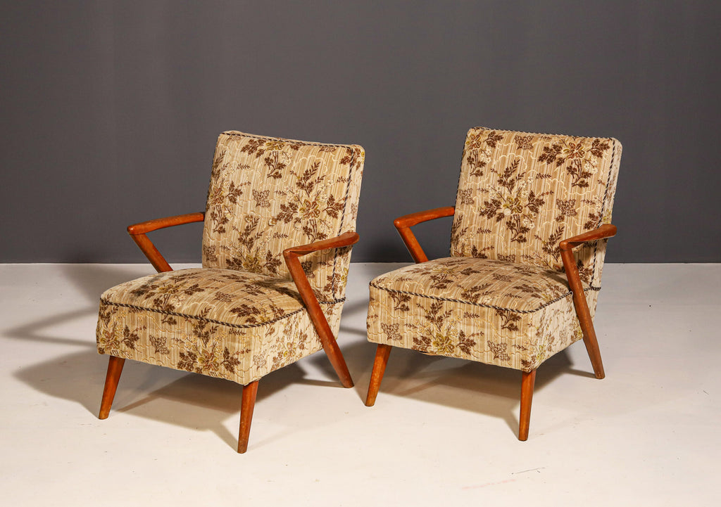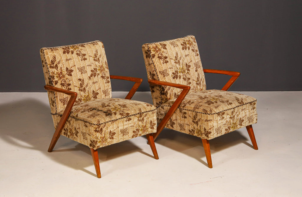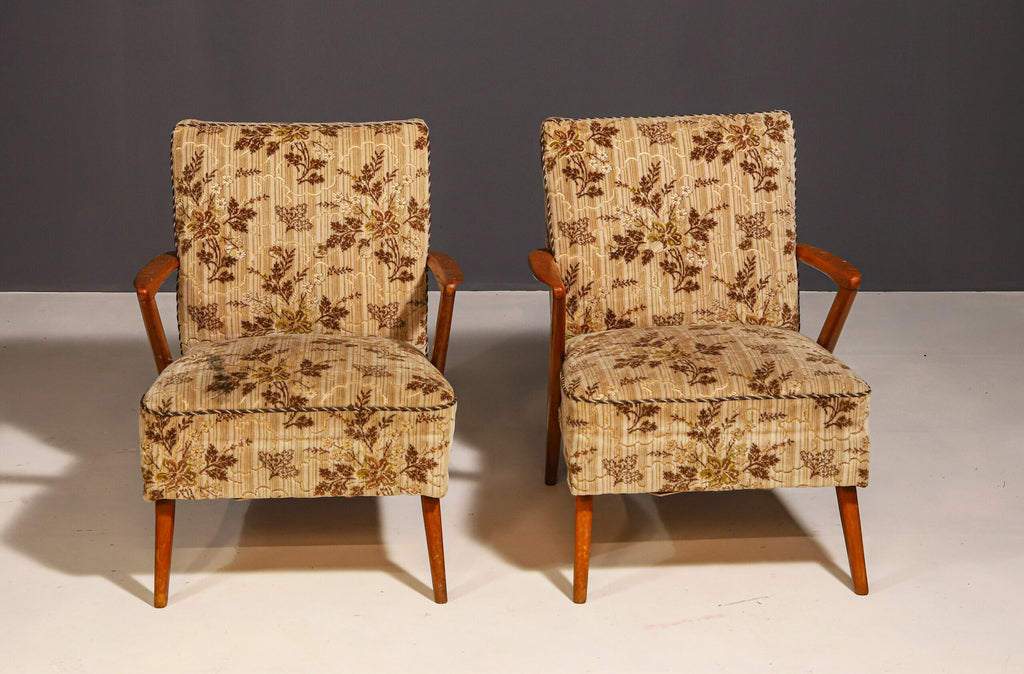 These midcentury armchairs were made in the 1960s in the former Czechoslovakia. Made of beech wood, upholstered in fabric, inside are springs. The chairs are overall in good Vintage condition, shows signs of age and using.