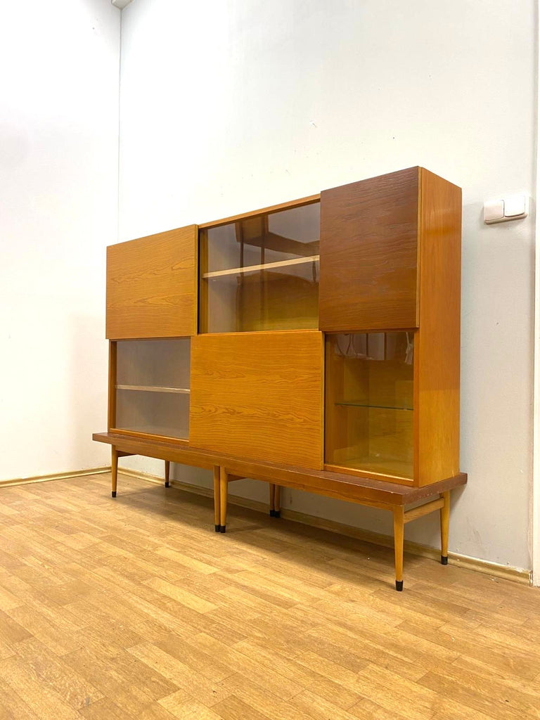A stylish Brussels-era retro cabinet / bookcase produced in Czechoslovakia during the 1960s. This elegant Mid-Century piece features a wooden structure with two-tone veneer, sliding glass panels, wooden sliding doors, internal shelving, and signature tapered legs. Its clean geometric form and warm wood tones make it an iconic example of Czech design.