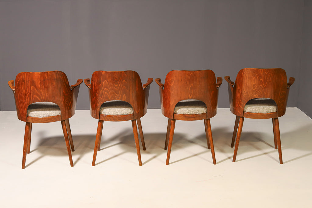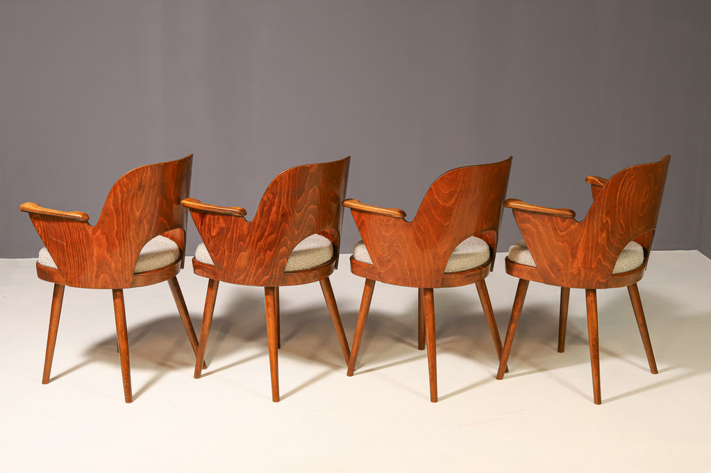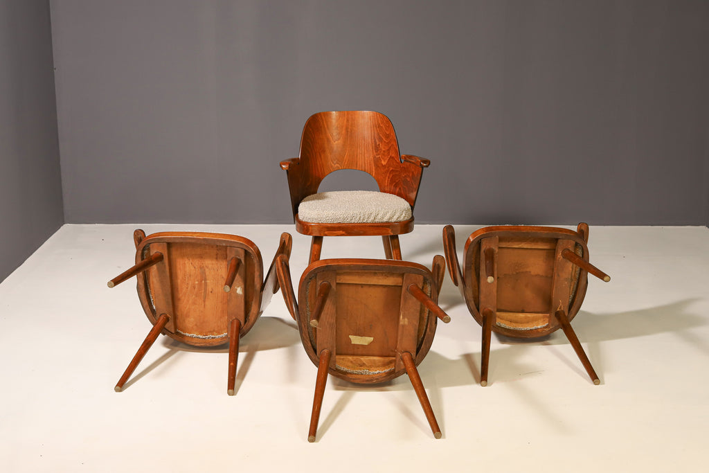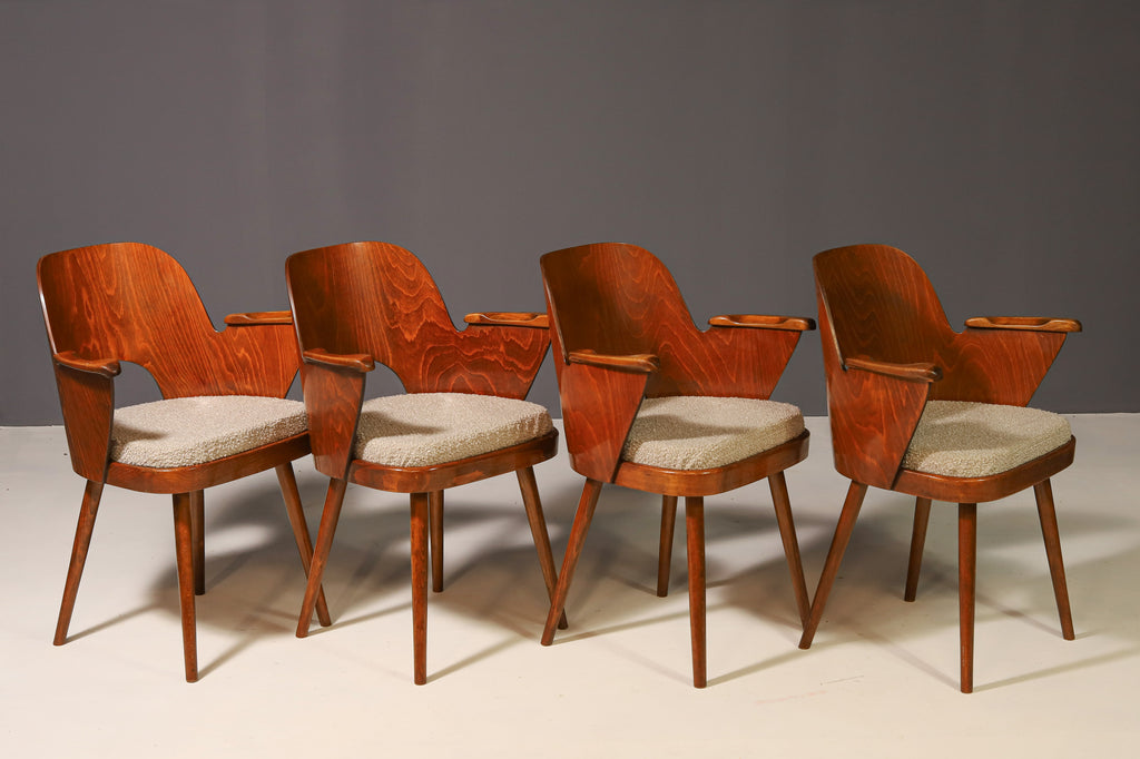 This set of four elegant bent plywood chairs was designed by renowned Austrian architect and designer Oswald Haerdtl, a key figure in mid-century modern furniture design. Manufactured in Czechoslovakia in the 1960s, these chairs are among his most iconic works.