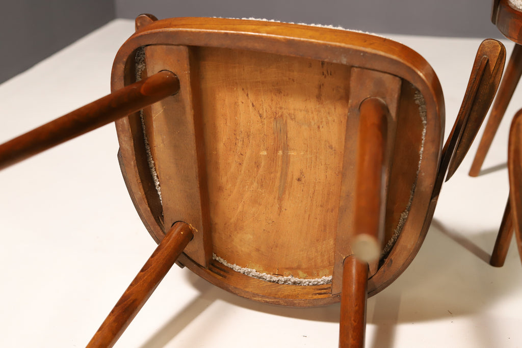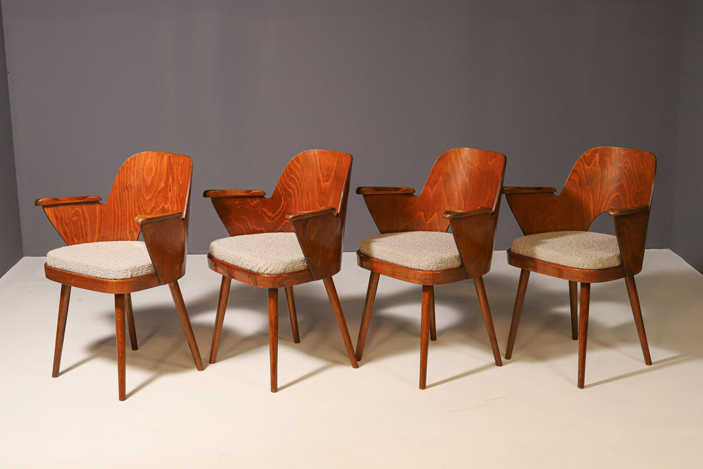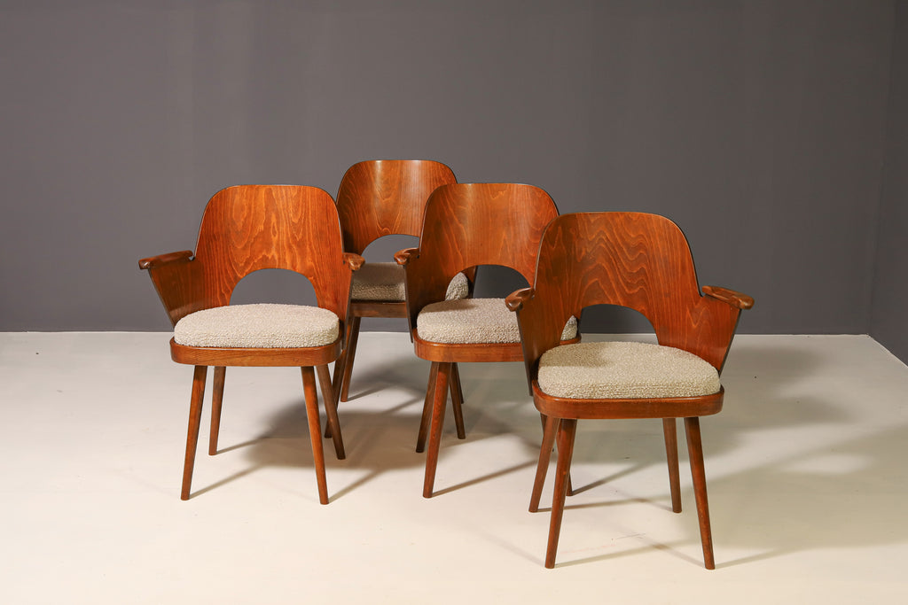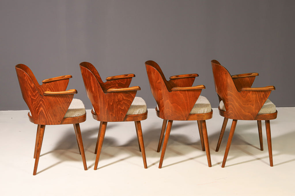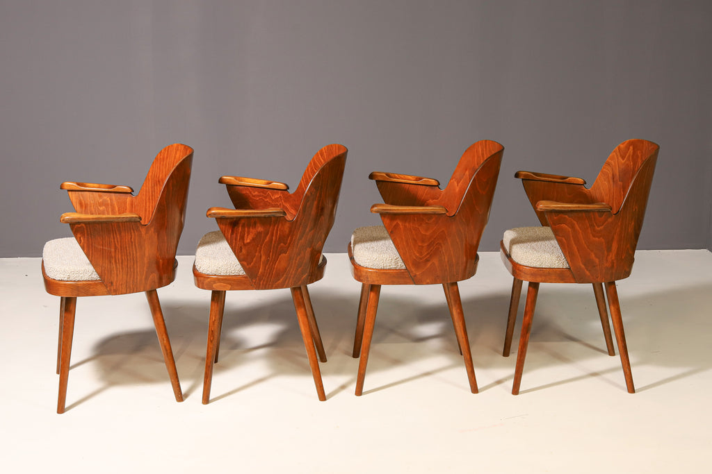 This set of four elegant bent plywood chairs was designed by renowned Austrian architect and designer Oswald Haerdtl, a key figure in mid-century modern furniture design. Manufactured in Czechoslovakia in the 1960s, these chairs are among his most iconic works.