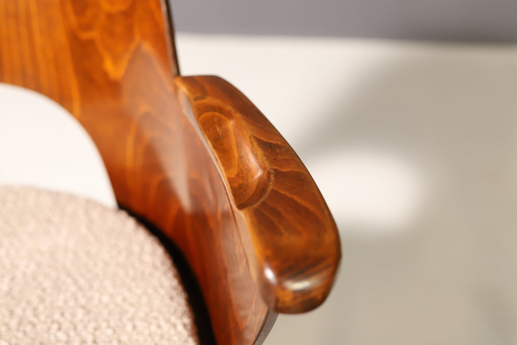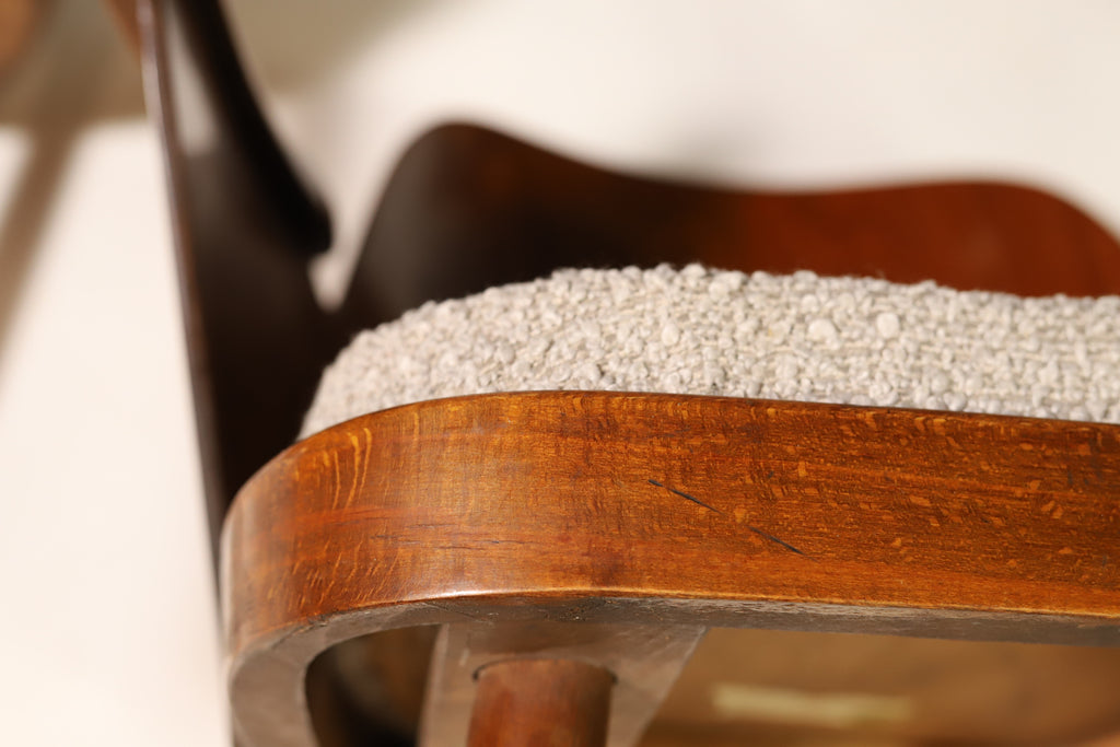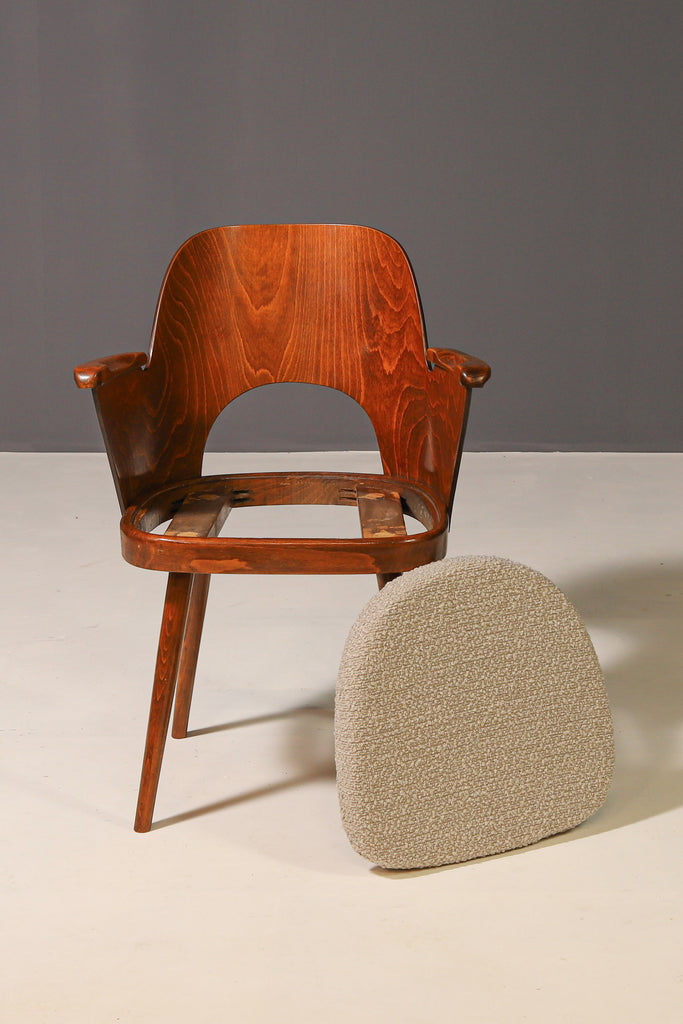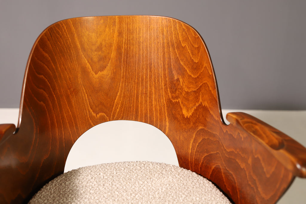 The distinctive organic shape of the seat and armrests showcases Haerdtl's innovative approach to working with bent plywood. The sturdy construction, combined with subtly tapered legs, gives the chairs a sense of lightness and timeless elegance. The comfortable upholstered seat ensures a pleasant seating experience, while the refined wooden craftsmanship highlights the exceptional quality of this design.