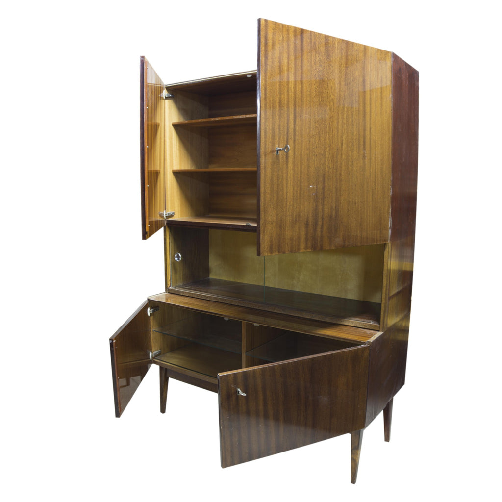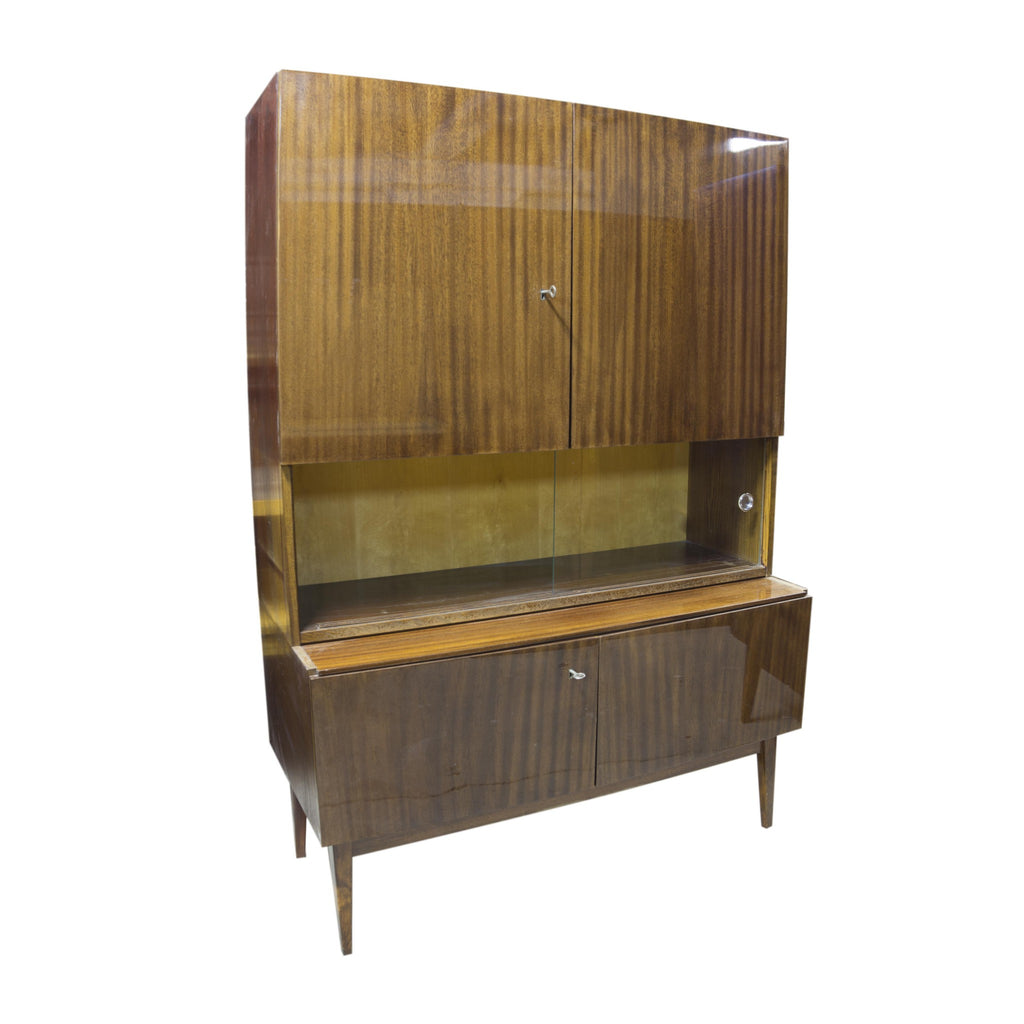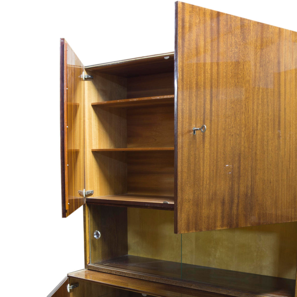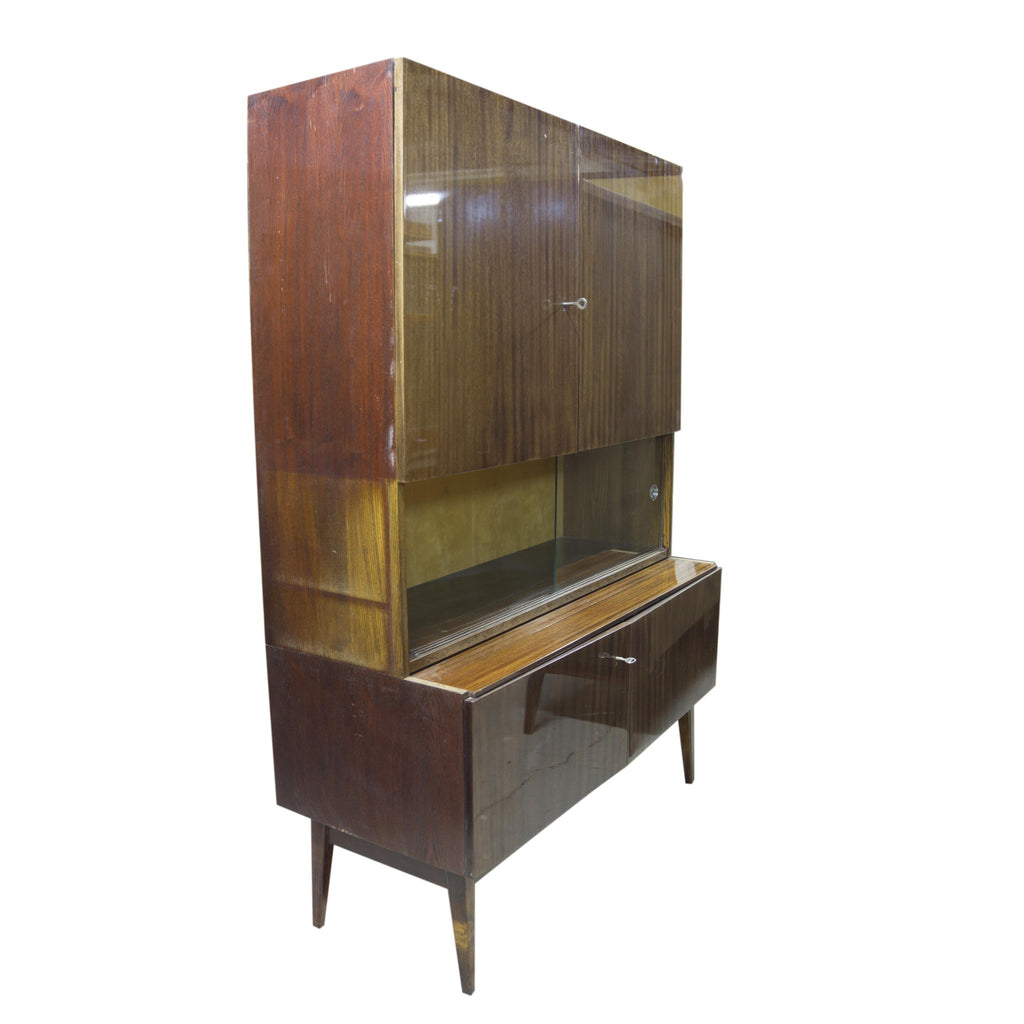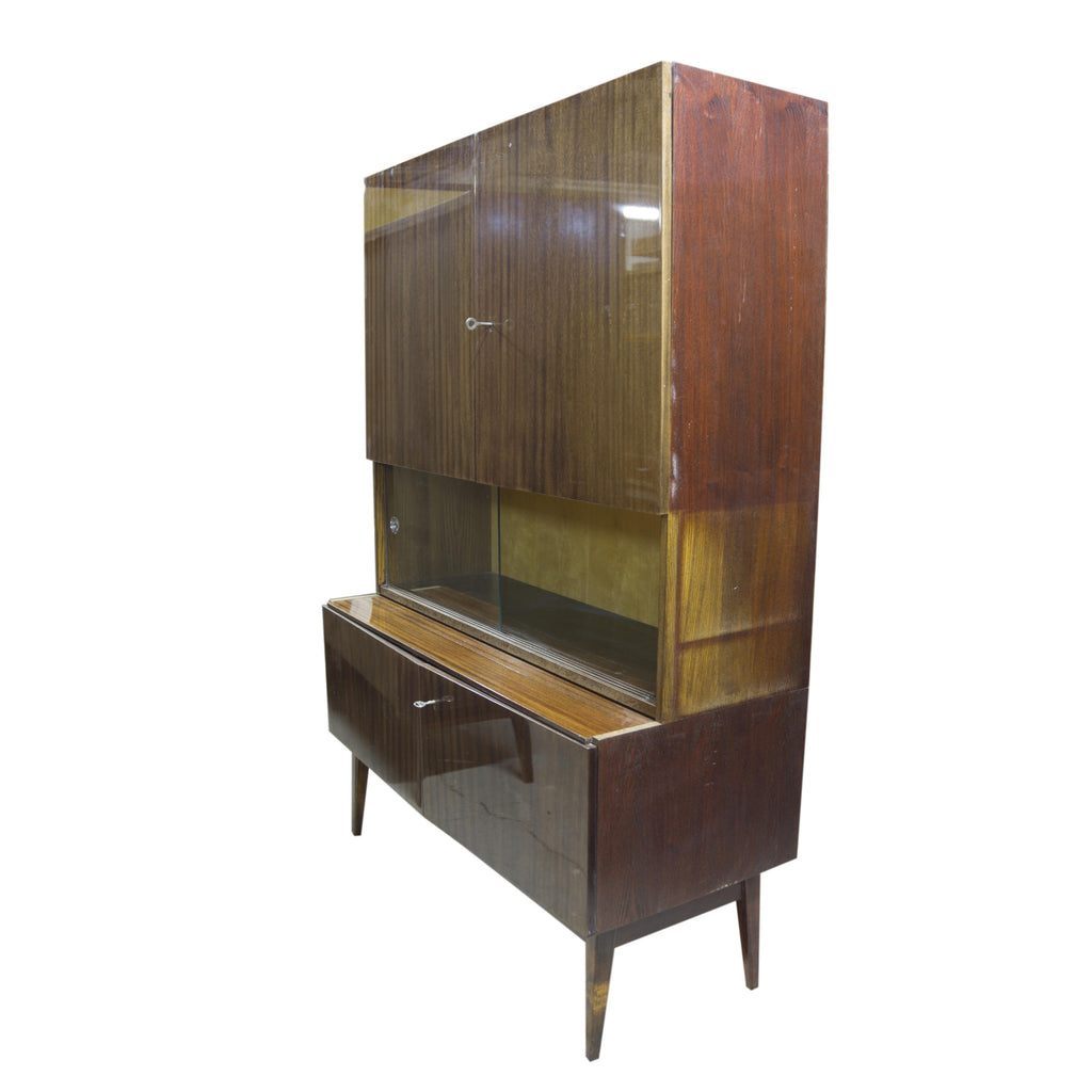 Czechoslovakia, 1970´s. Lovely modern piece of furniture. This piece has two units: main part on the bottom and the top section with two doors. The Middle part consists of a glazed space. The bottom has doors, opening to reveal two glazed adjustable shelves. Polished veneer. Very good condition
