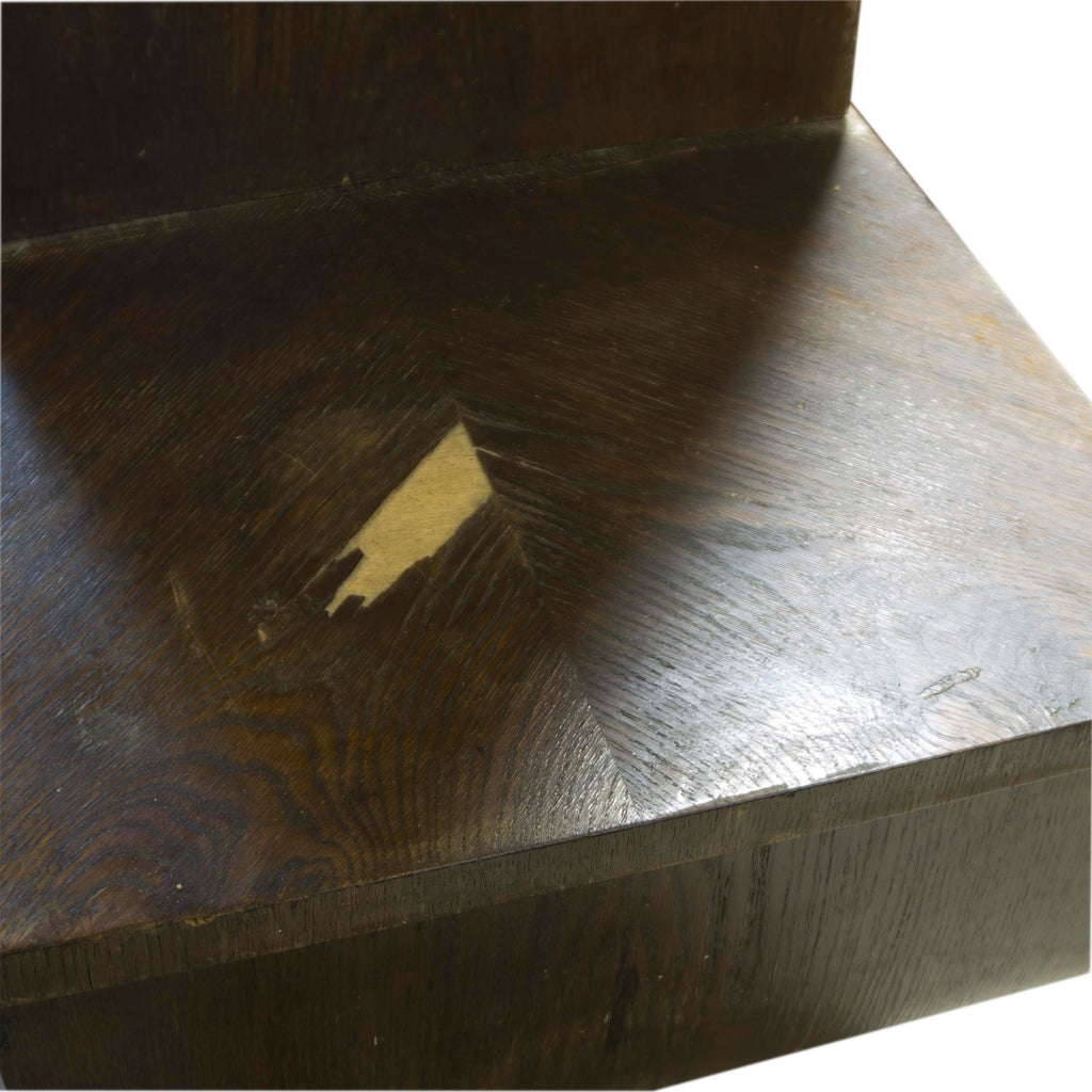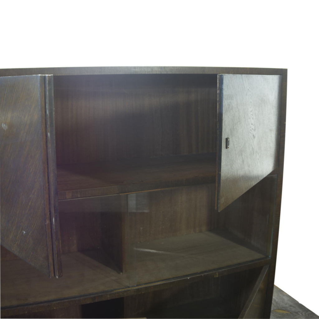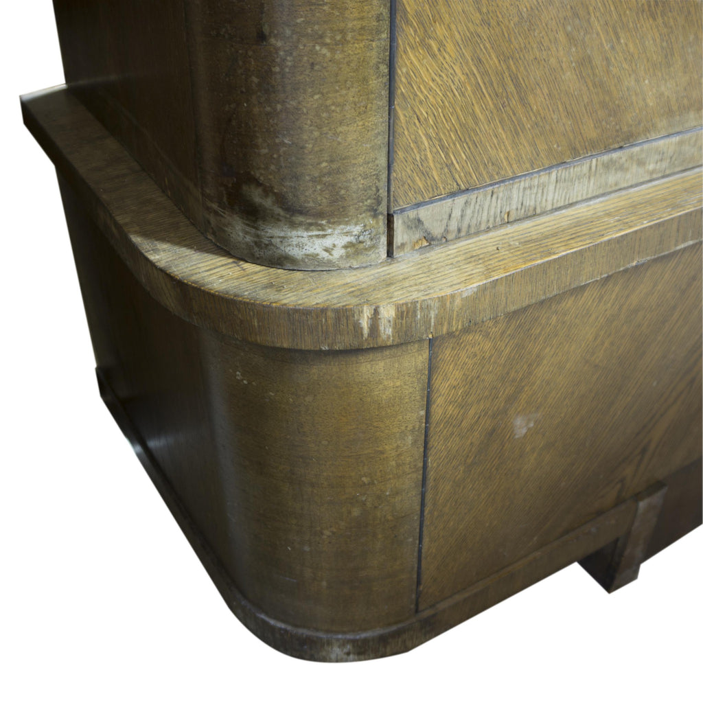 Oak cabinet/bookcase in the shape of a ship. Circa 1930. Attributed to Jindřich Halabala. Material oak veneer. Glazed upper section. Surface damage in a few places. Very interesting model. This piece of furniture belongs to a living room set the other pieces of which can be found on our website. (Scroll over images to zoom and inspect)