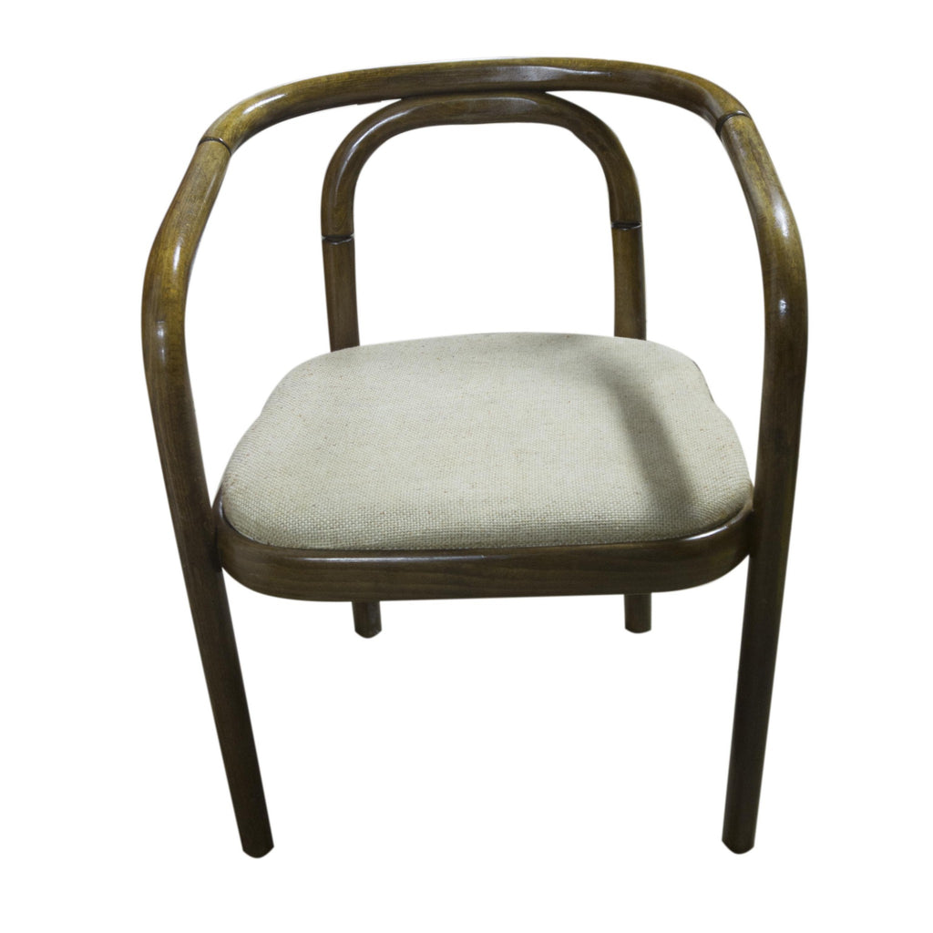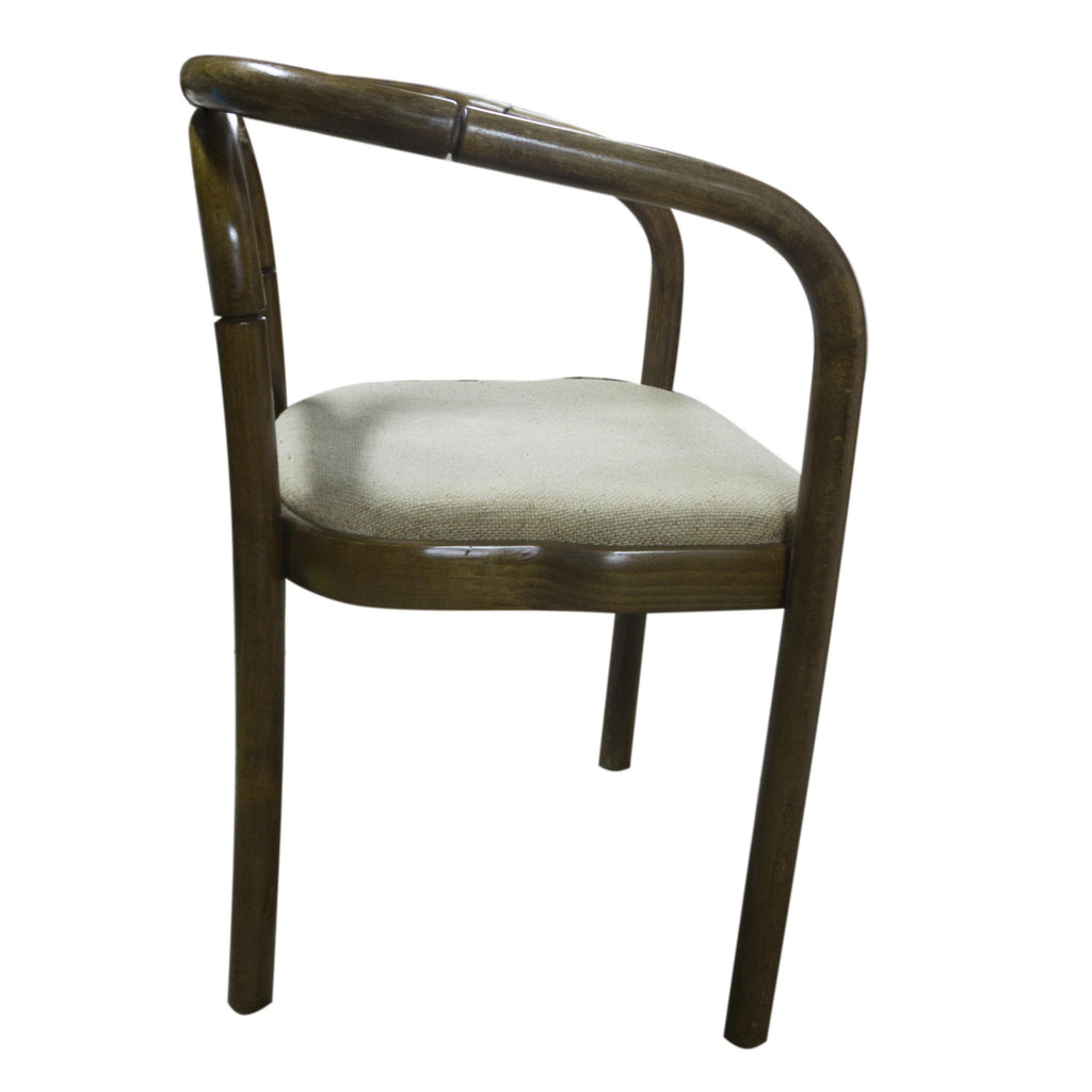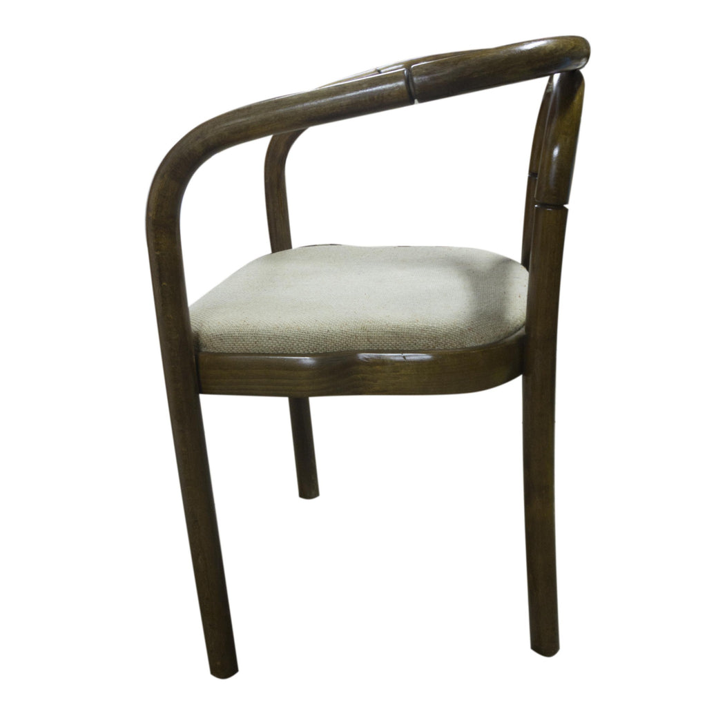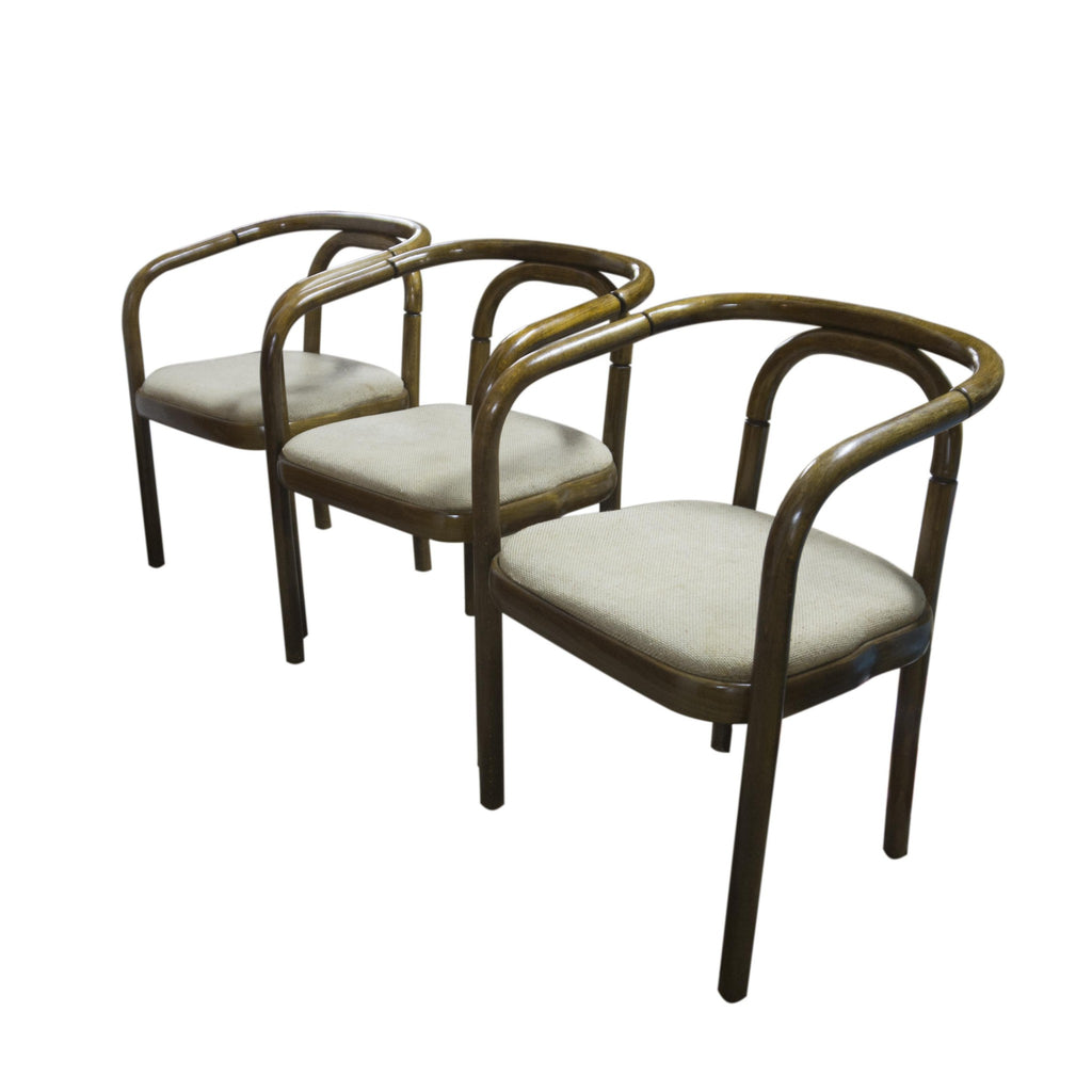 Three upholstered bent wood chairs by TON, designed by Tomás Macek in 1969 for TON Bystřice pod Hostýnem. It was made in Czechoslovakia. Good structural condition, polished veneer, upholstery in good condition. Price is for the complet.